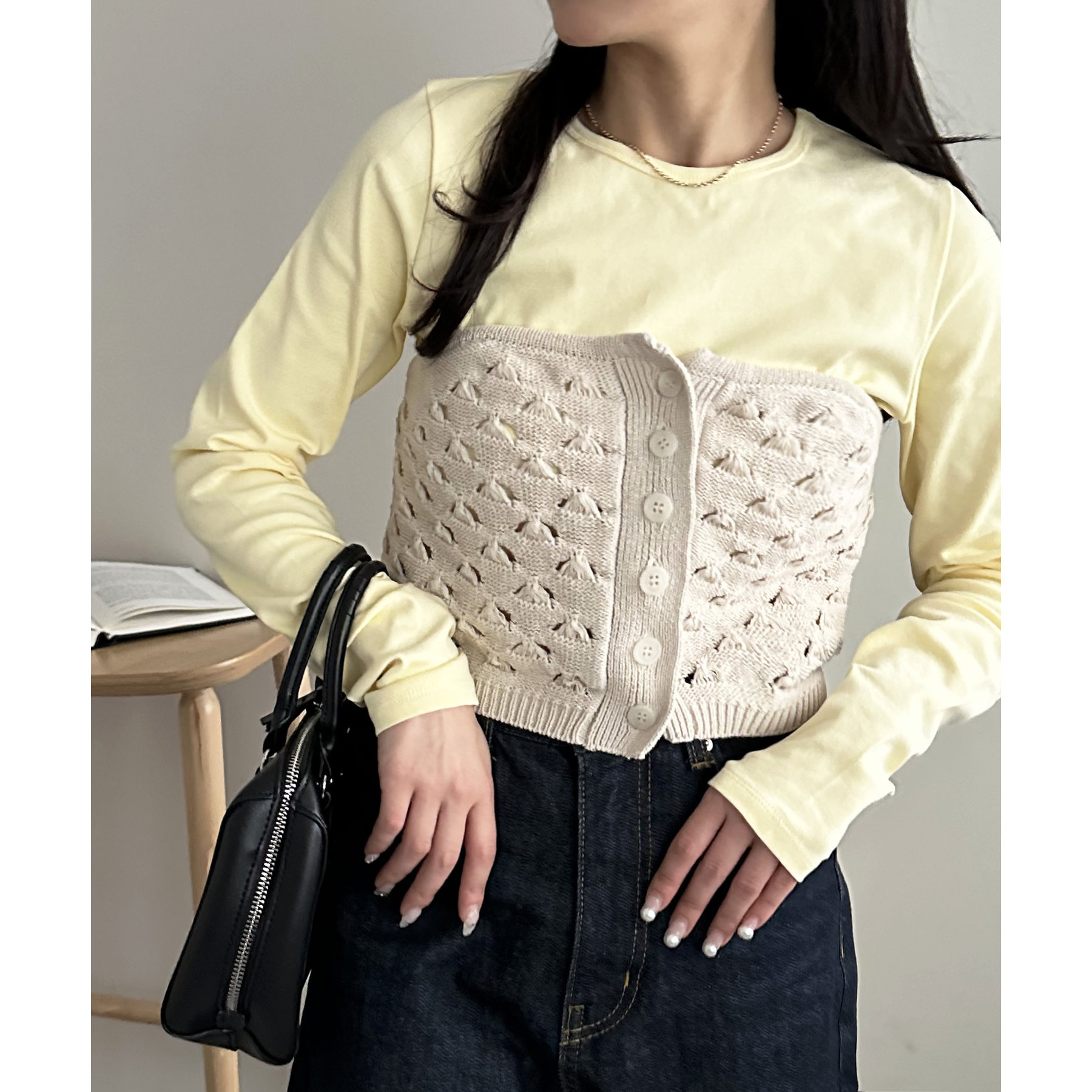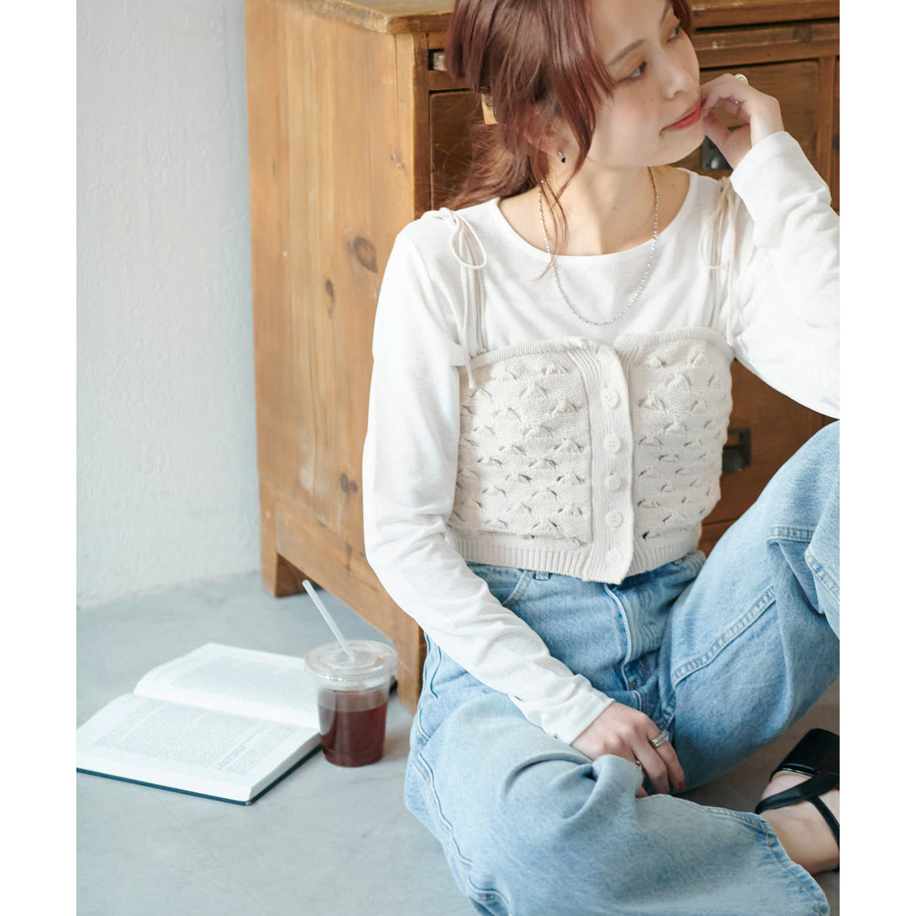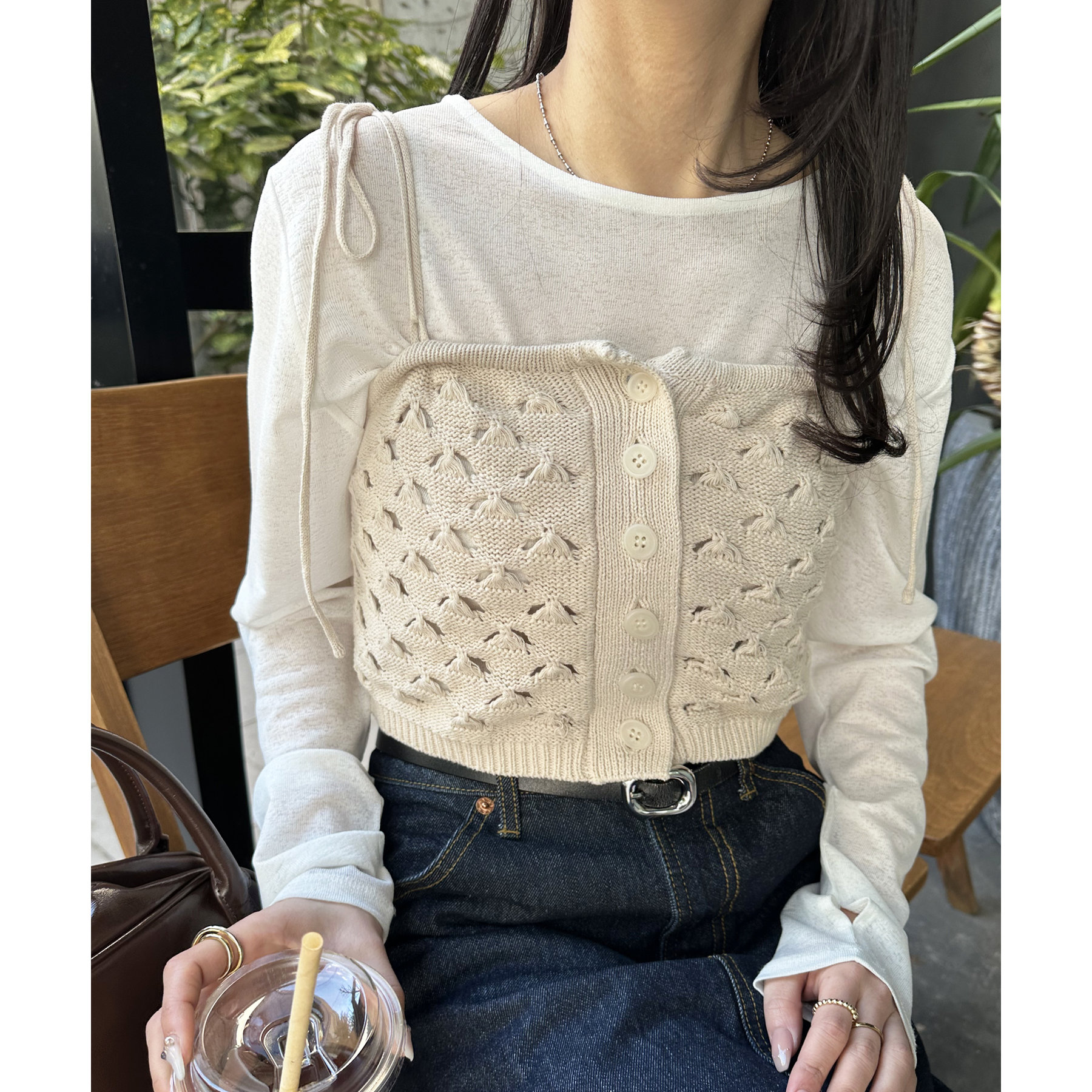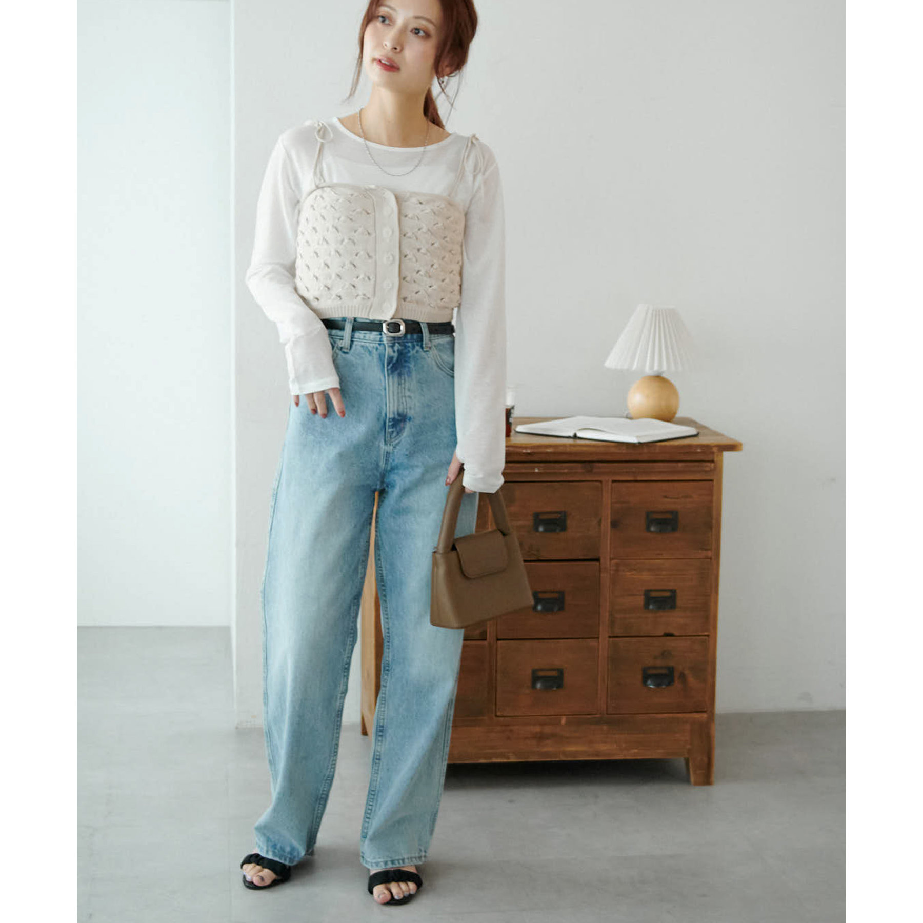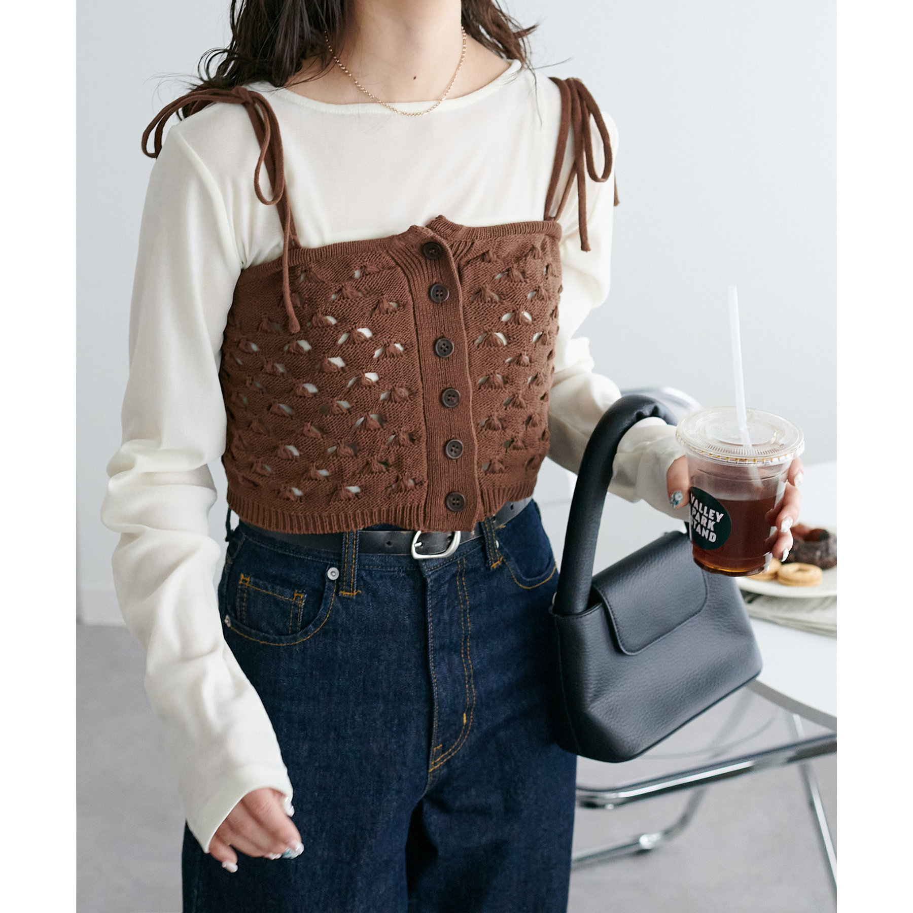 コーデのポイントになるスカシビスチェはコンパクトな着丈なので、スッキリとした印象をプラスします◎