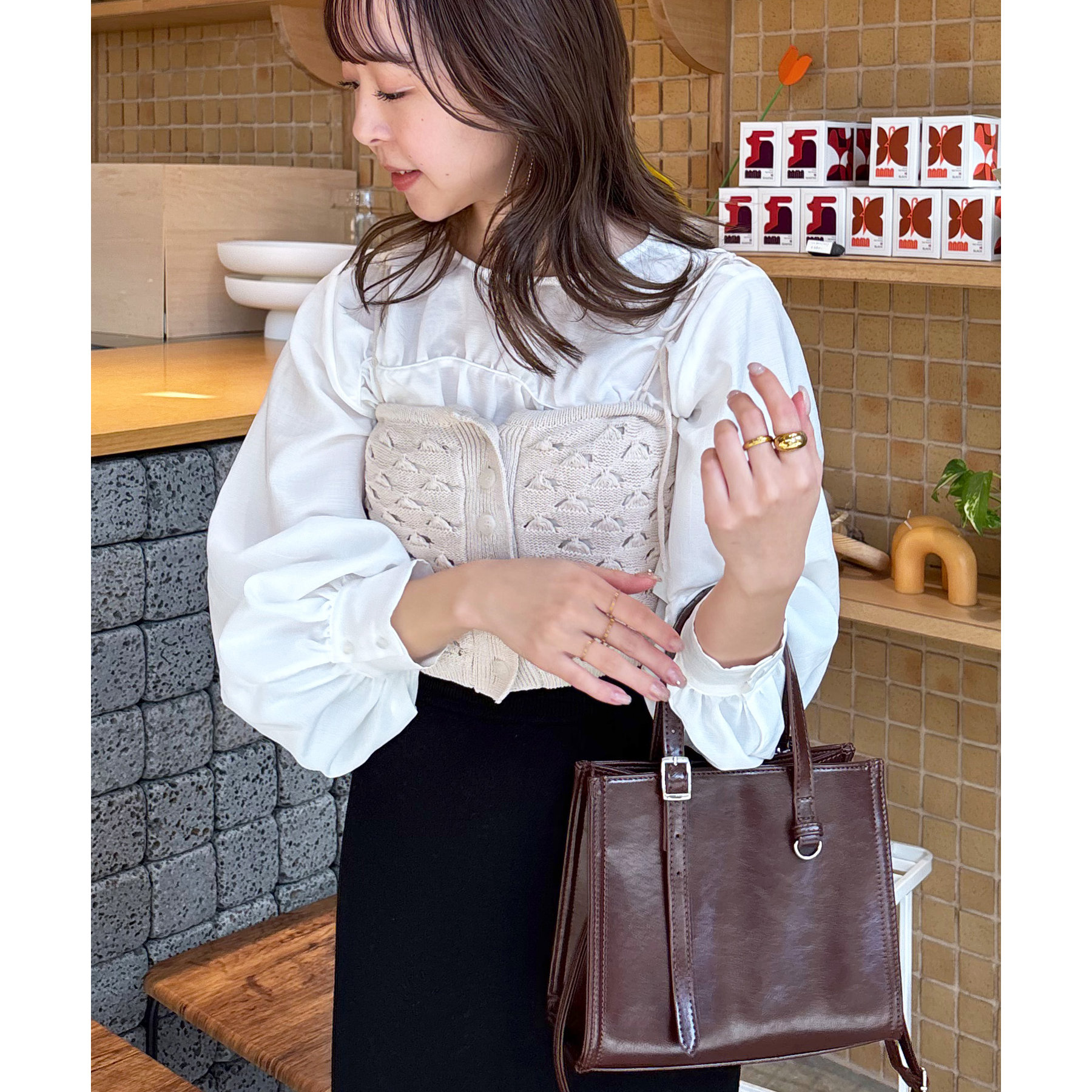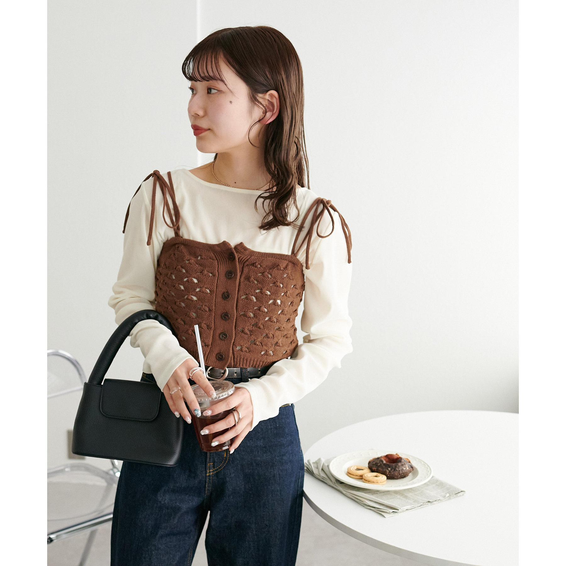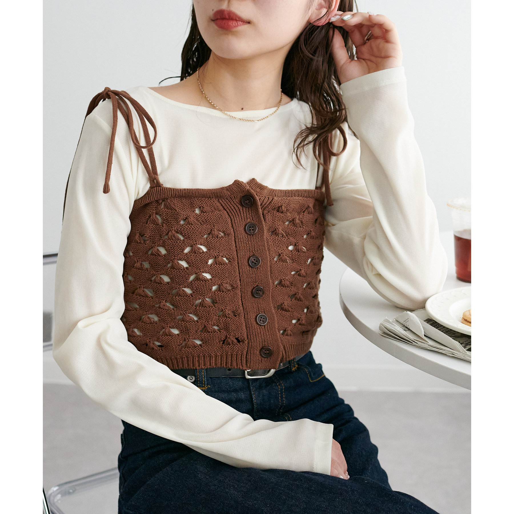158cmスタッフ:ビスチェといえば肩紐がくっついているアイテムが多かったですが、こちらは取り外すことができるので幅広いアイテムとの合わせが楽しめます◎