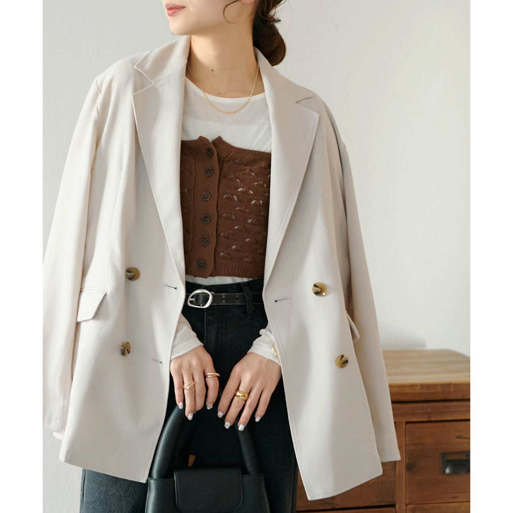 ボタンも開け具合を調節すると抜け感がアップします。