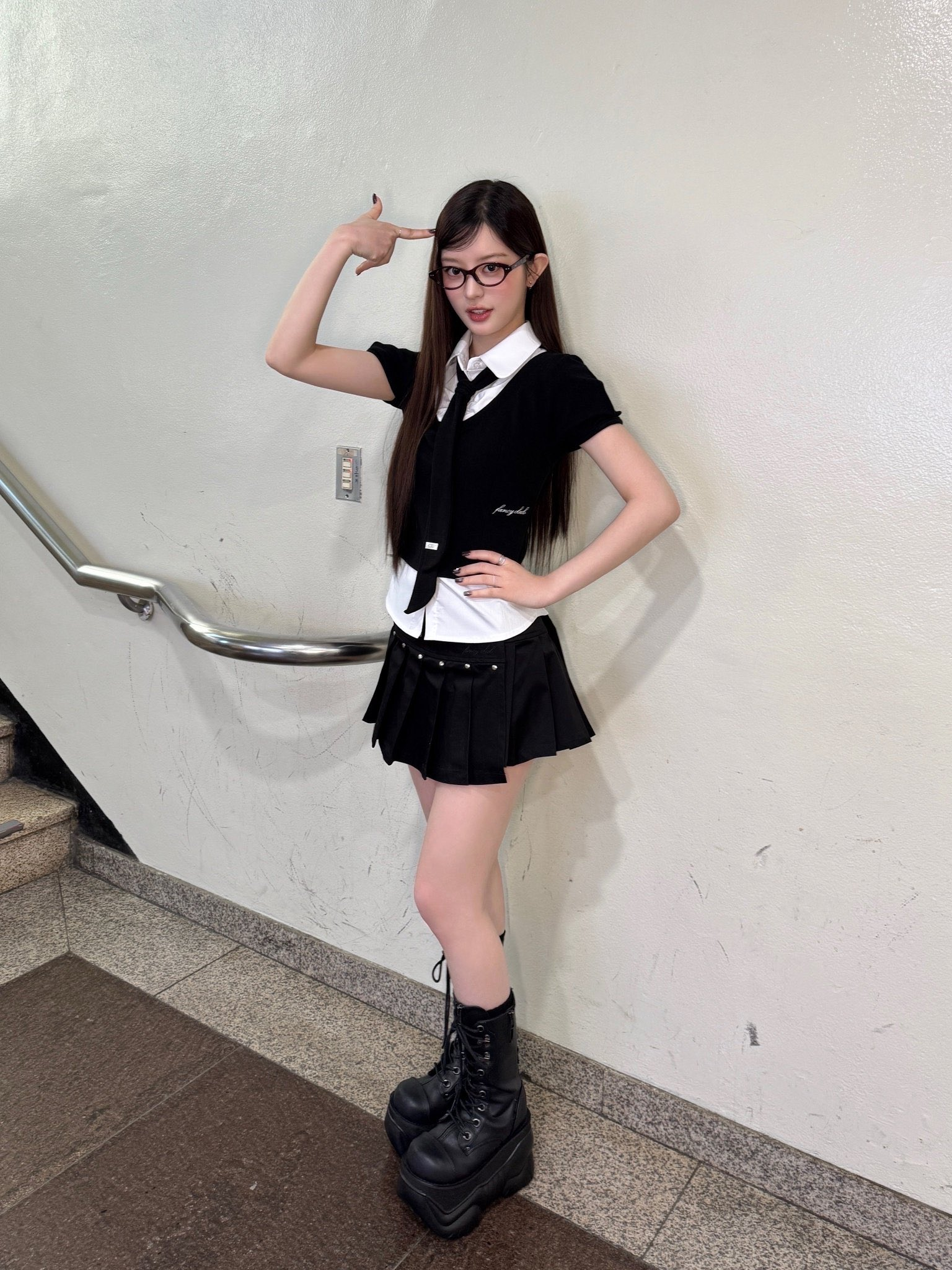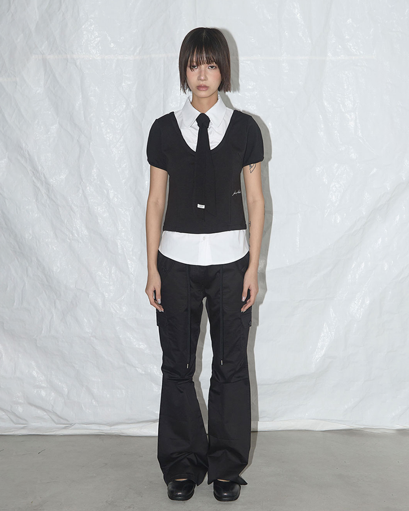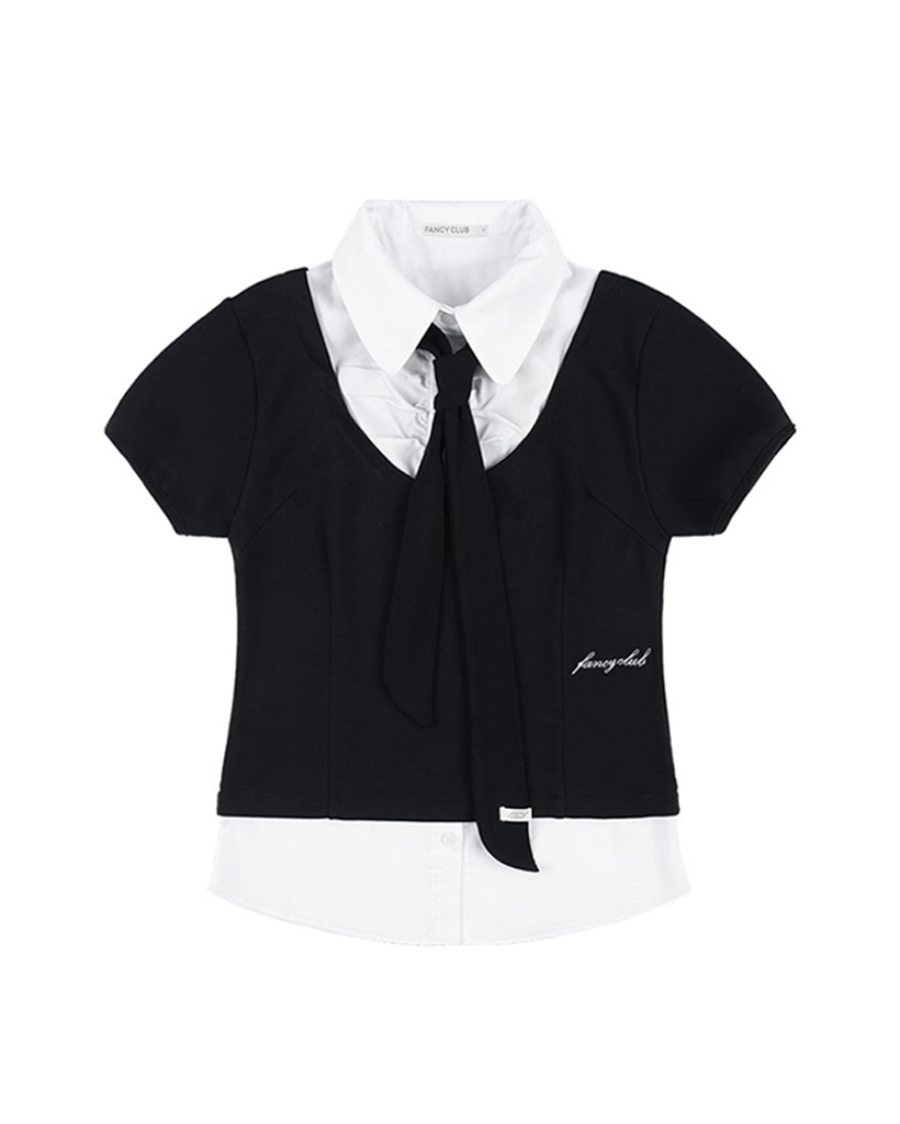 [K-POPアイドル着用] Preppy Ribbon Tie Shirt (Black) F25QB086