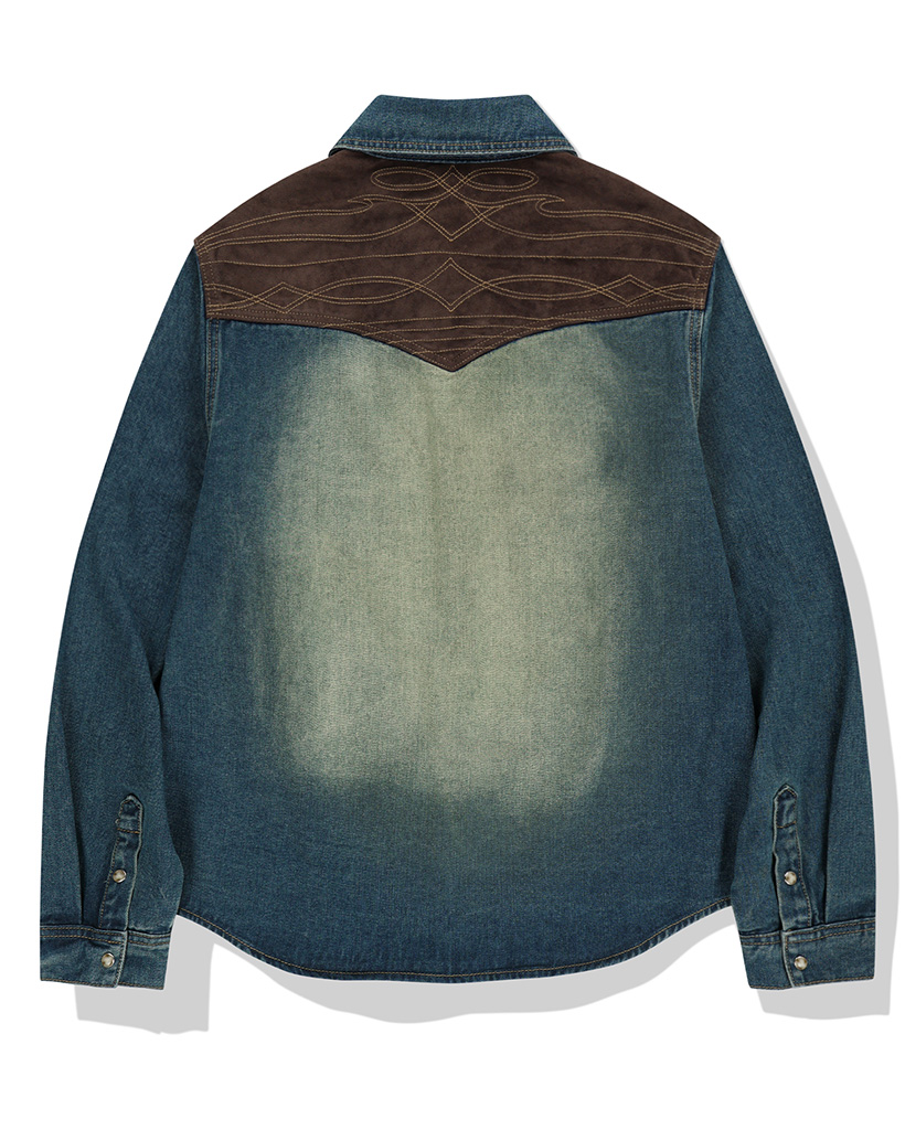Paneled Suede Western Denim Shirt - Deep Blue