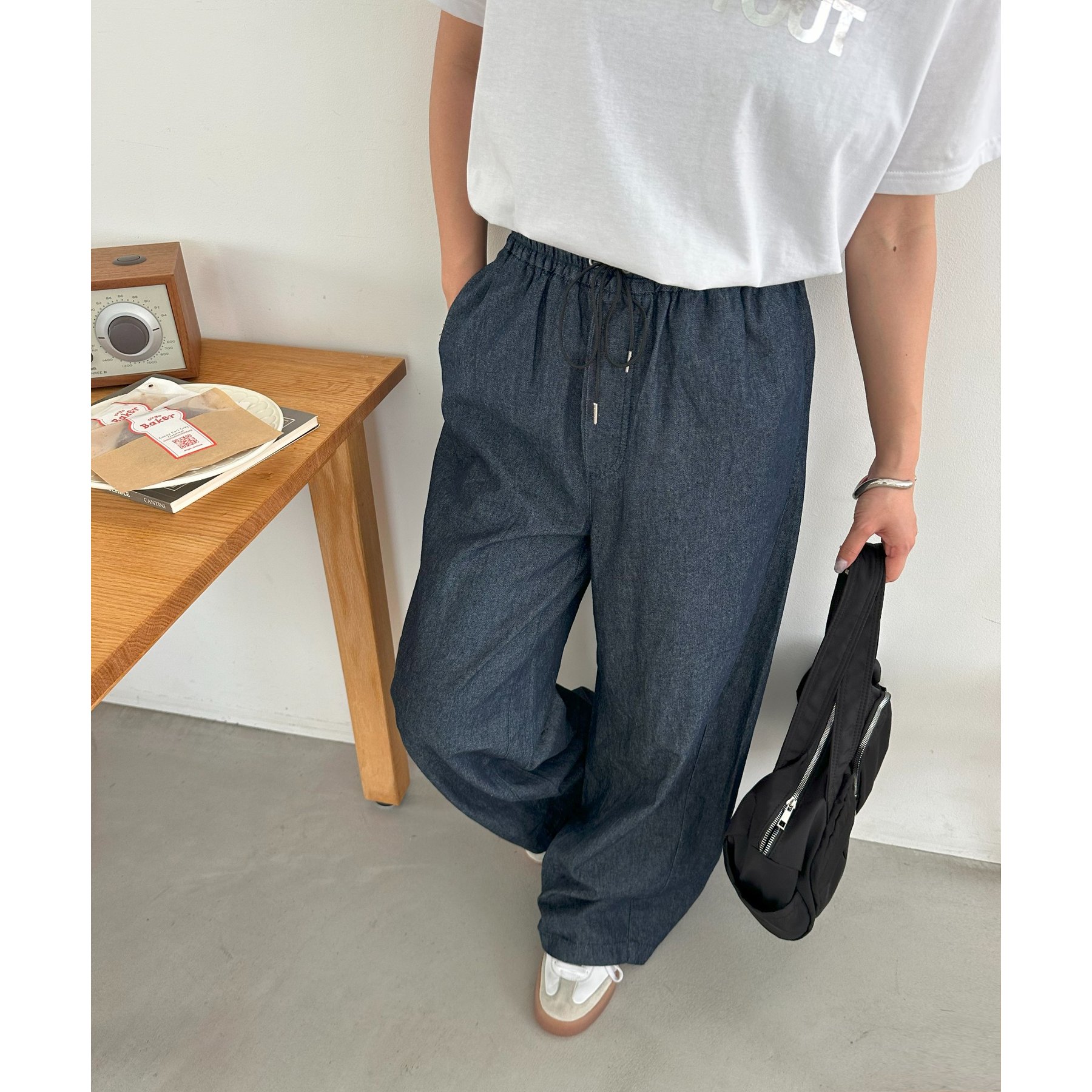 158cmスタッフ(Mサイズ着用):ウエストは総ゴム仕様で窮屈感なくノンストレス!ボディラインを拾わないゆったりとしたワイドシルエットで、体型カバーも◎