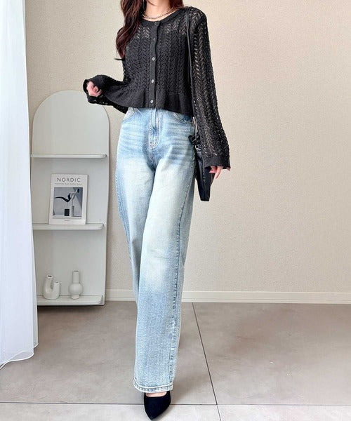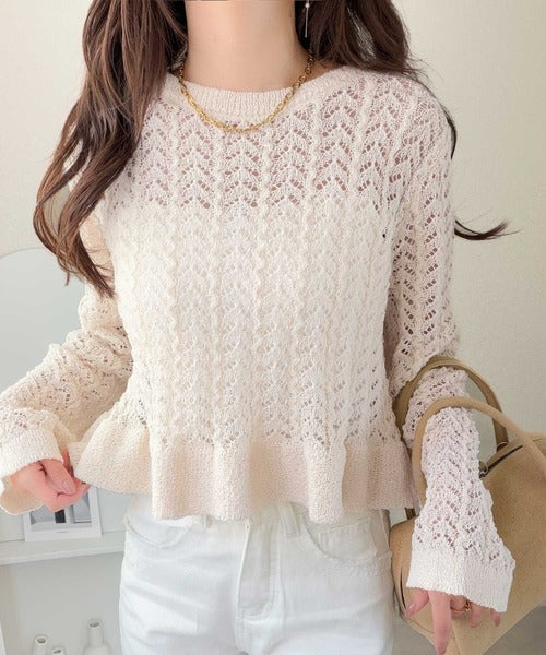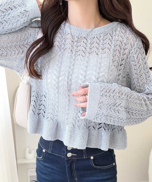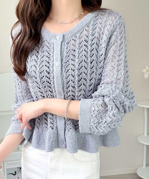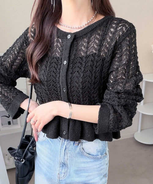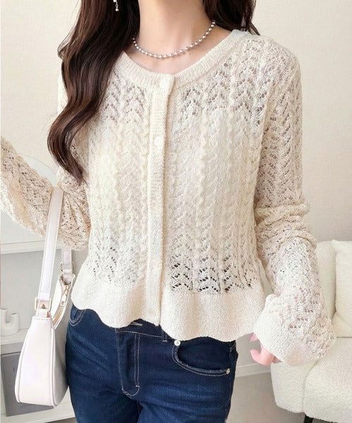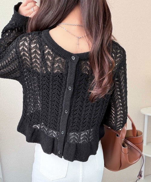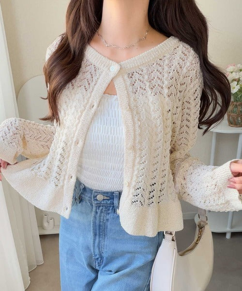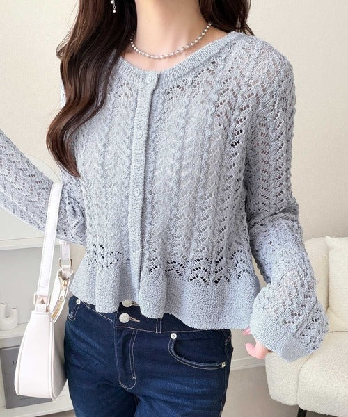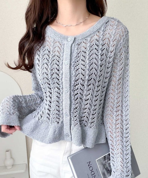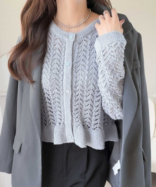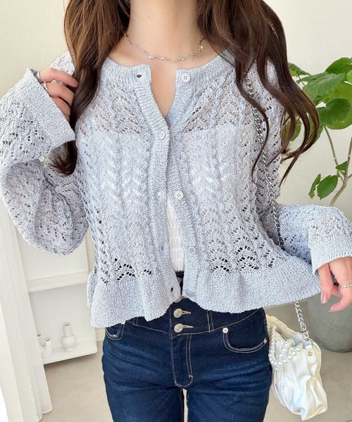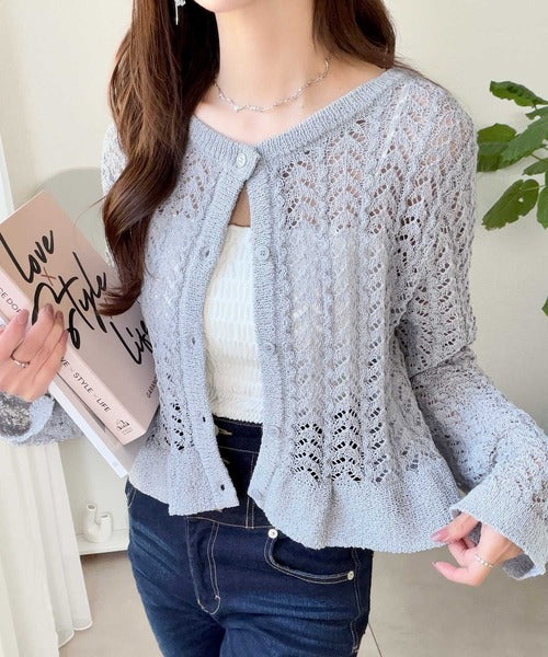 軽やかな透かし編みが印象的なフリルカーディガン。