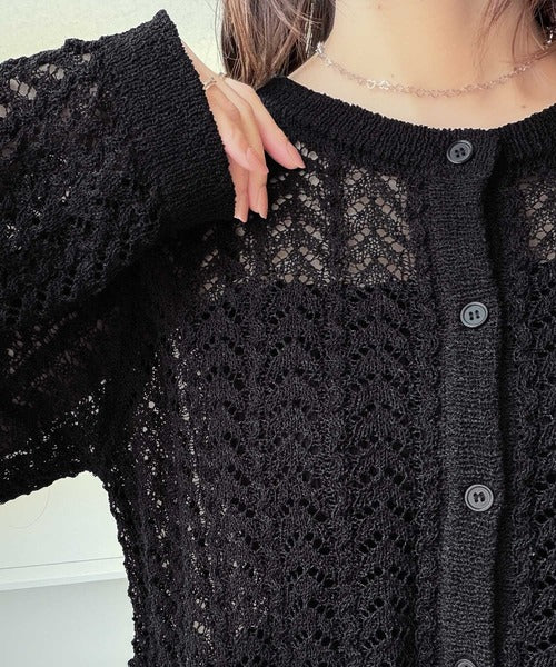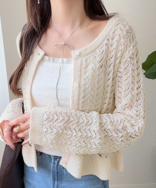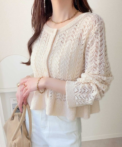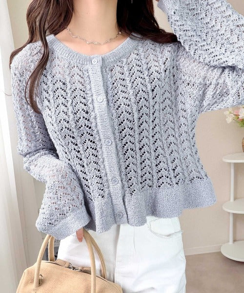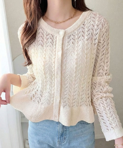 繊細な透かし編みとフリルデザインがやさしい雰囲気を演出するニットカーデ。