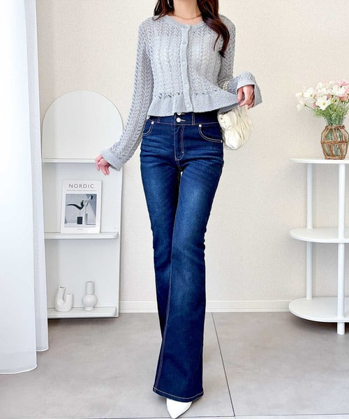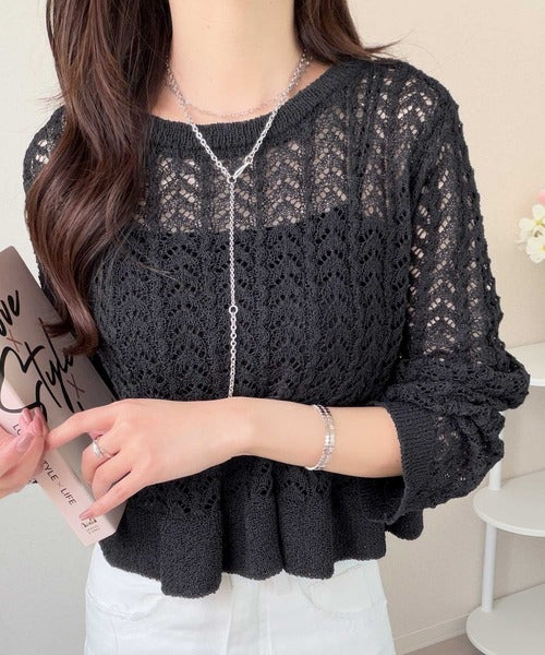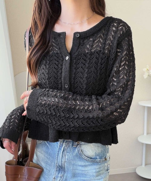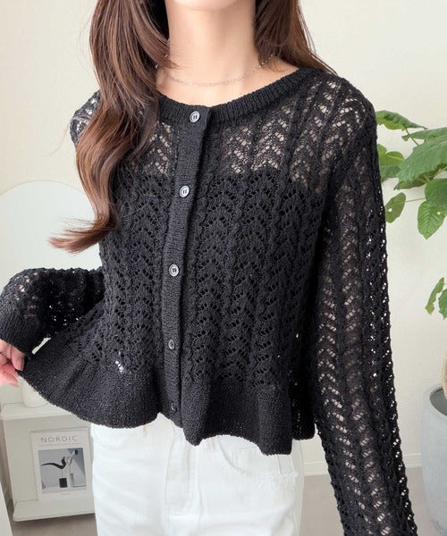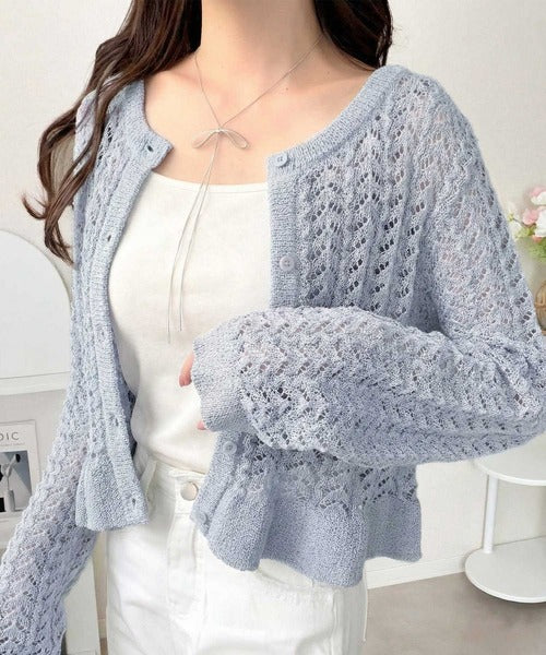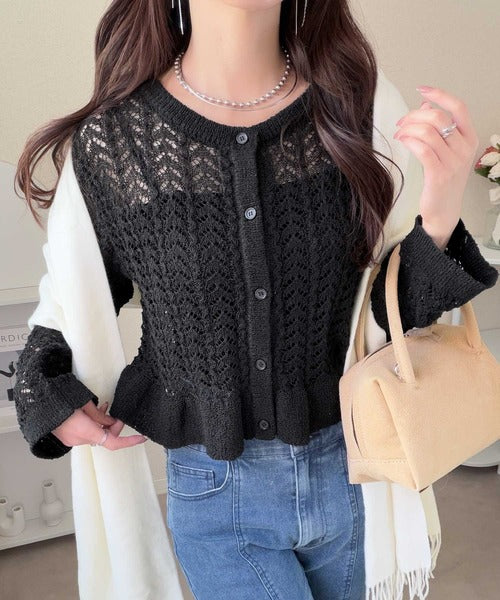 【mily bilet】ペプラムシルエットで軽やかにスタイルアップ♪前後2way透かし編みフリルカーディガン mi1029179