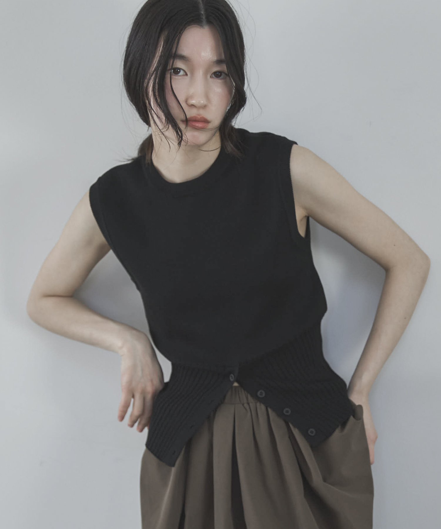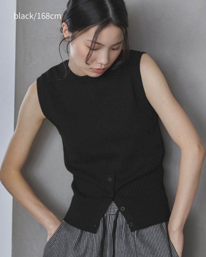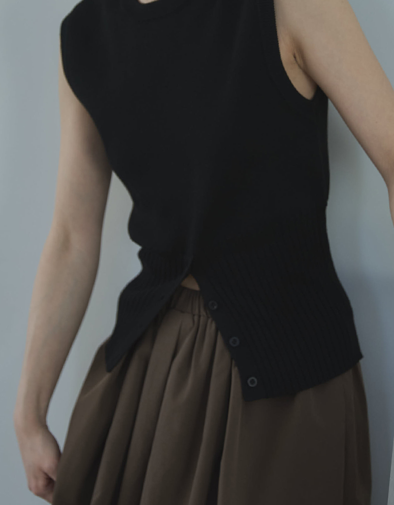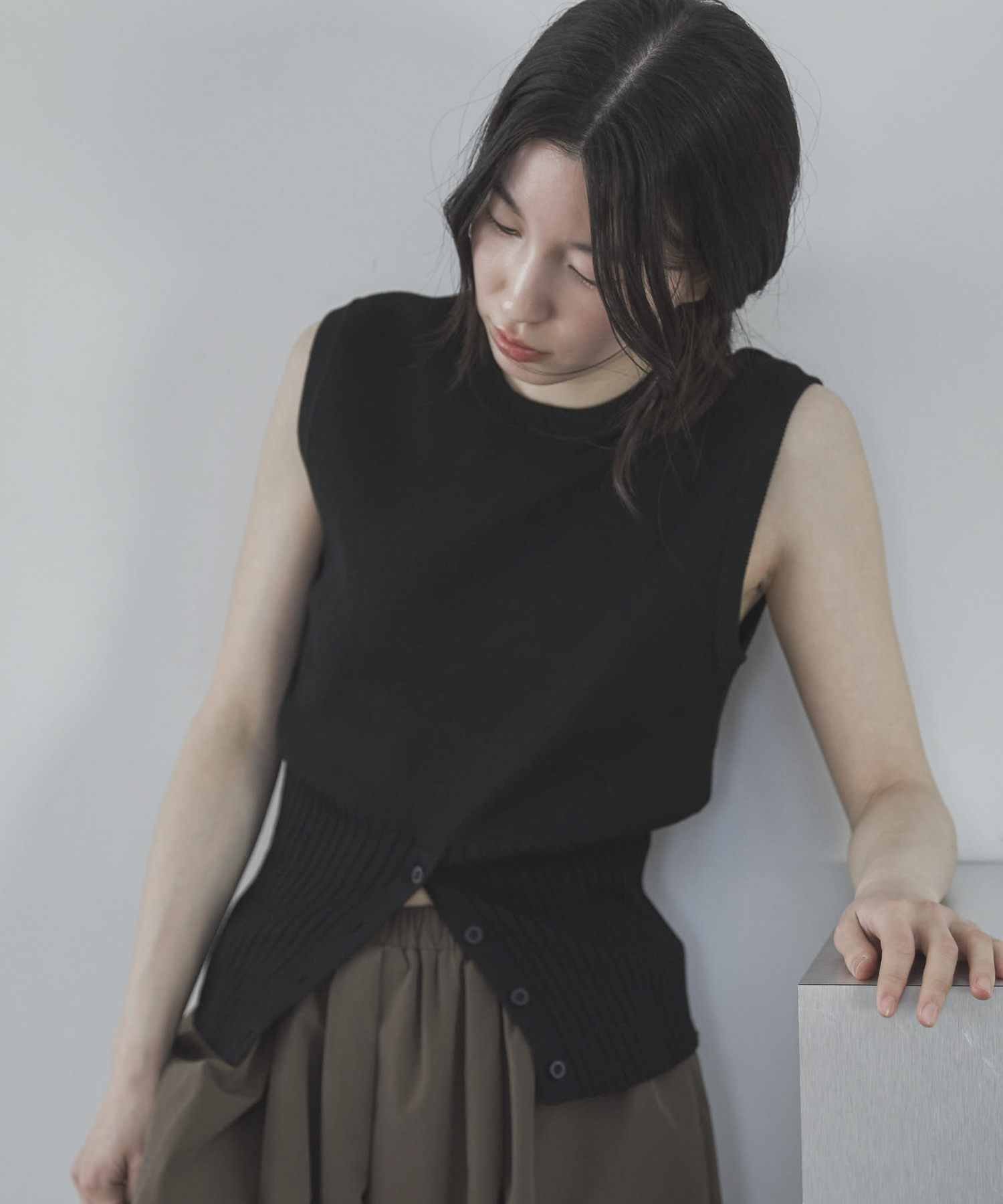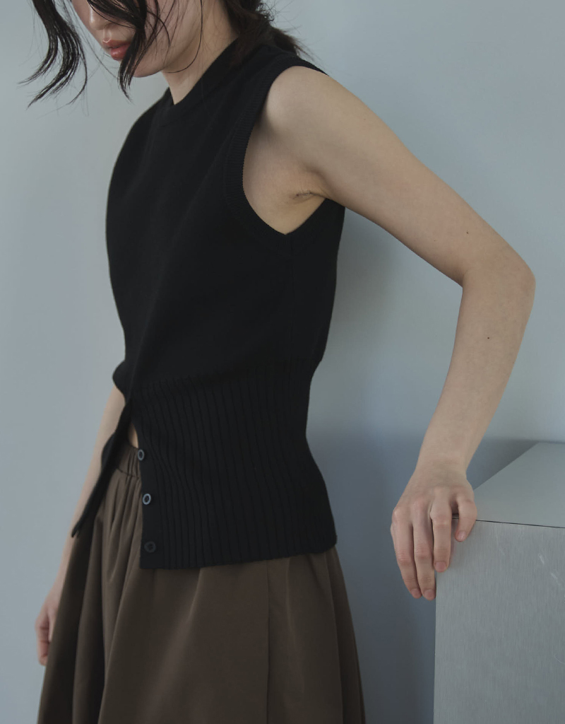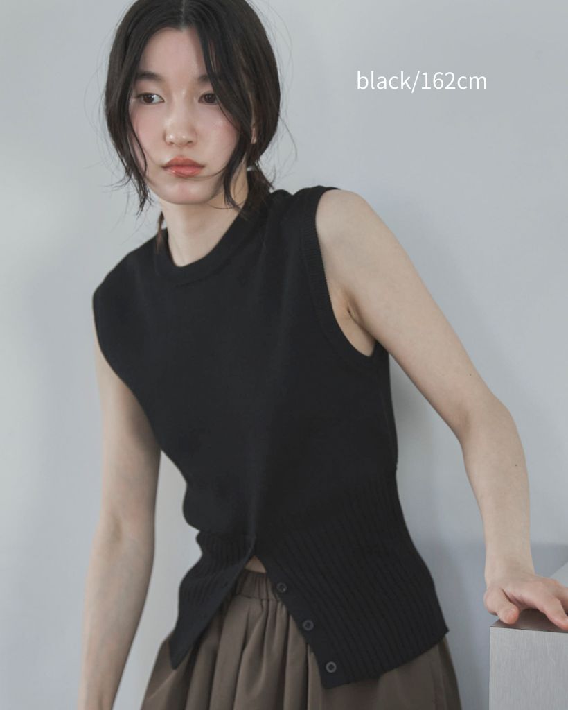 裾のボタンディティールで抜け感のある雰囲気を演出できるノースリーブニット。