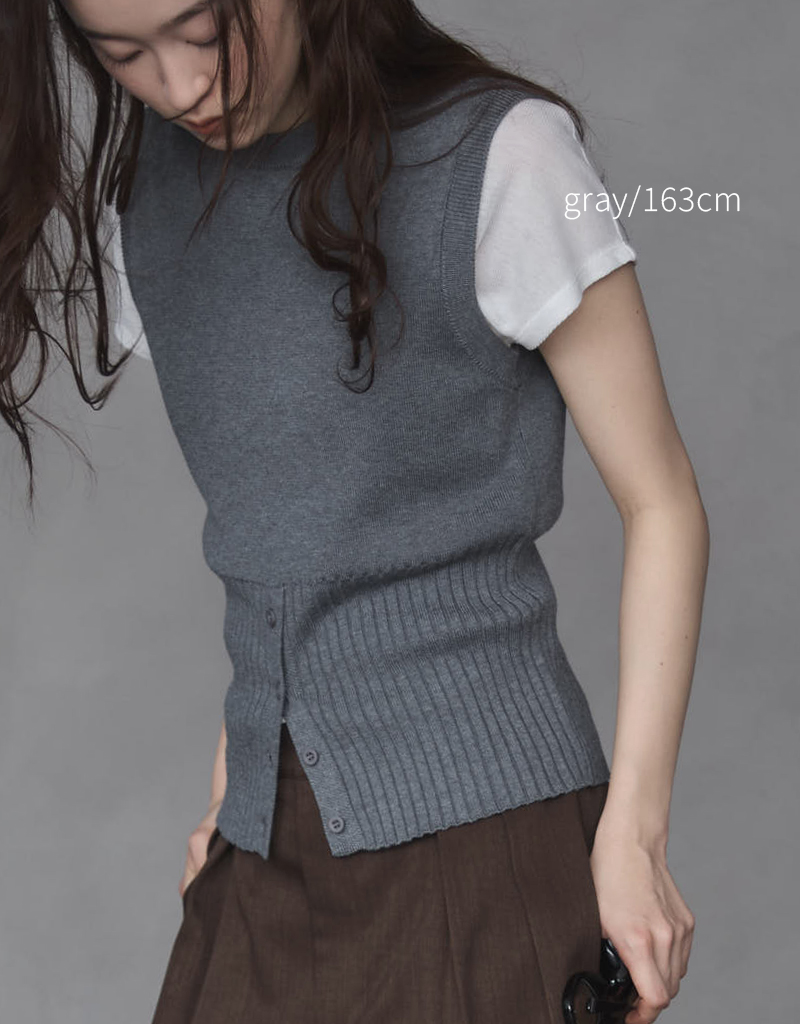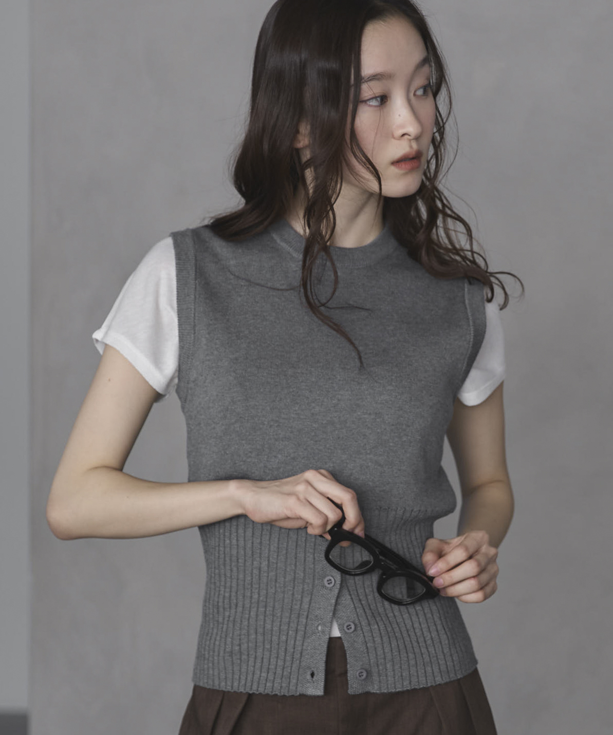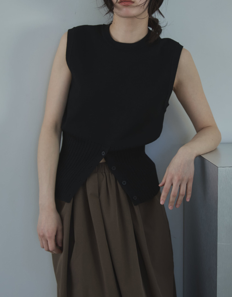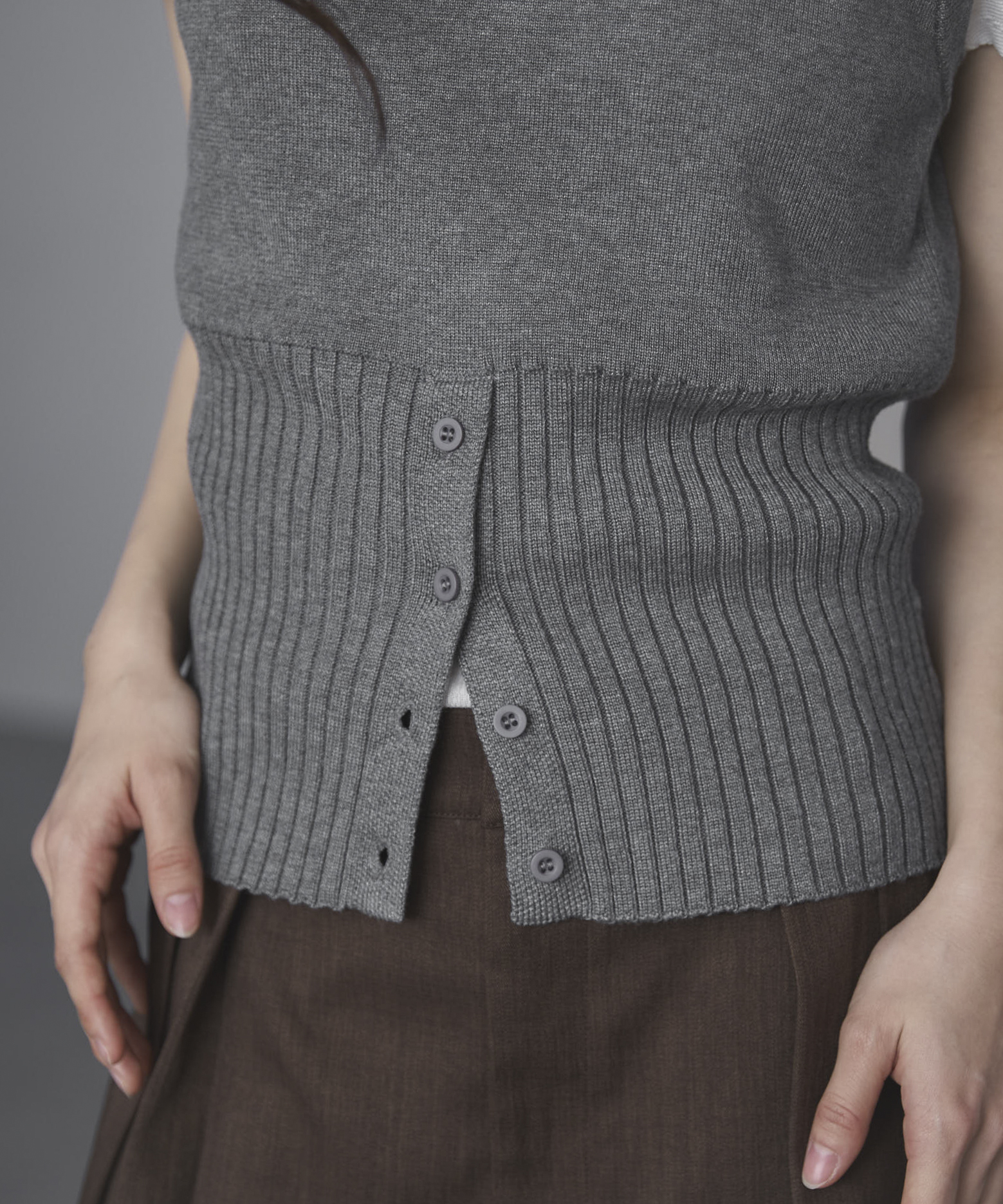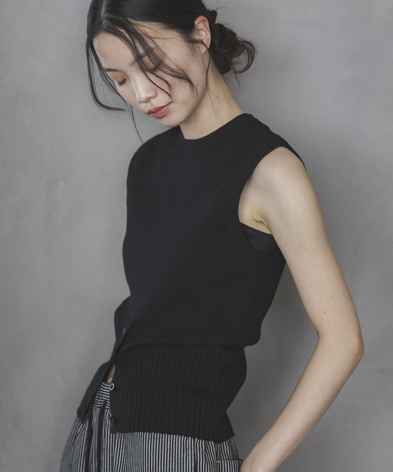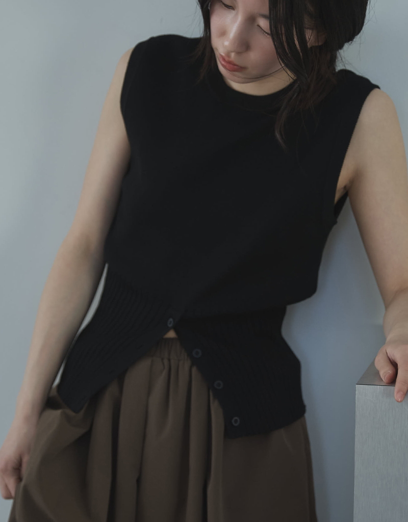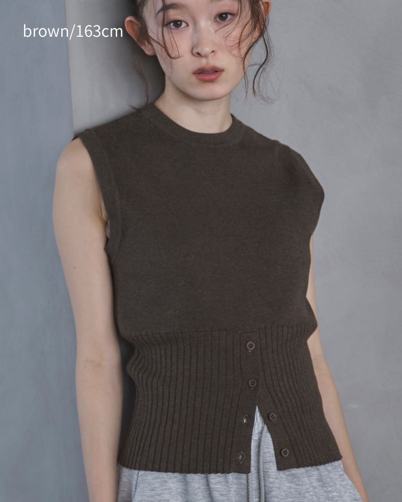 裾のボタンディティールで抜け感のある雰囲気を演出できるノースリーブニット。