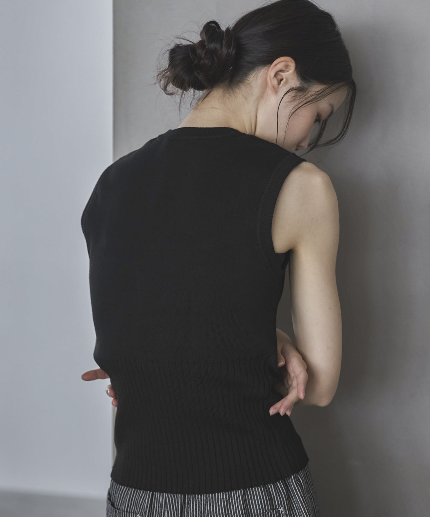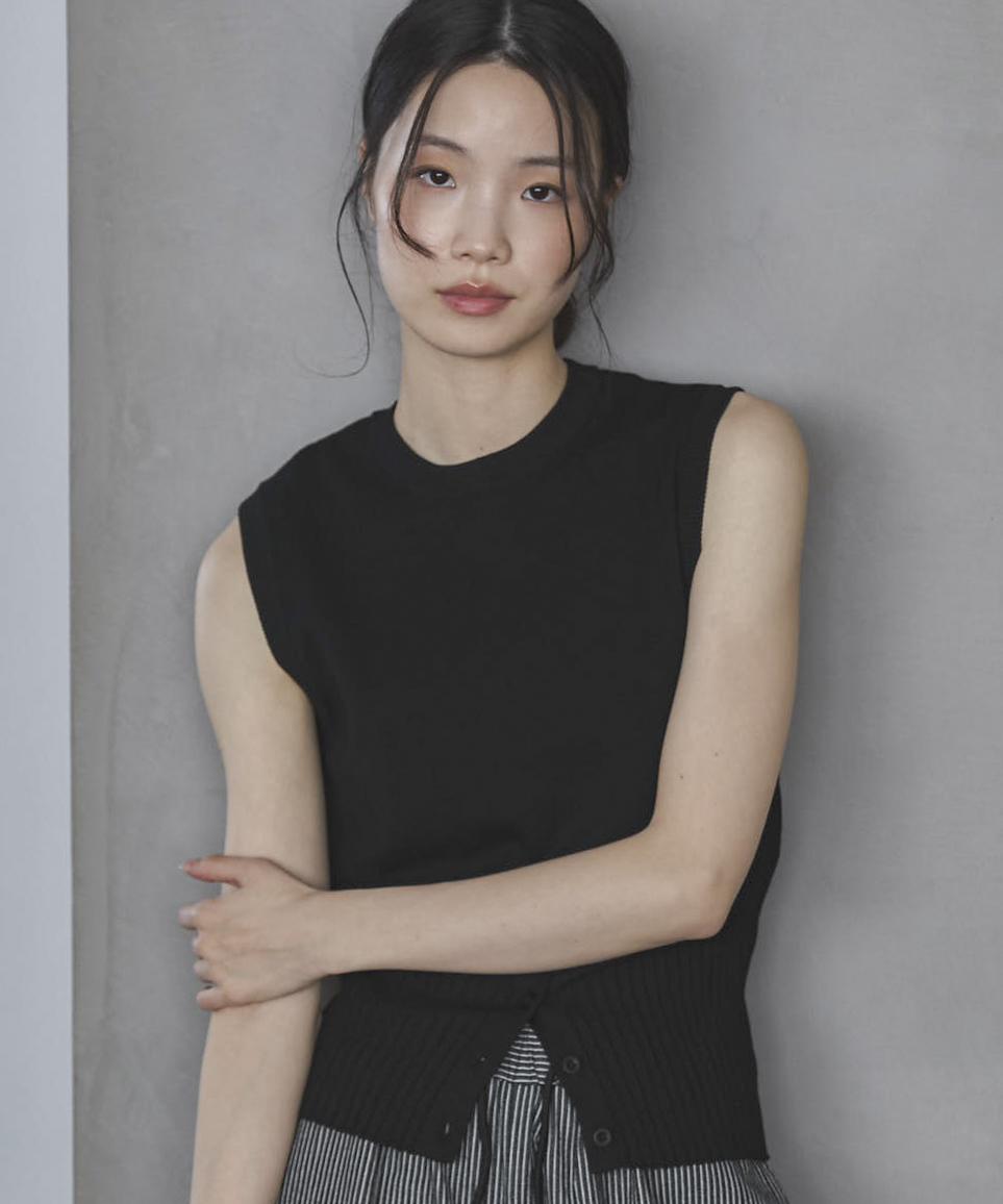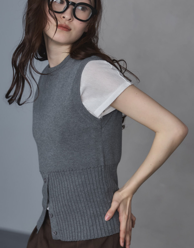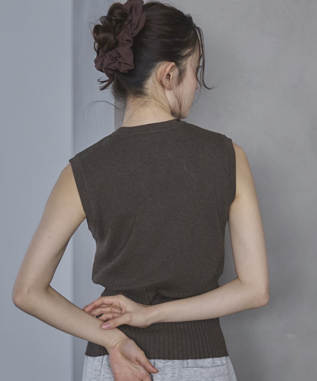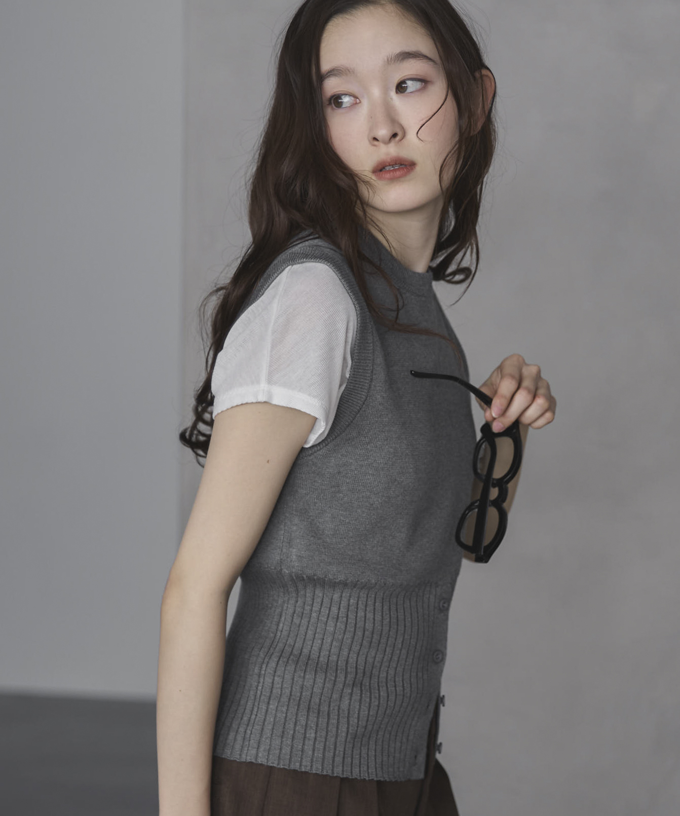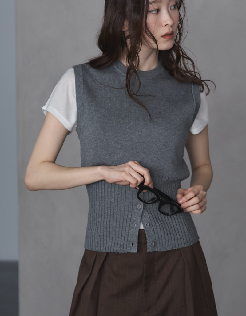 裾のボタンディティールで抜け感のある雰囲気を演出できるノースリーブニット。