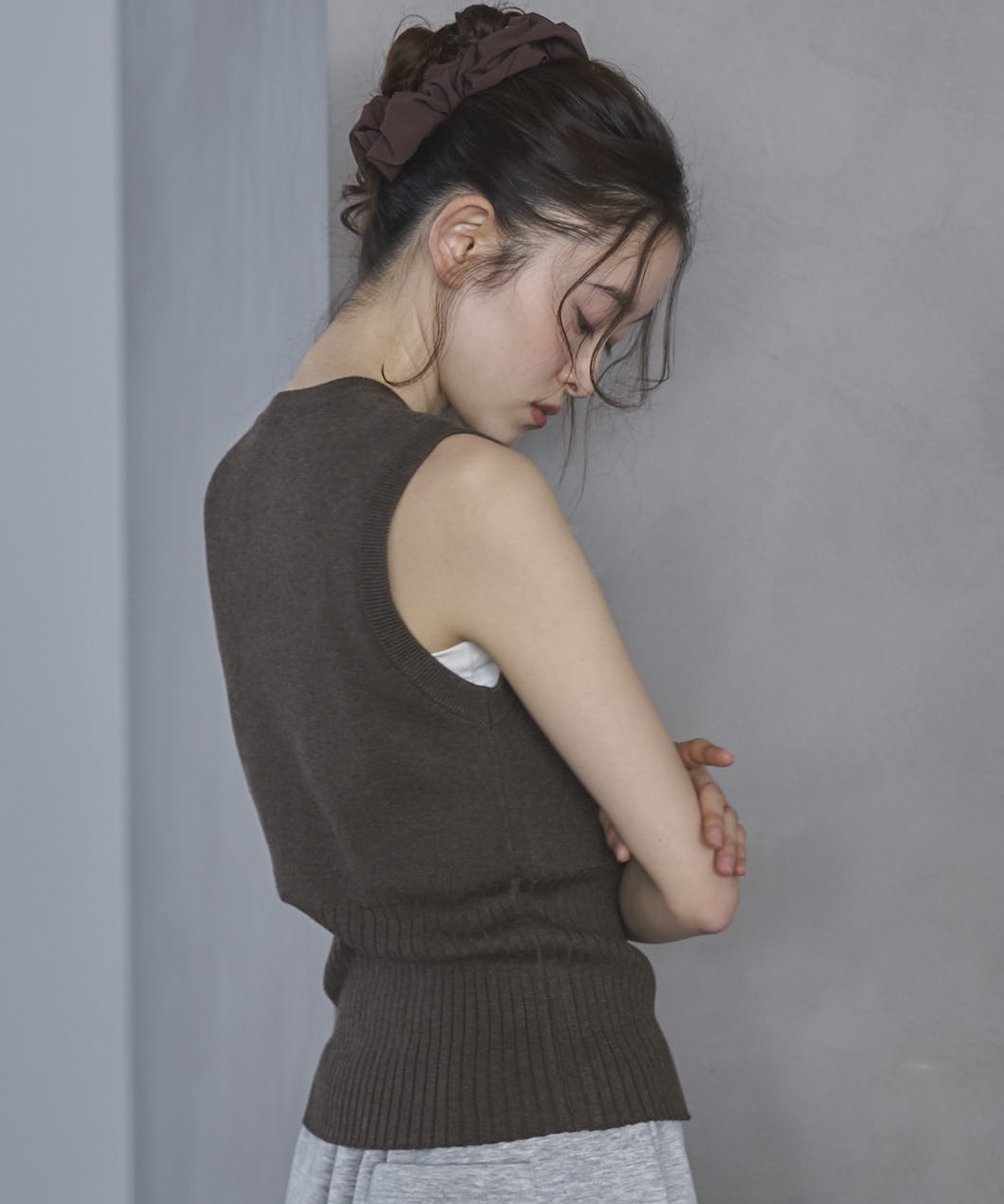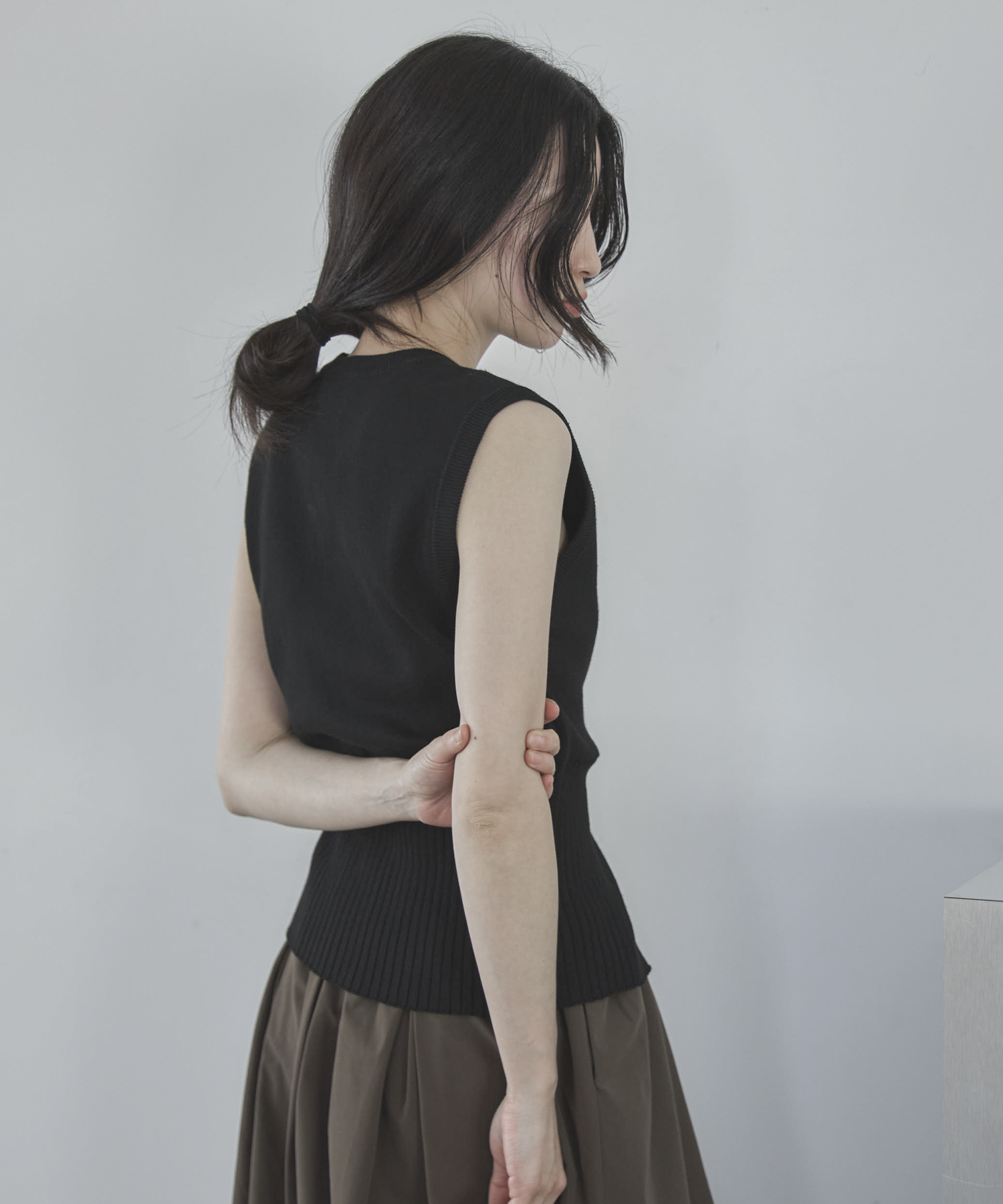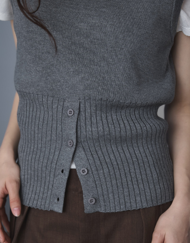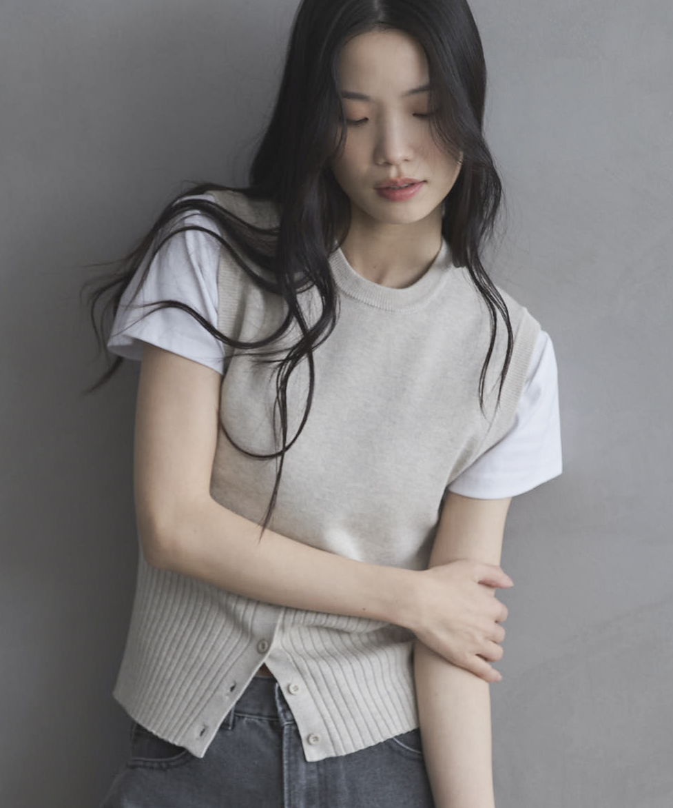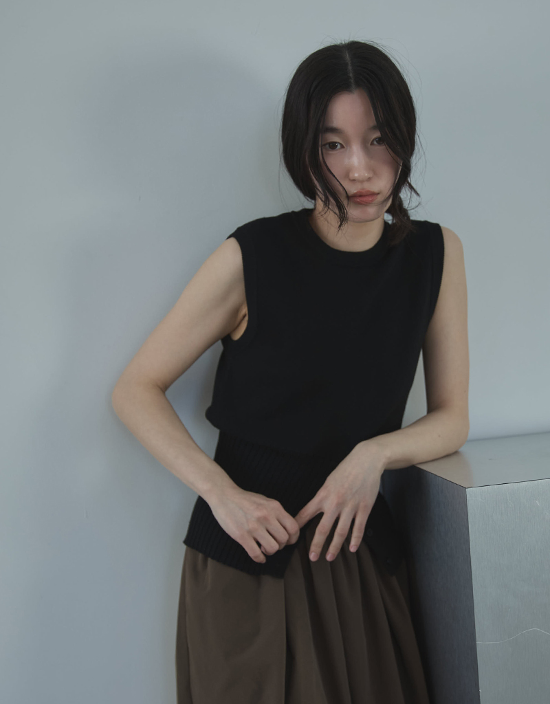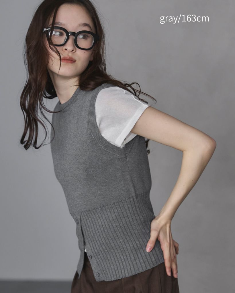 裾のボタンディティールで抜け感のある雰囲気を演出できるノースリーブニット。