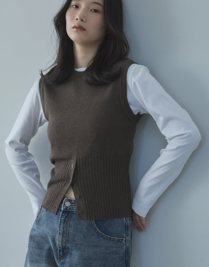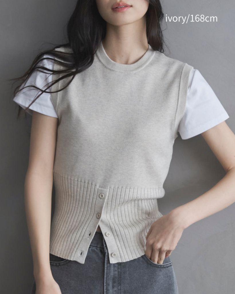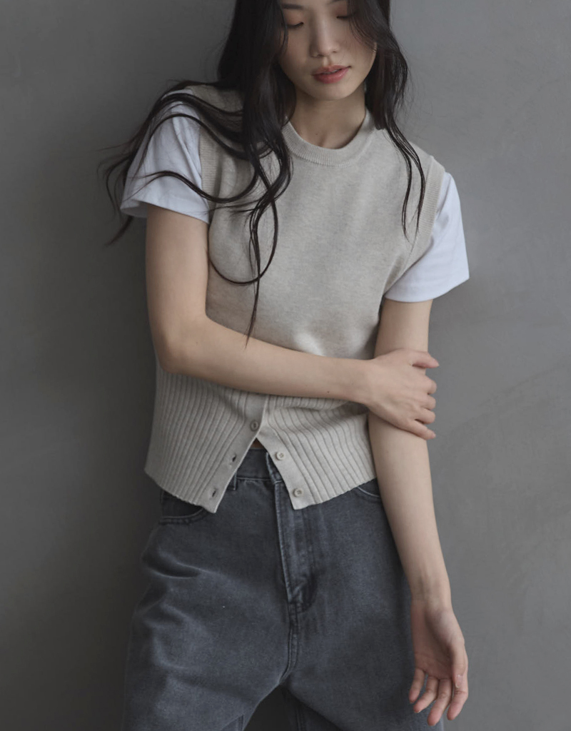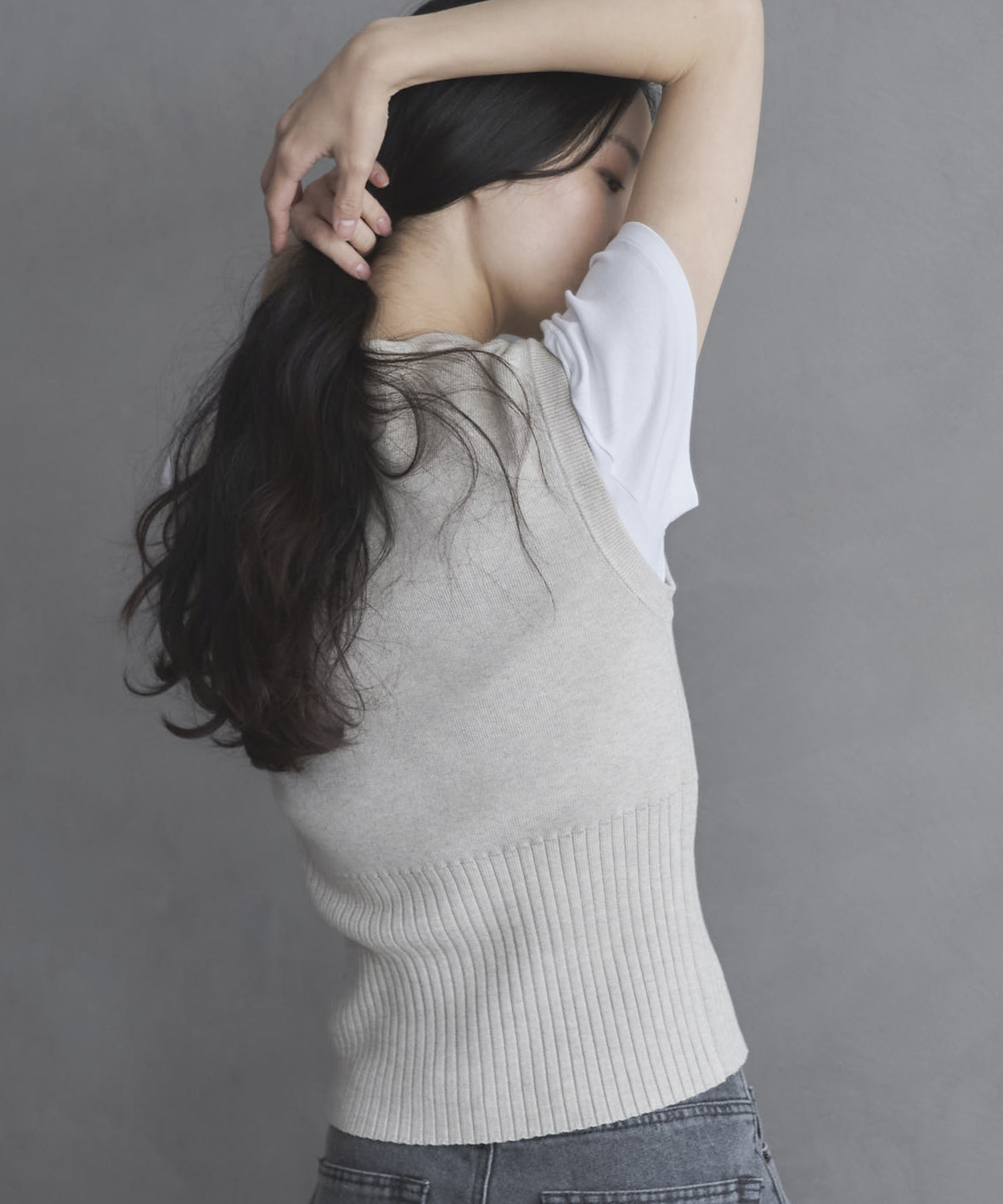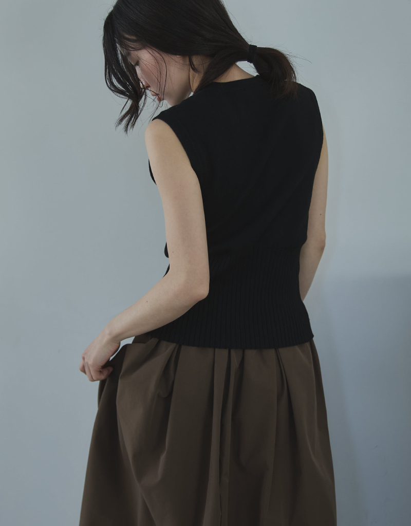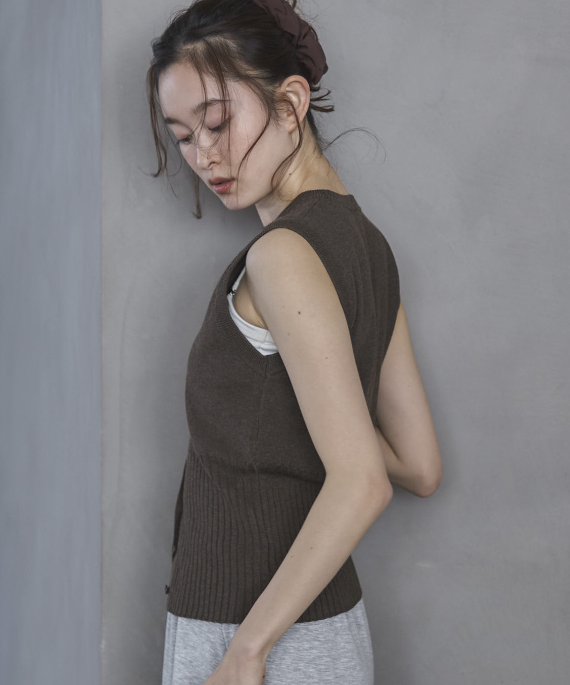 裾のボタンディティールで抜け感のある雰囲気を演出できるノースリーブニット。
