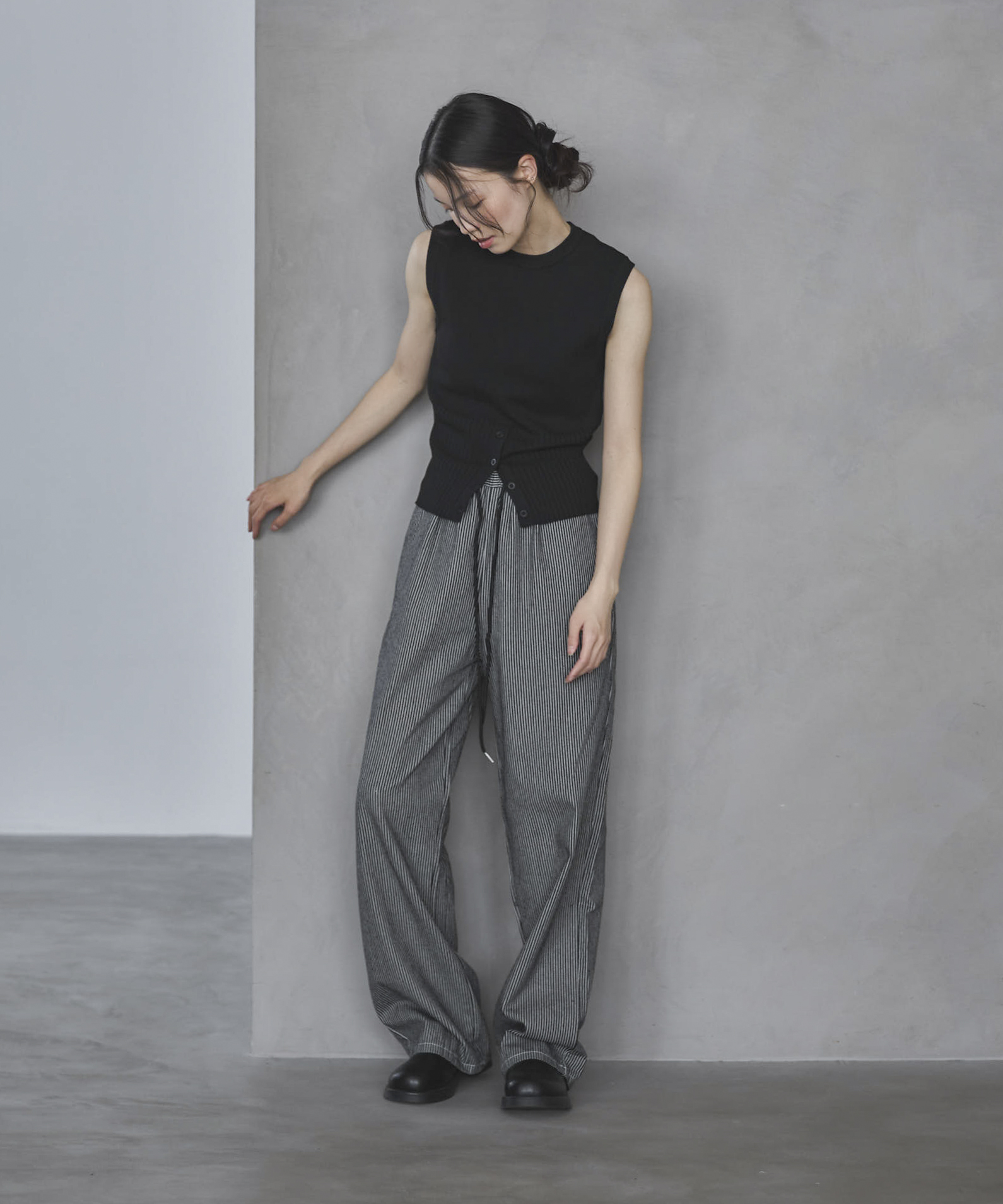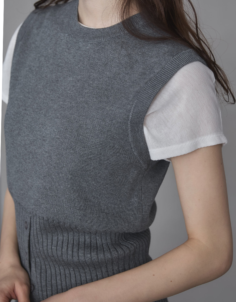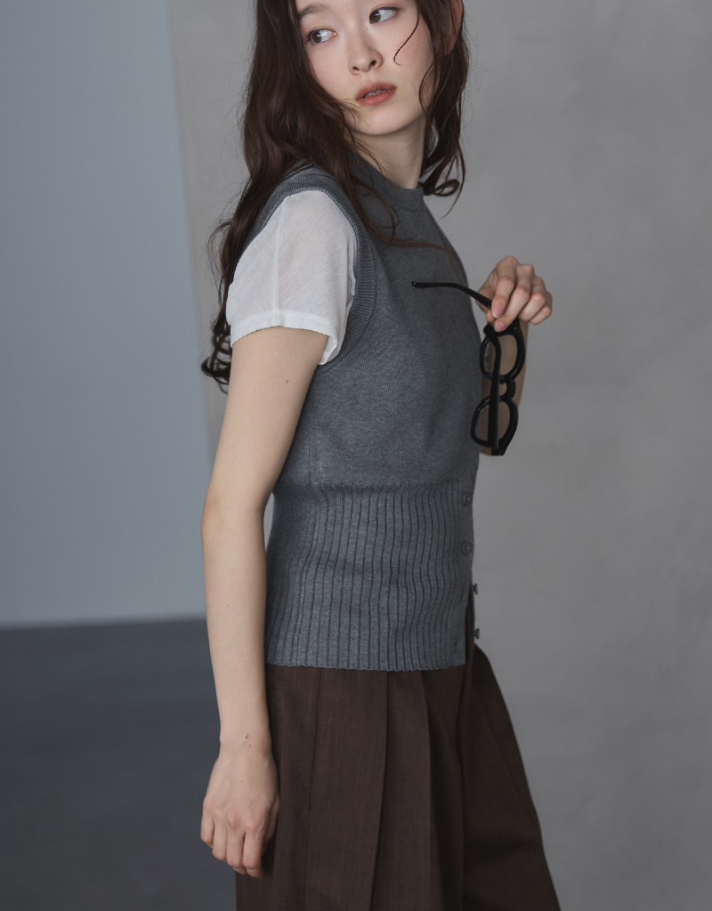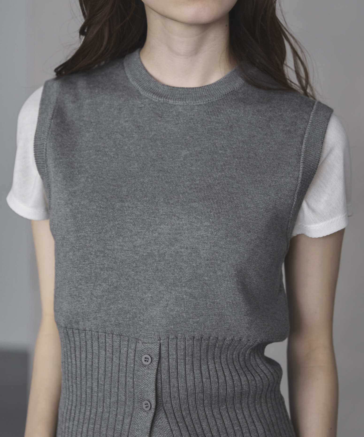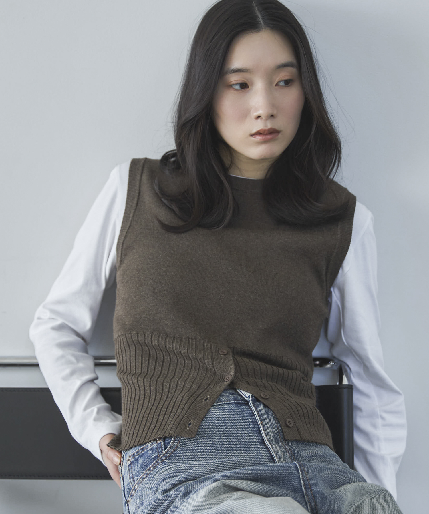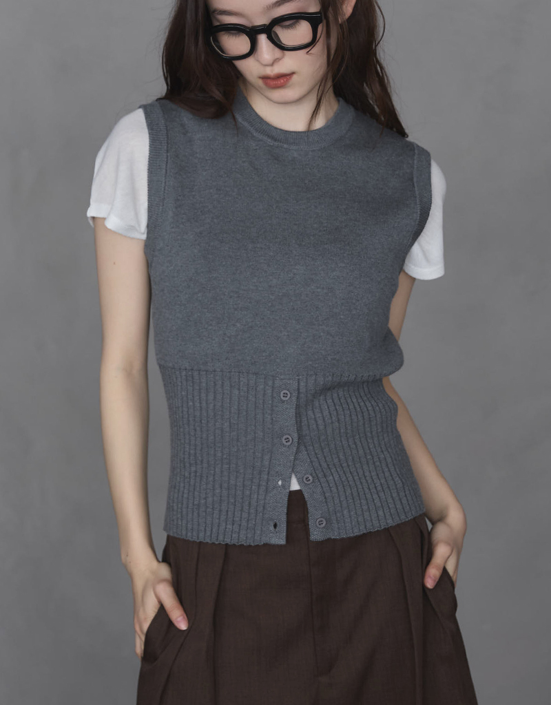 裾のボタンディティールで抜け感のある雰囲気を演出できるノースリーブニット。