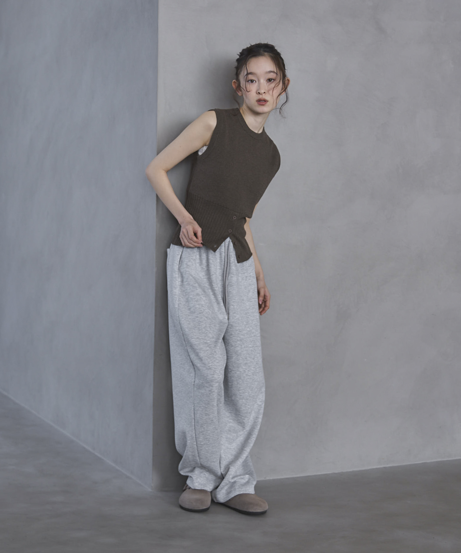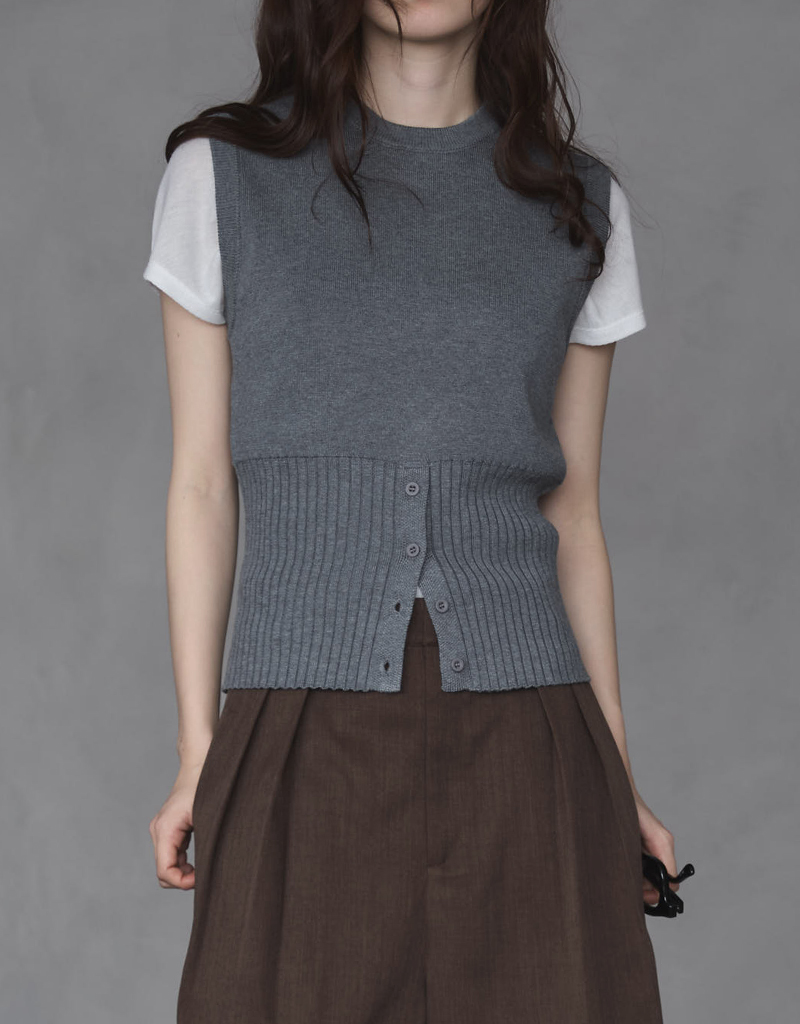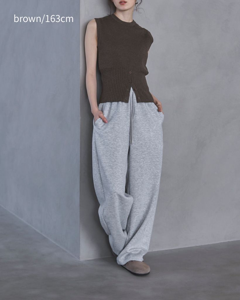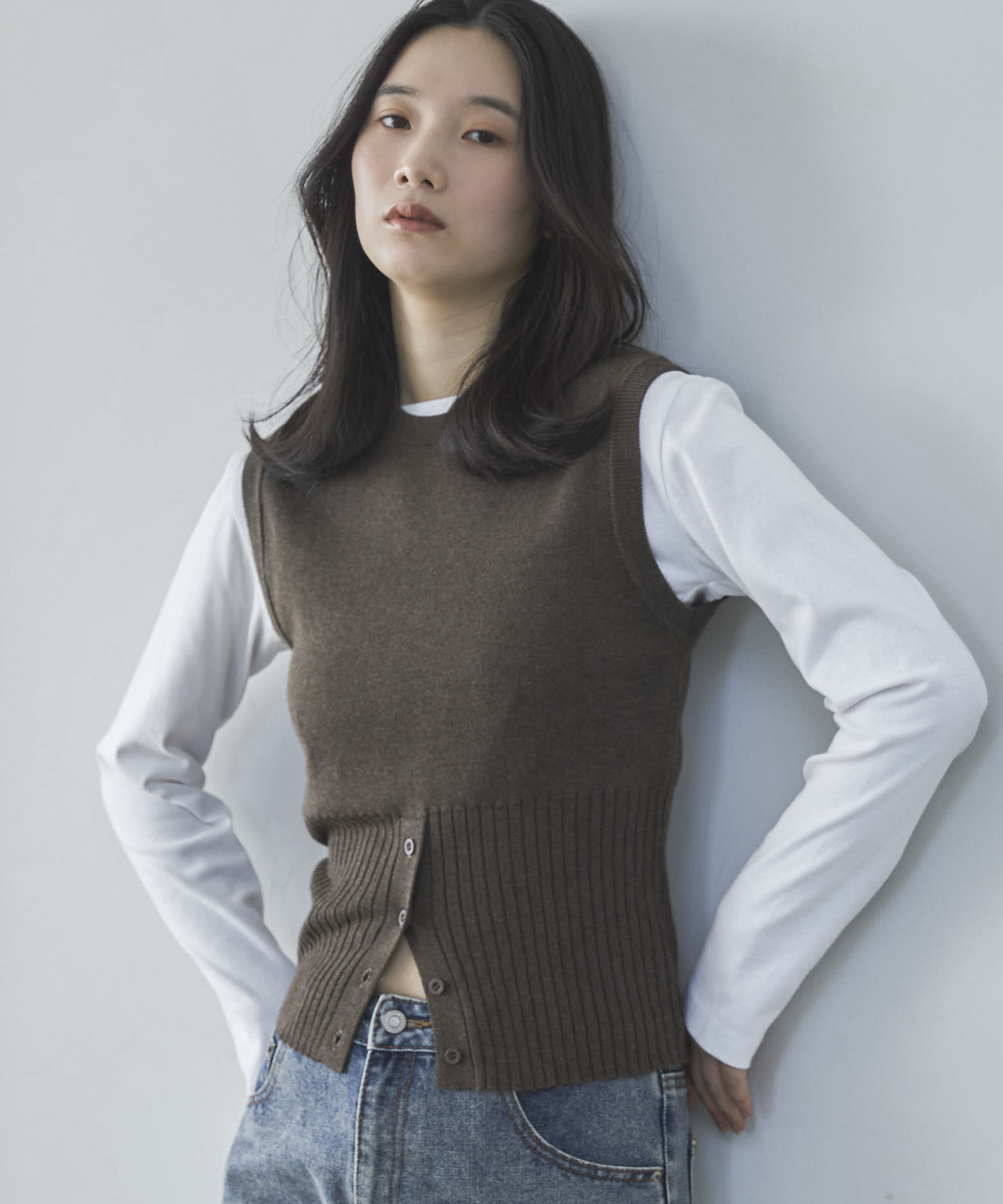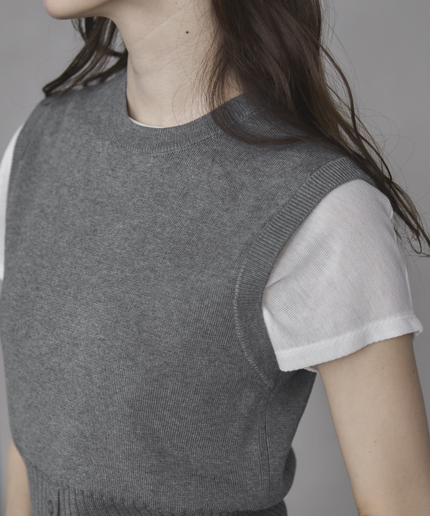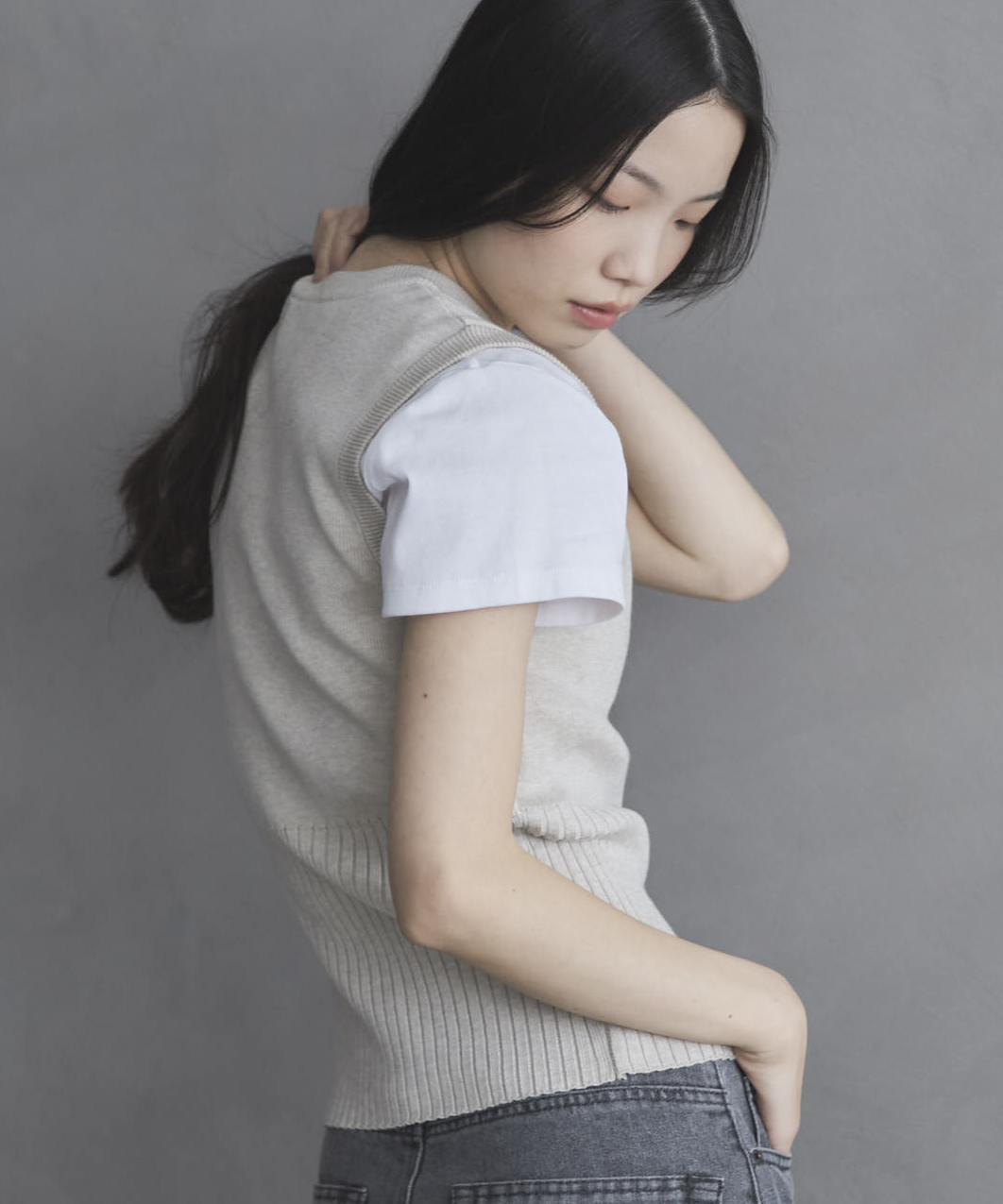 裾のボタンディティールで抜け感のある雰囲気を演出できるノースリーブニット。