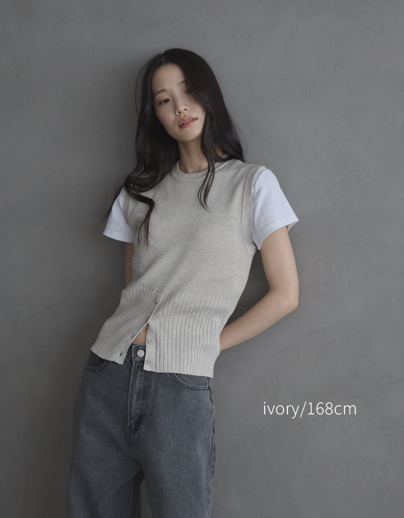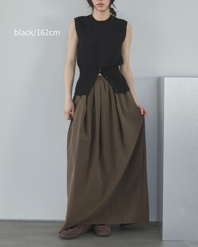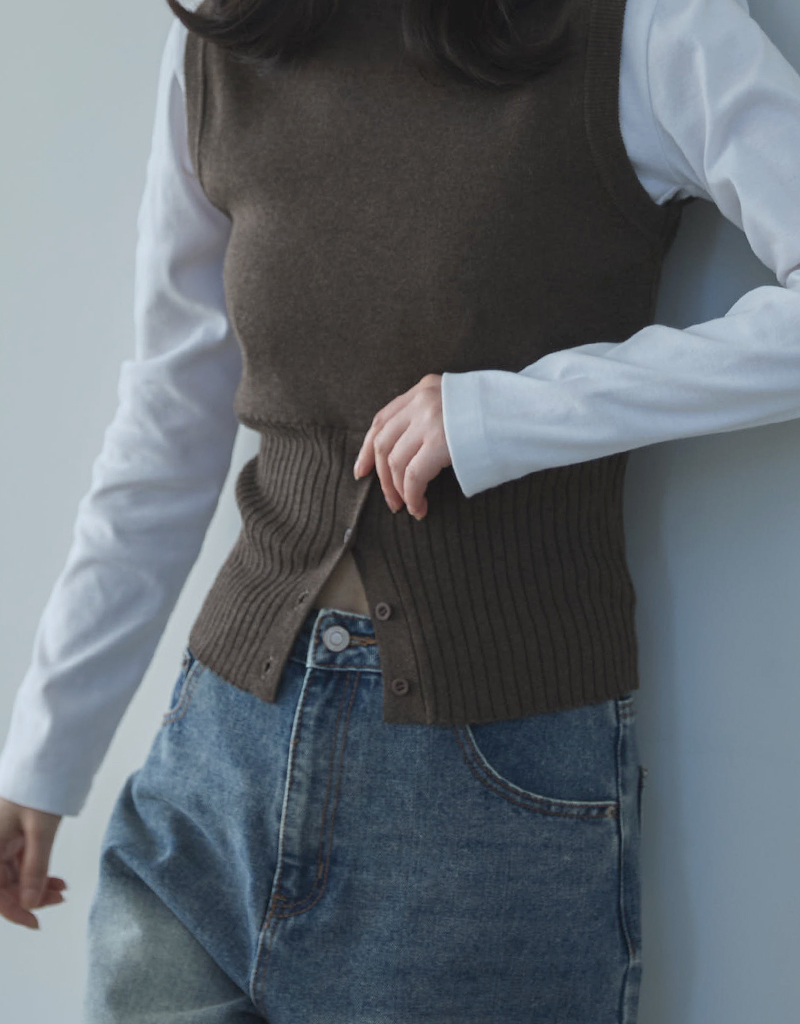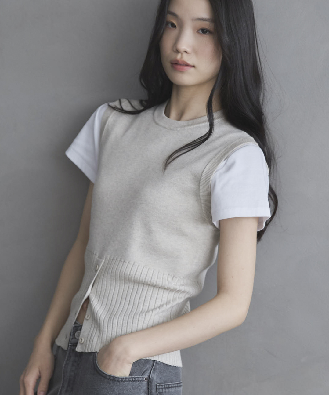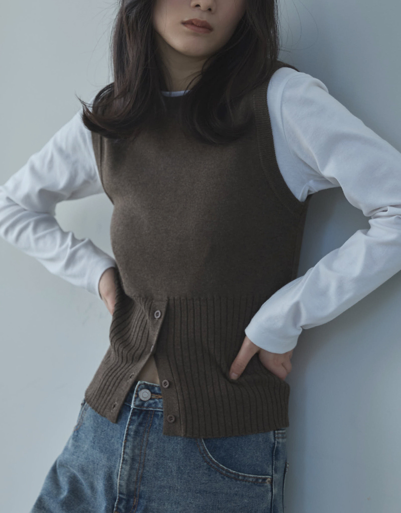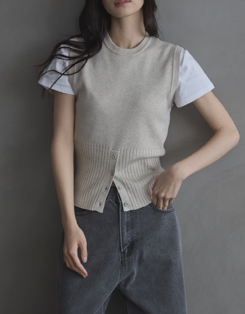 裾のボタンディティールで抜け感のある雰囲気を演出できるノースリーブニット。
