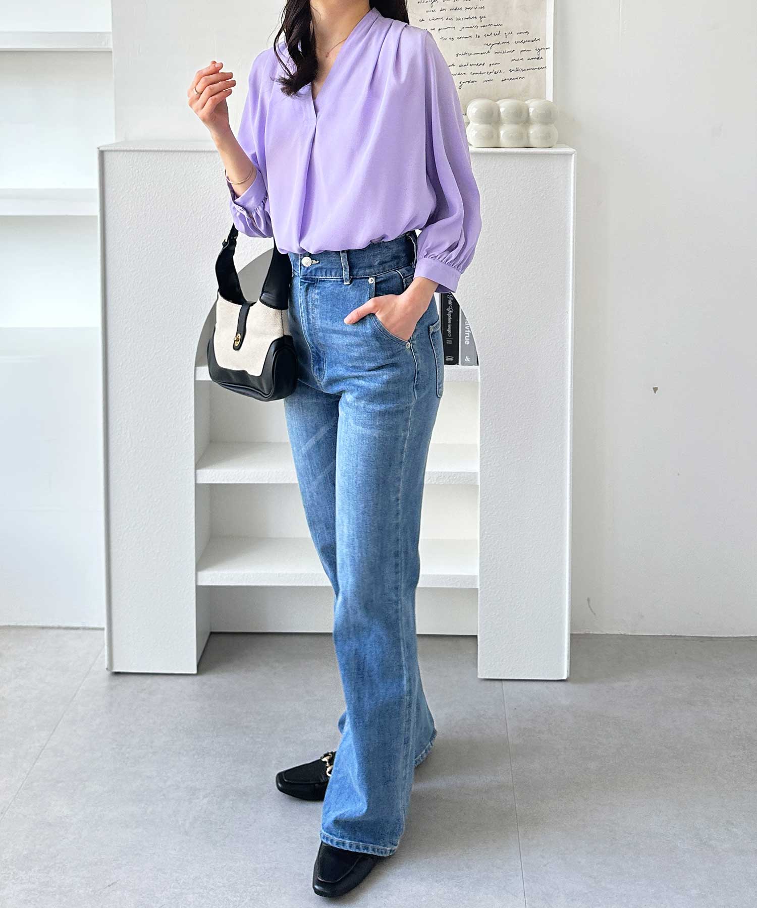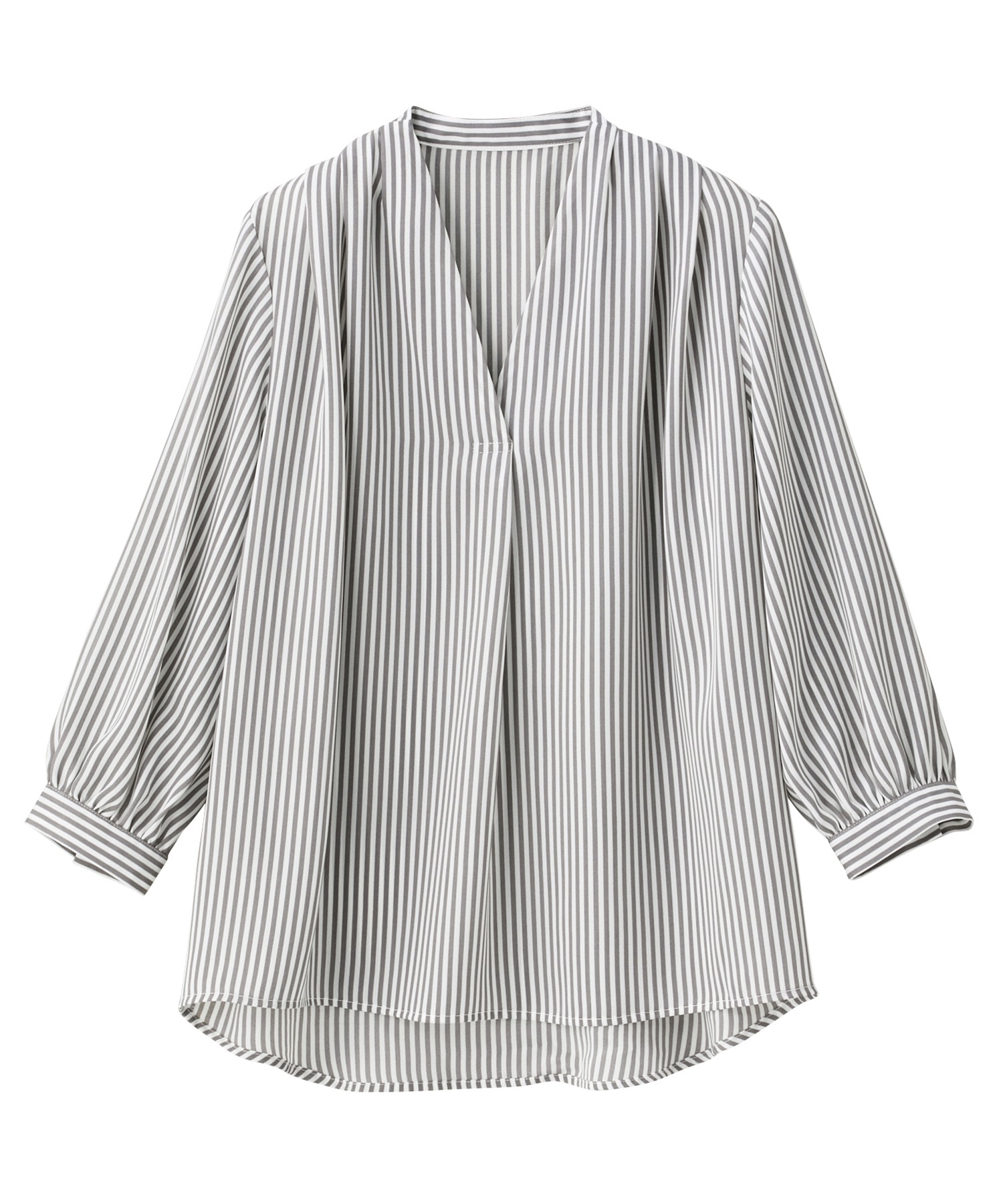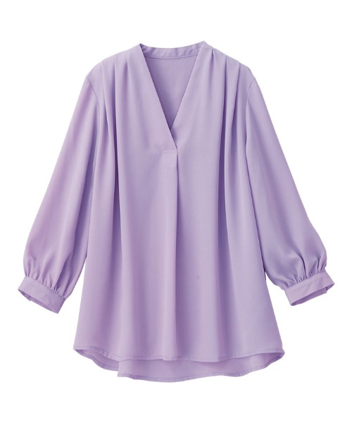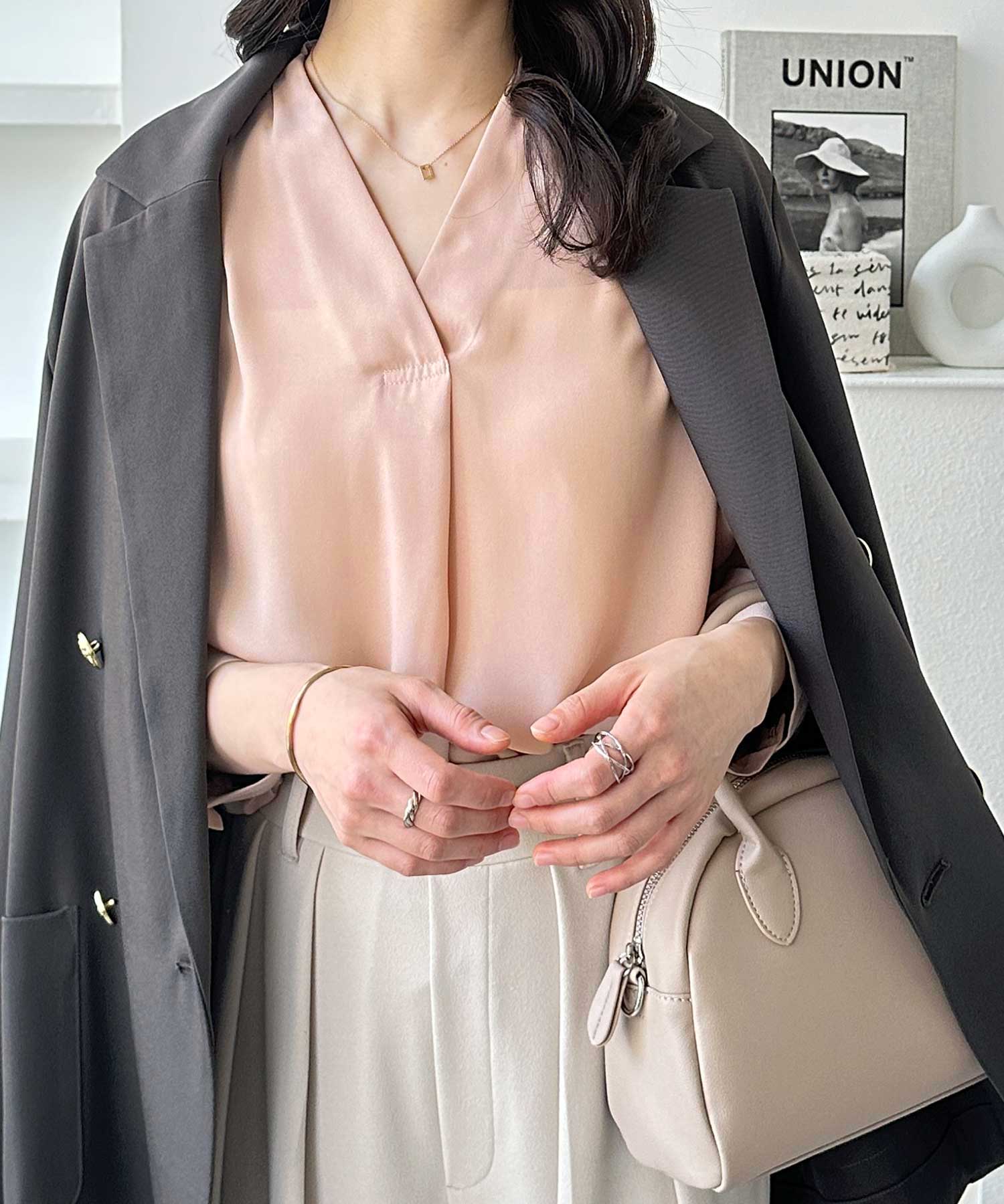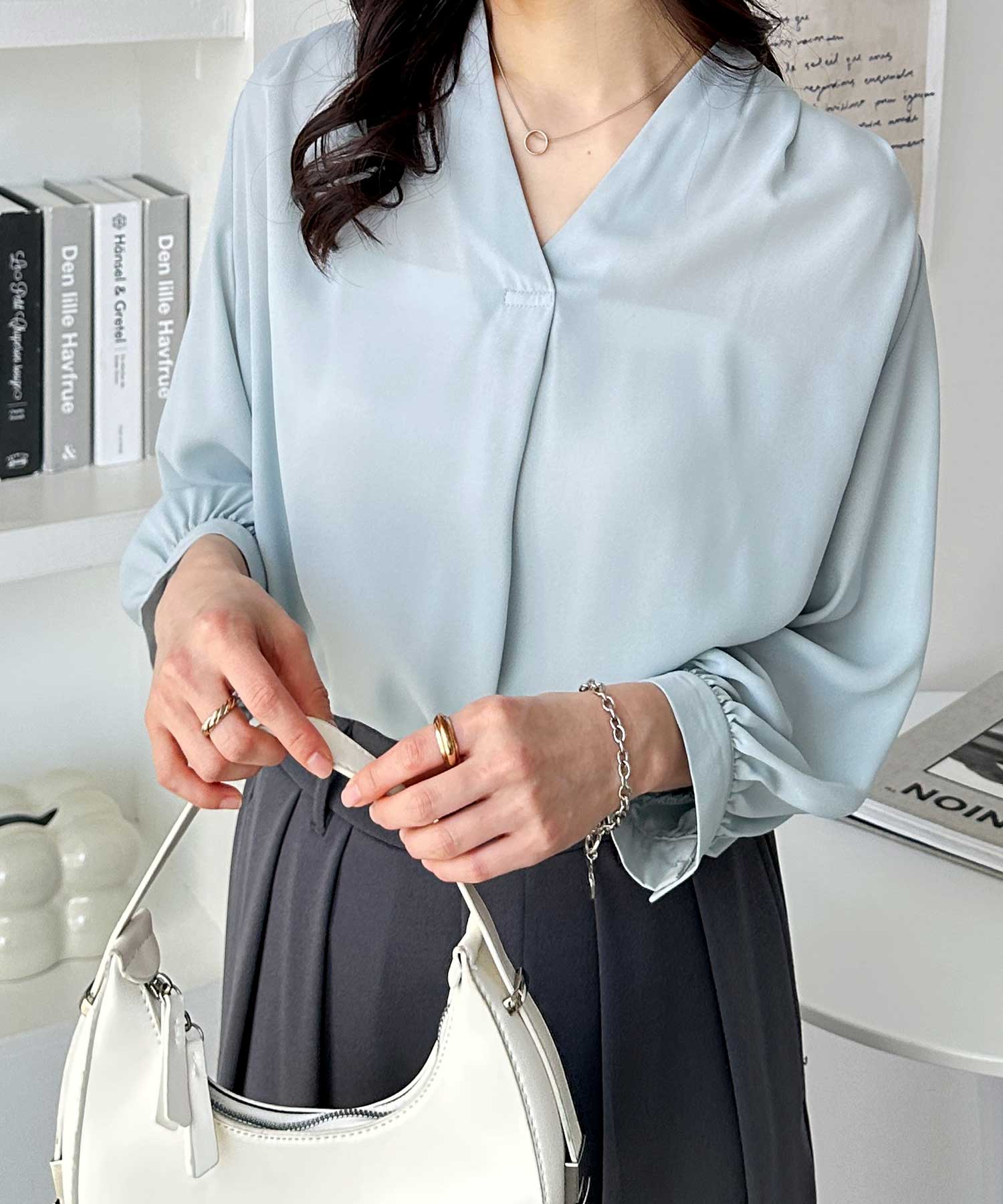Vネックはデコルテをきれい見せ、スキッパーデザインが顔周りも華やかな印象を与えてくれます。