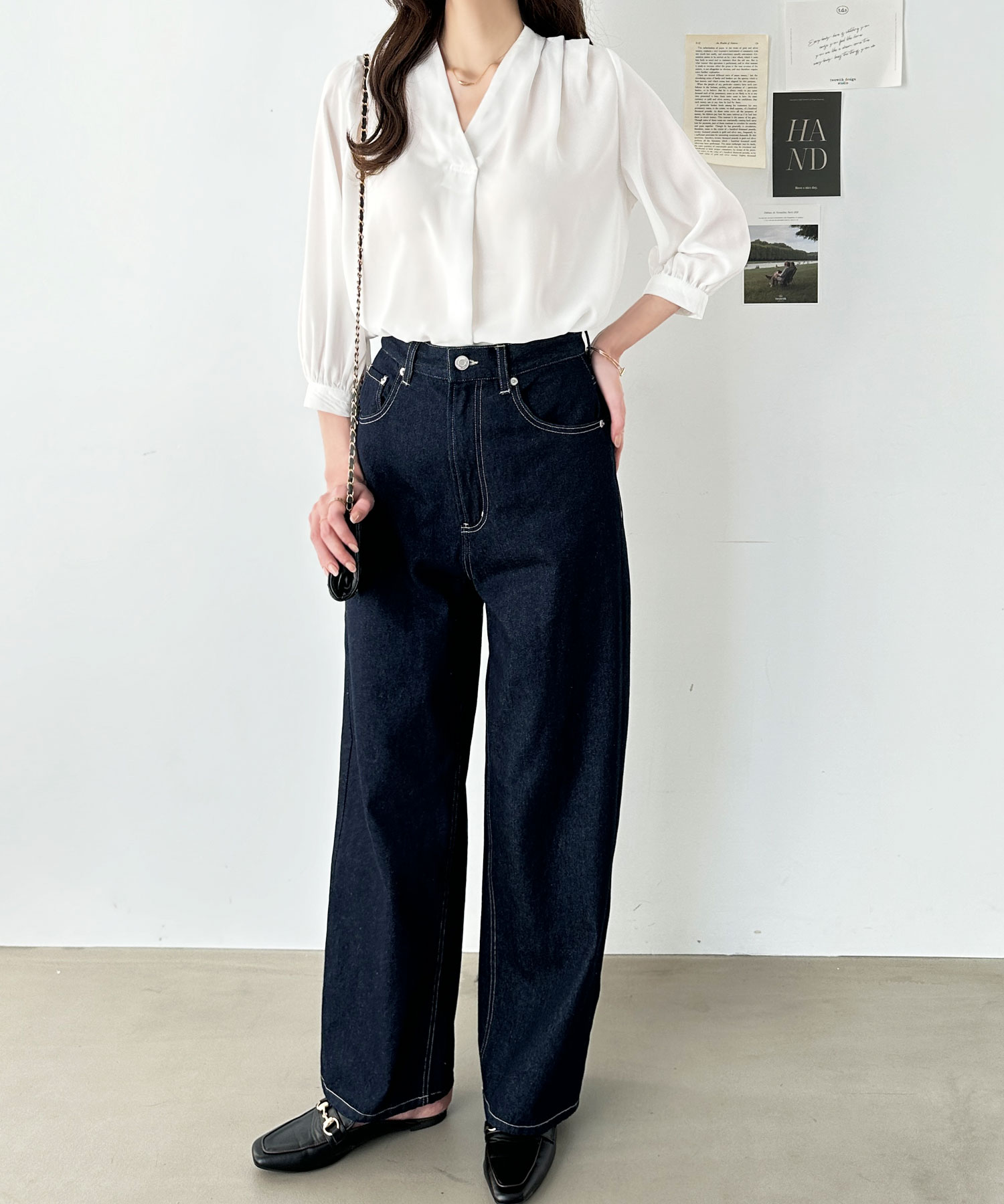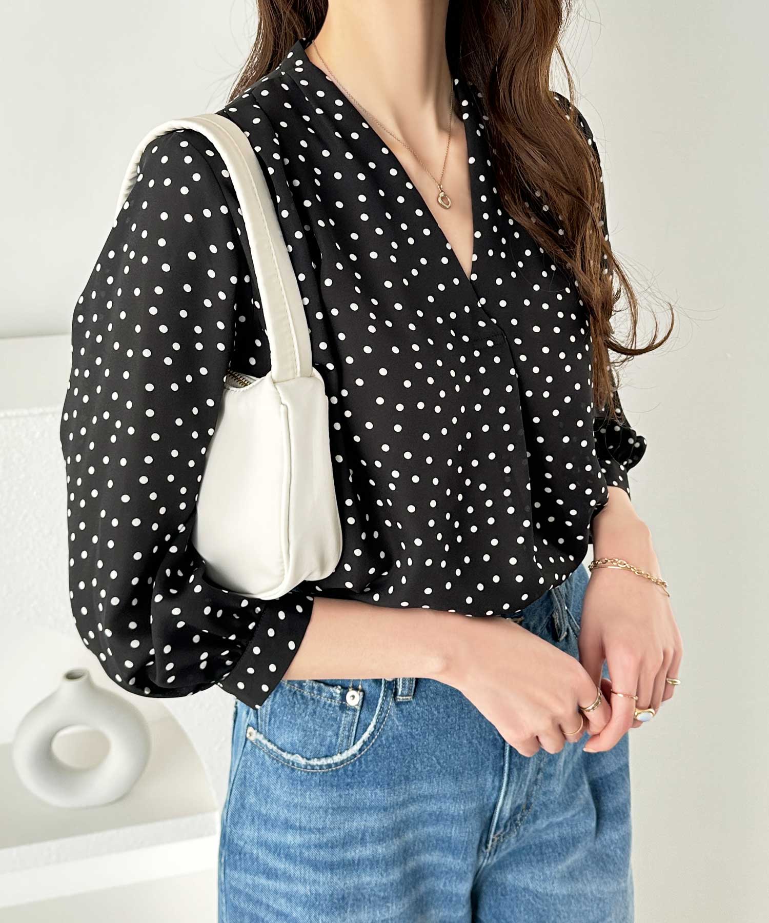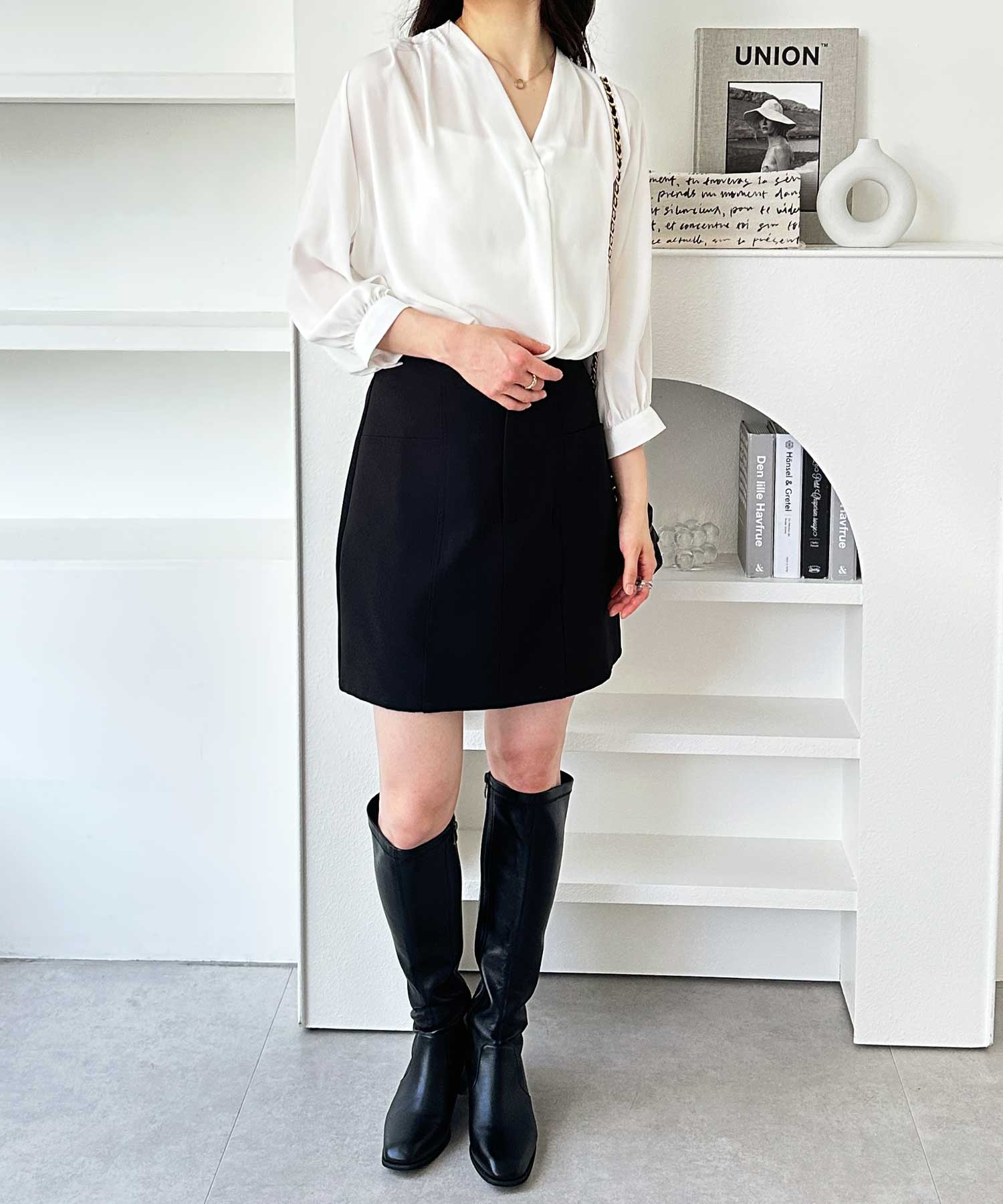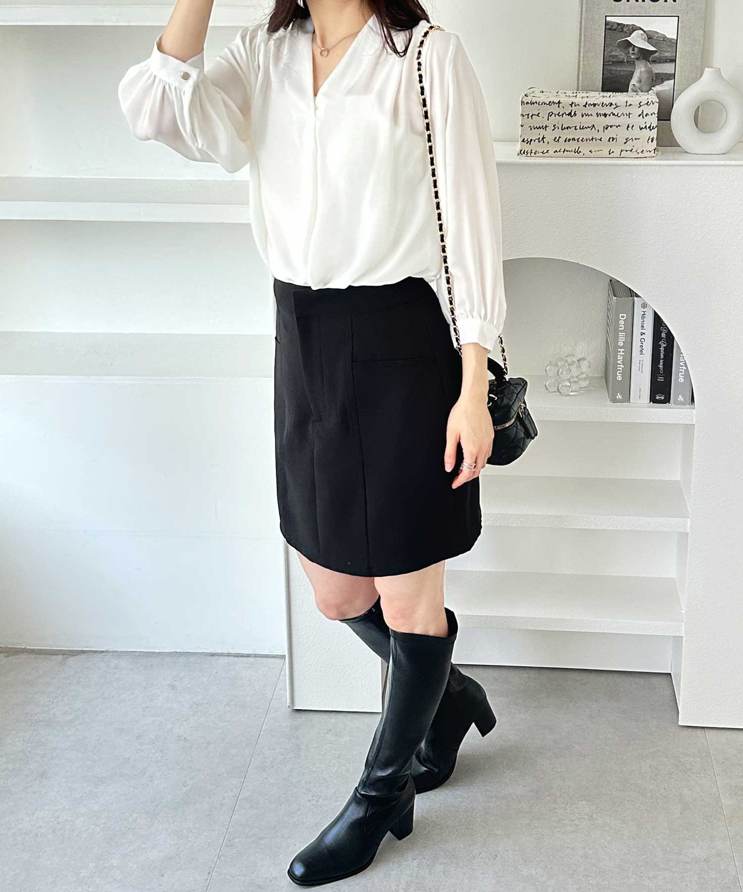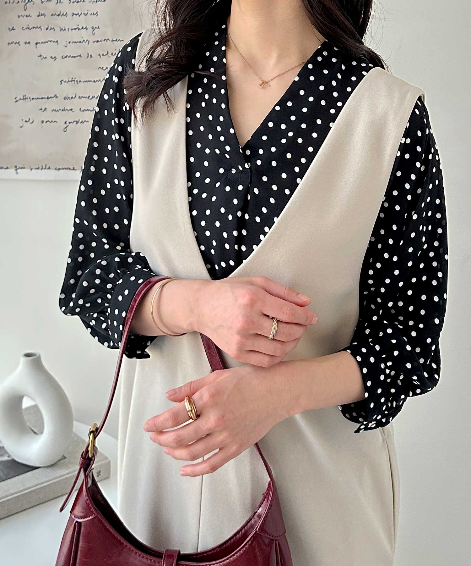 Vネックはデコルテをきれい見せ、スキッパーデザインが顔周りも華やかな印象を与えてくれます。
