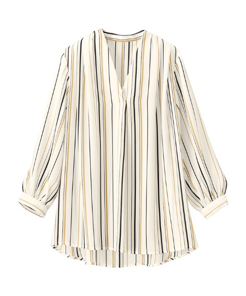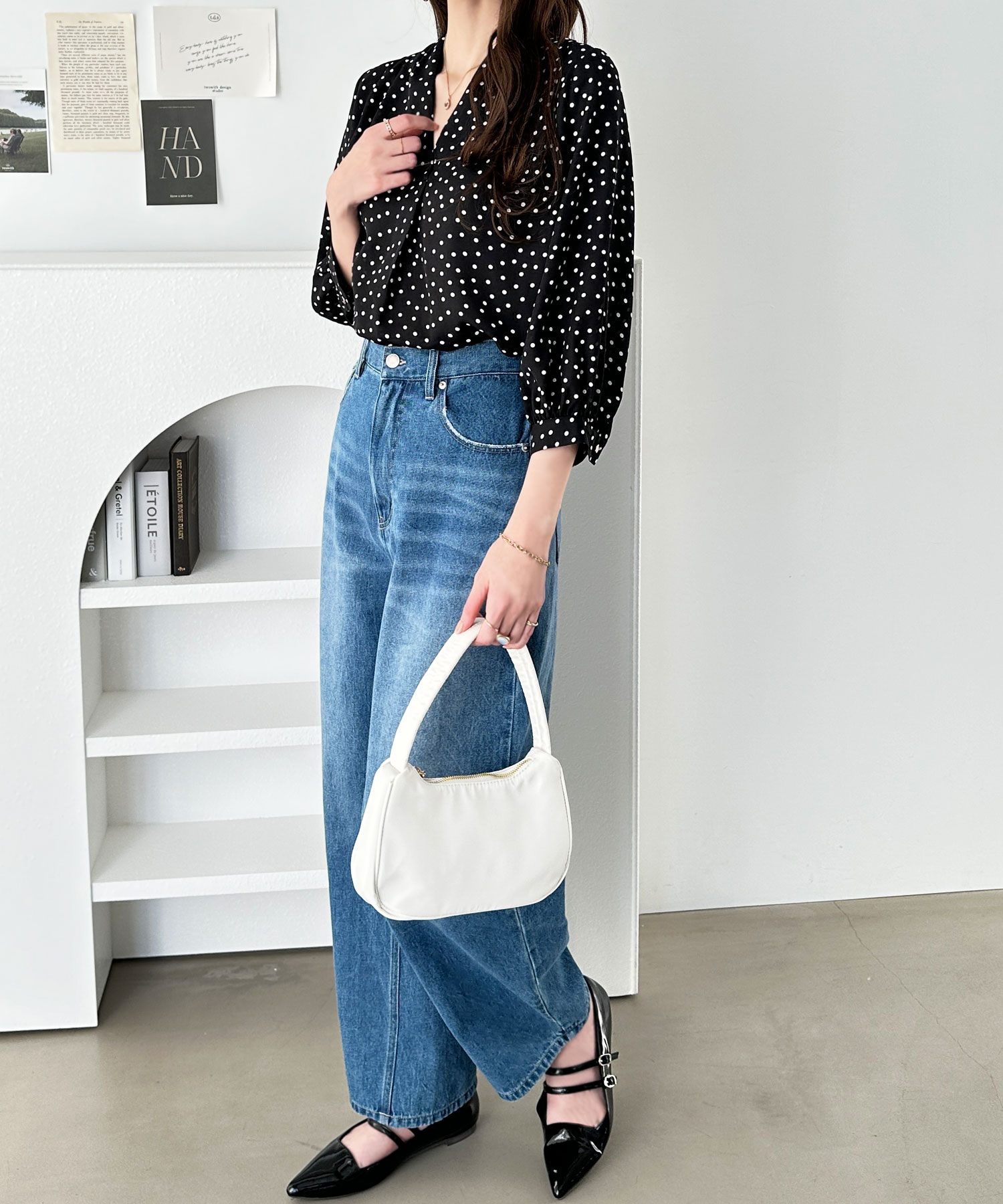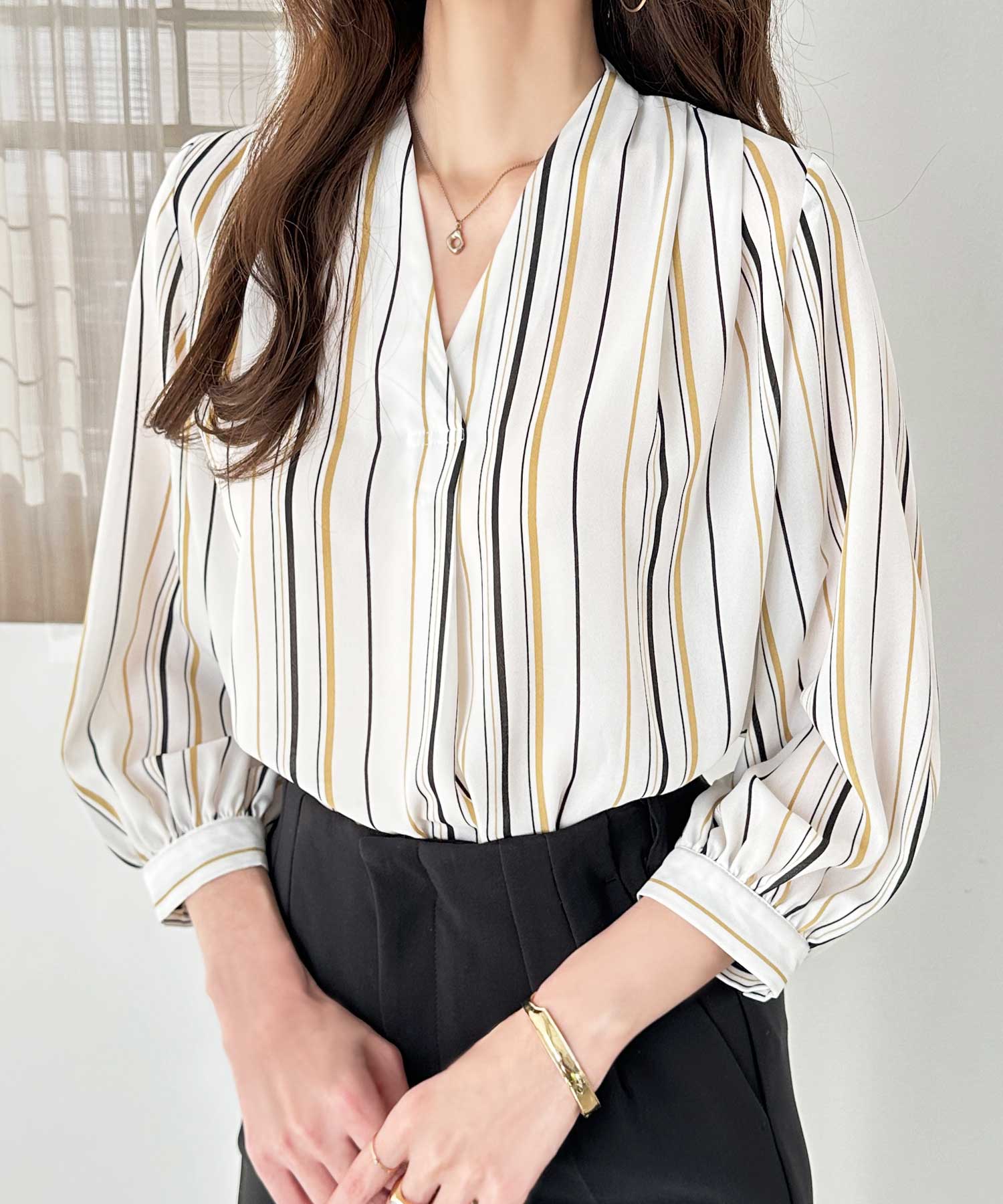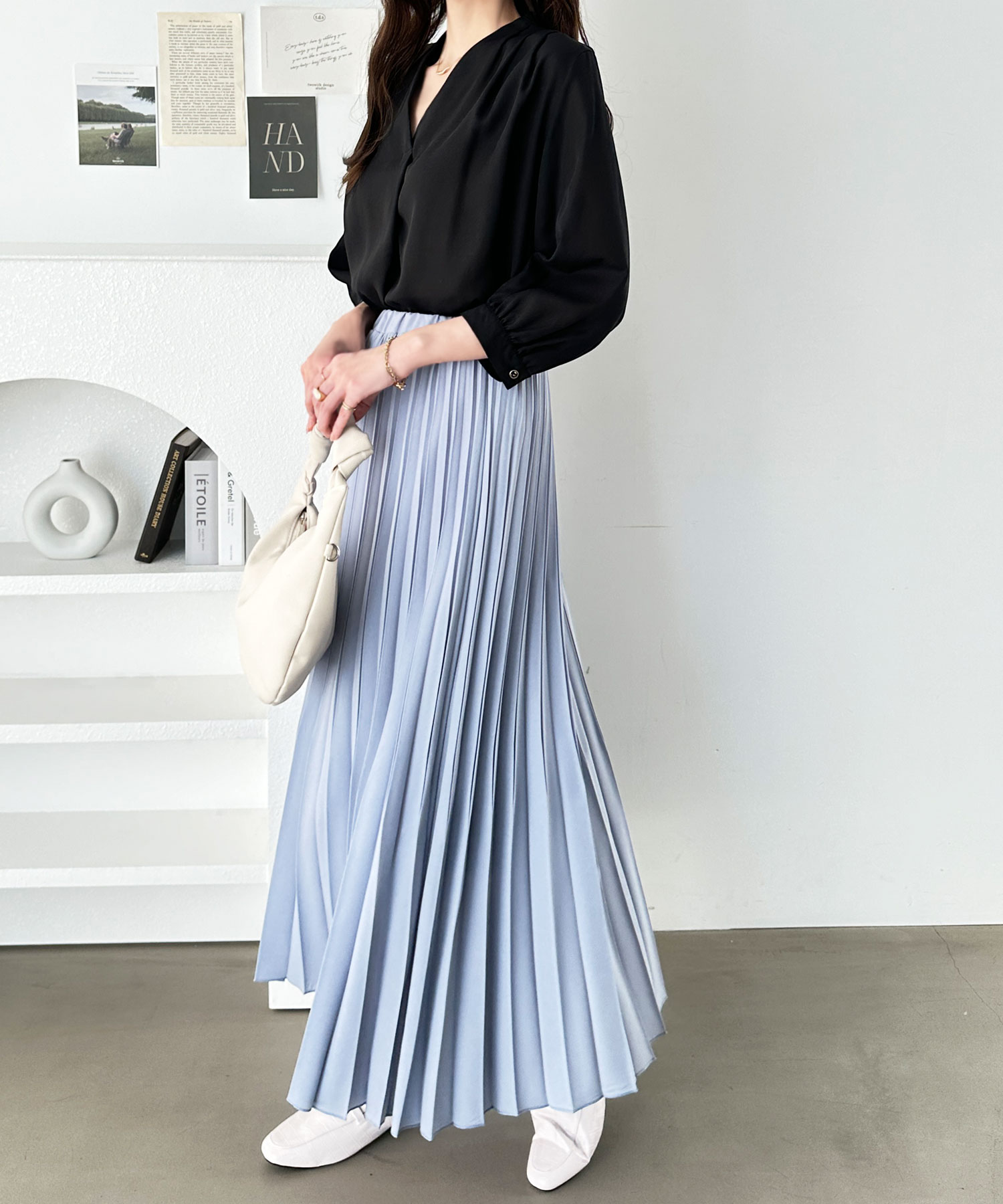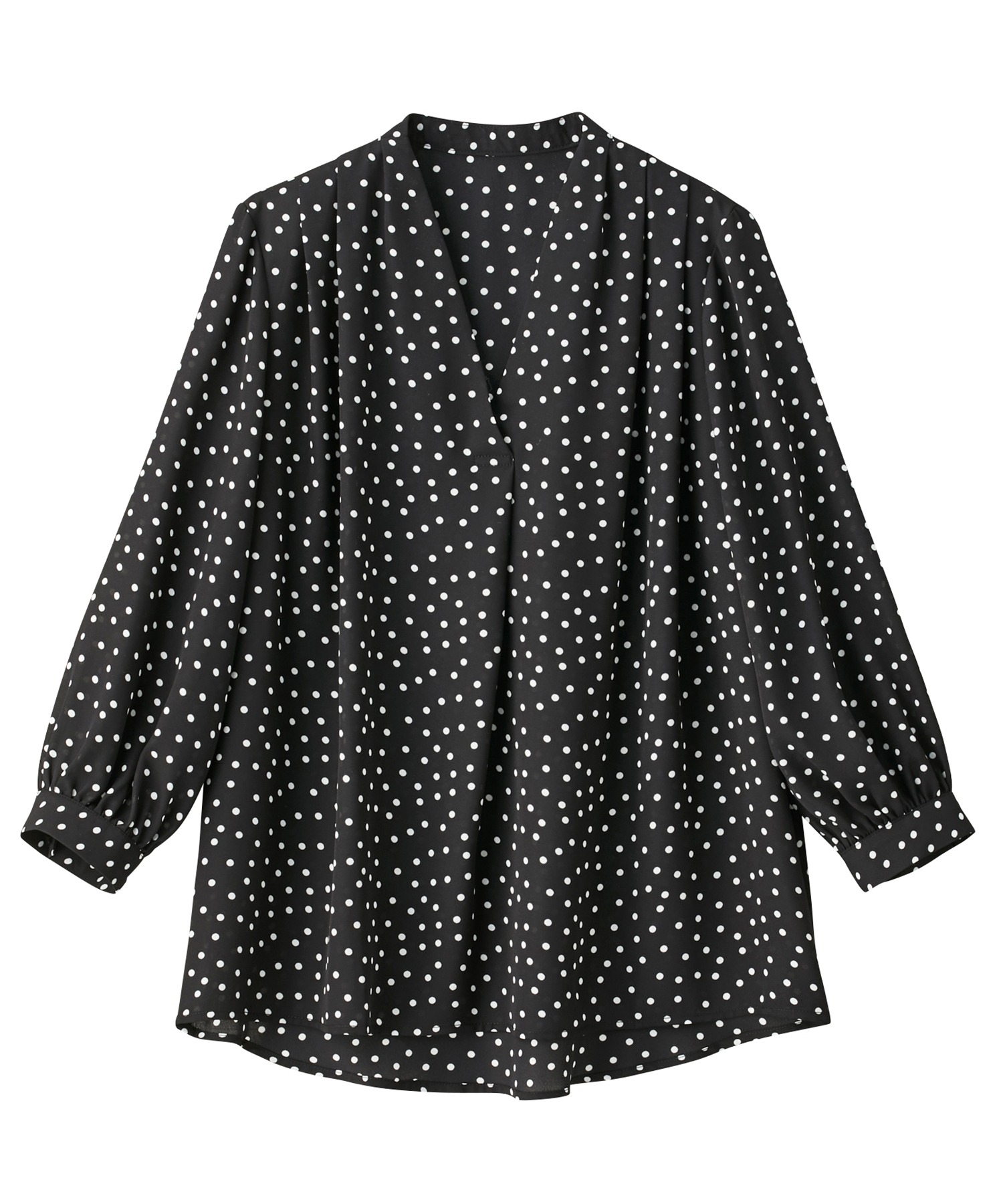 Vネックはデコルテをきれい見せ、スキッパーデザインが顔周りも華やかな印象を与えてくれます。