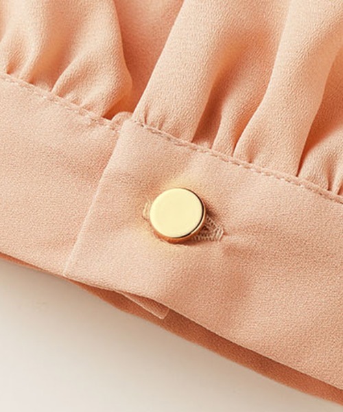 ギャザーを寄せた七分袖デザインは、袖口にゴールド調ボタンがアクセントに。