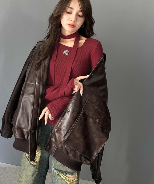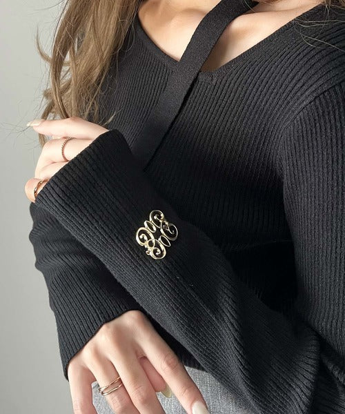 アシンメトリーのデコルテデザインが印象的なリブニット。