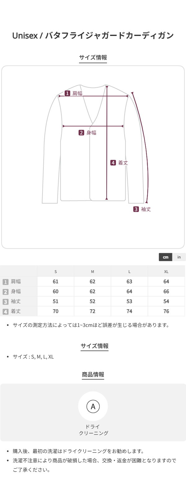 着丈 S:70cm M:72cm L:74cm XL:76cm