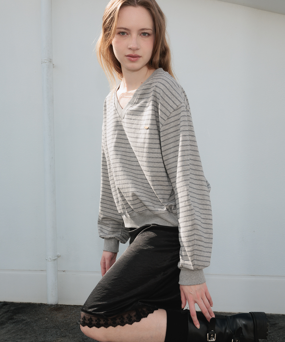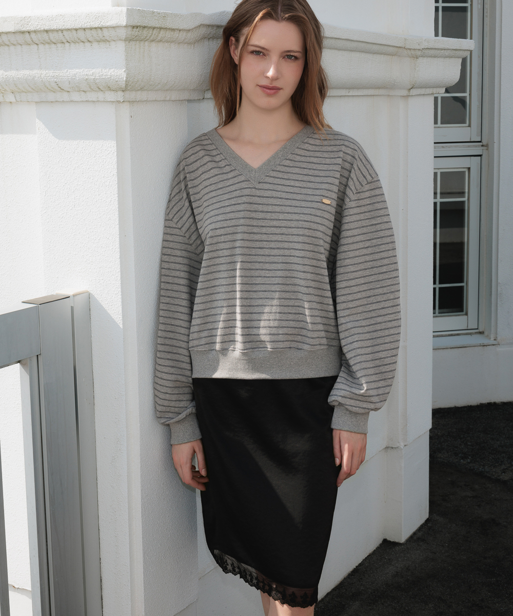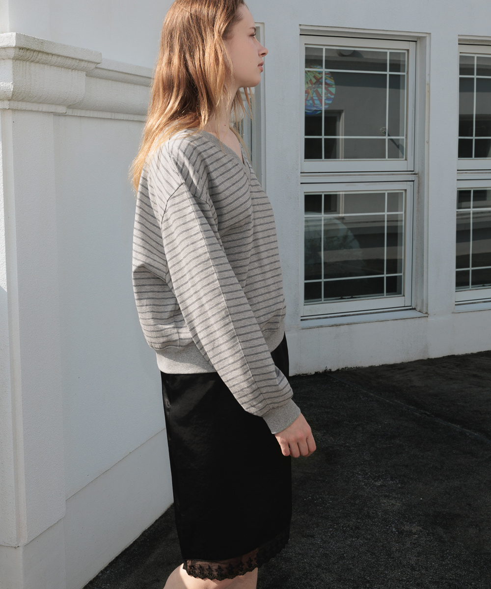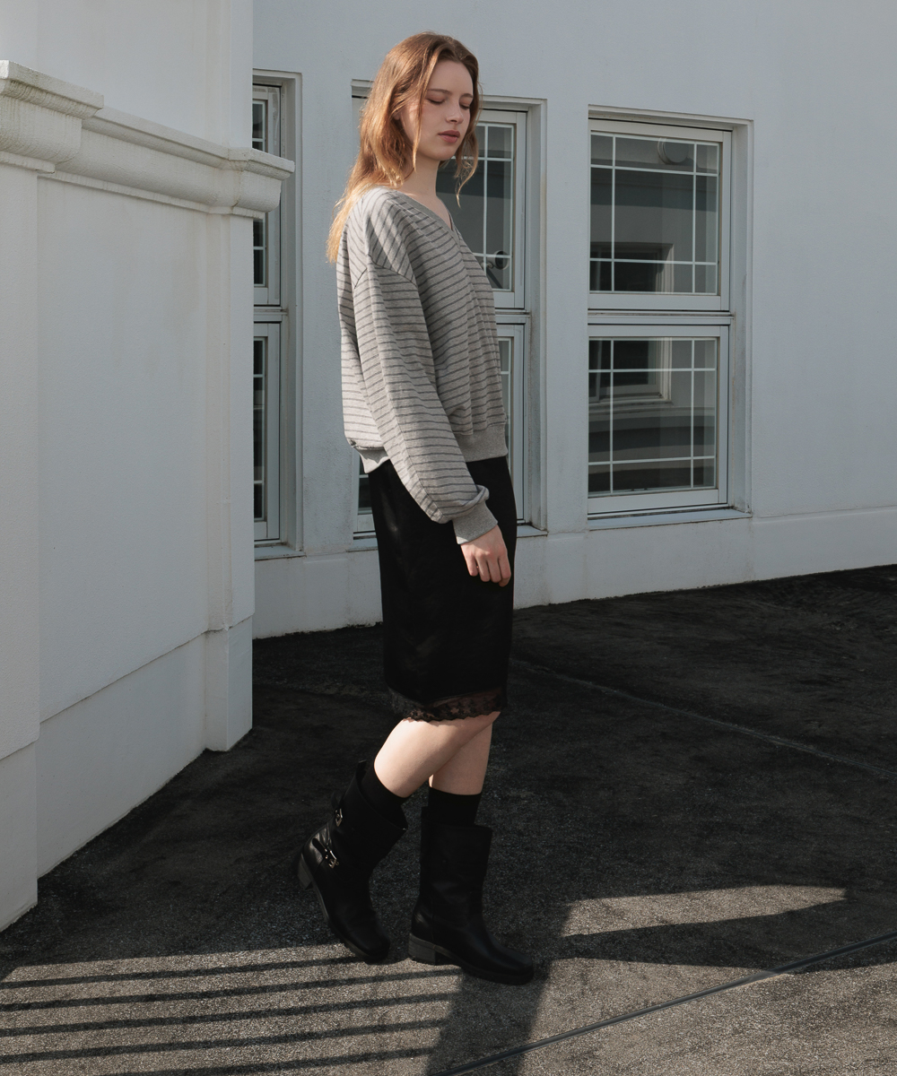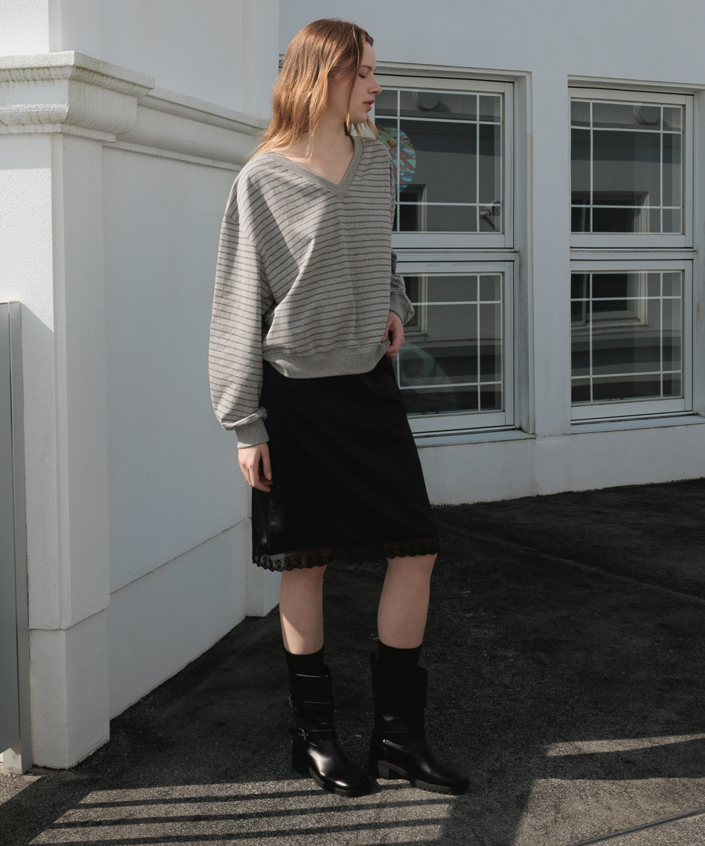 膝下まで落ちるミディ丈にレーストリミングを施し、ウエストラインにもレースポイントを加えてディテールの完成度を高めました。