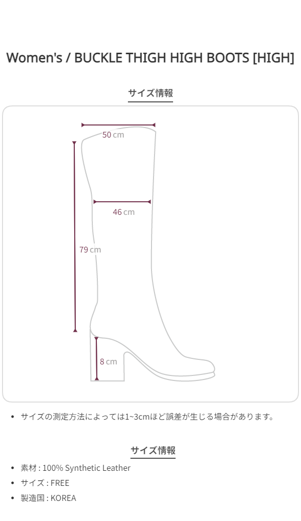 ブーツ丈79cm、ふくらはぎ周り46cm、履き口周り最大50cm
