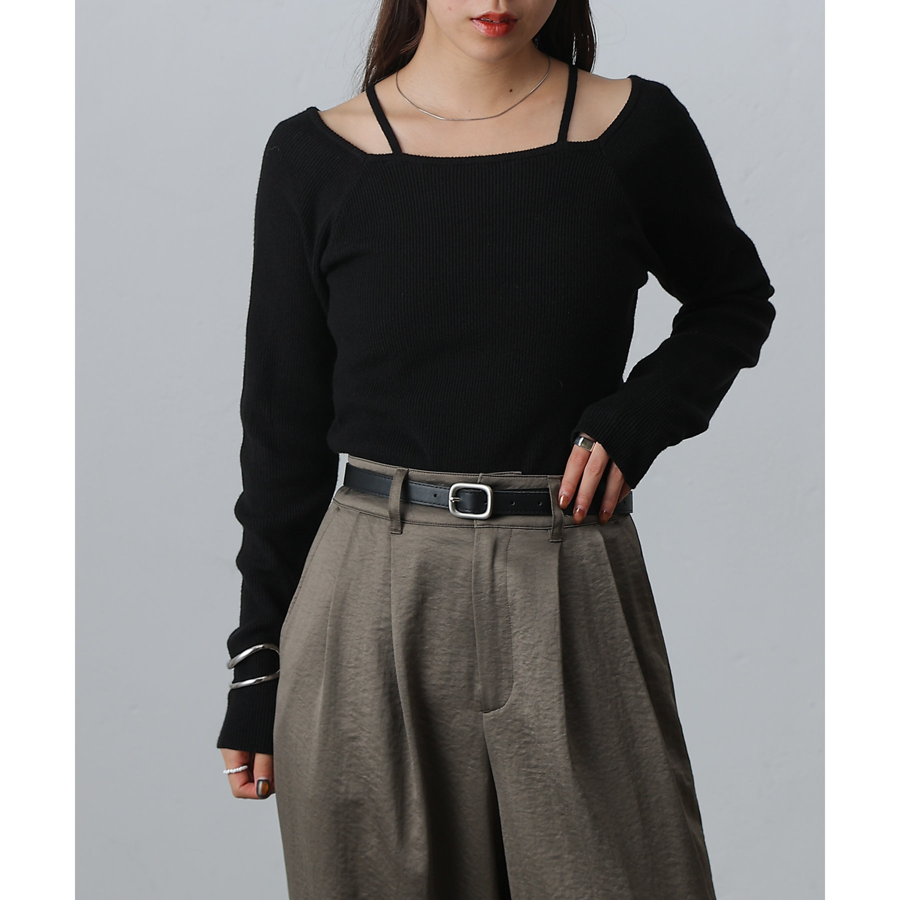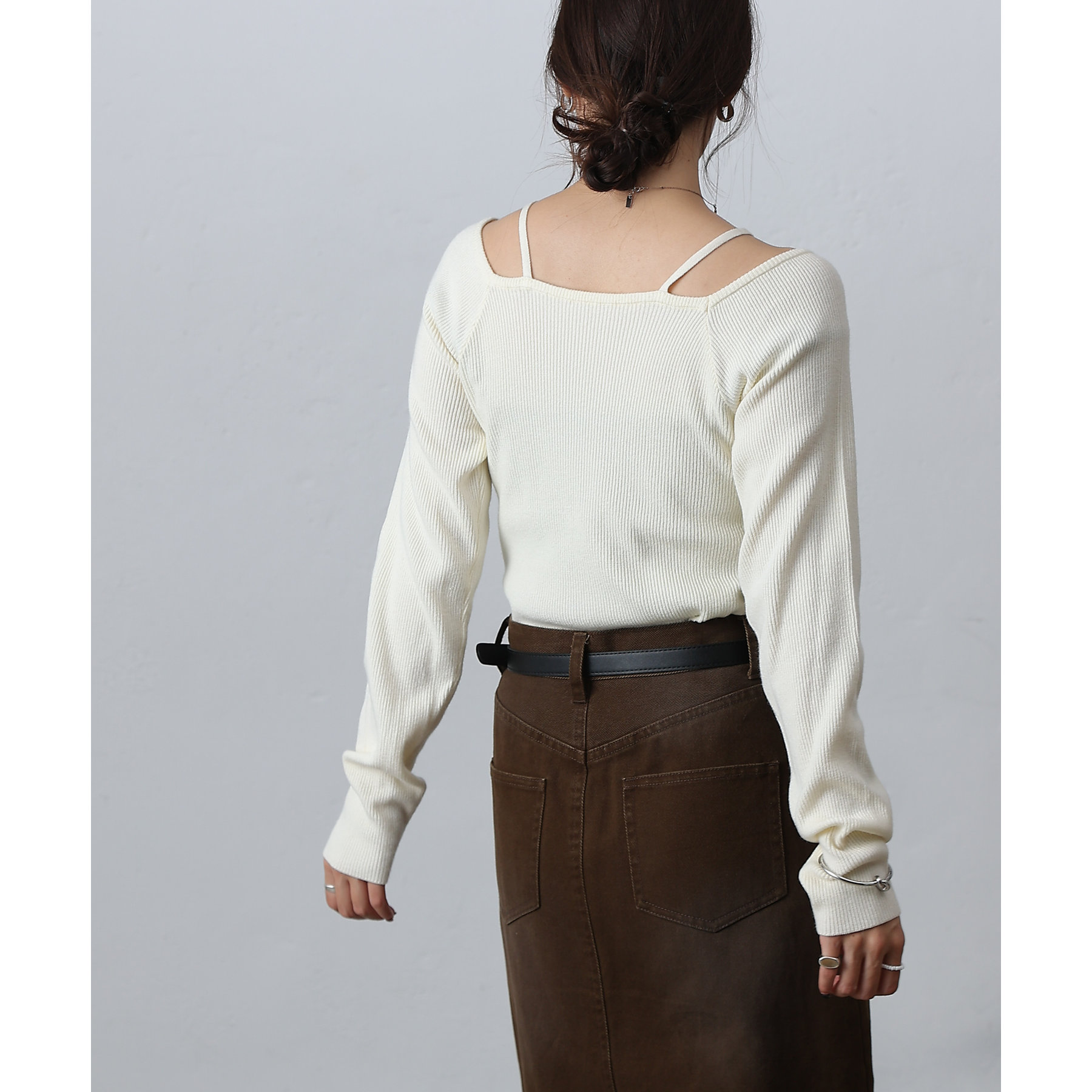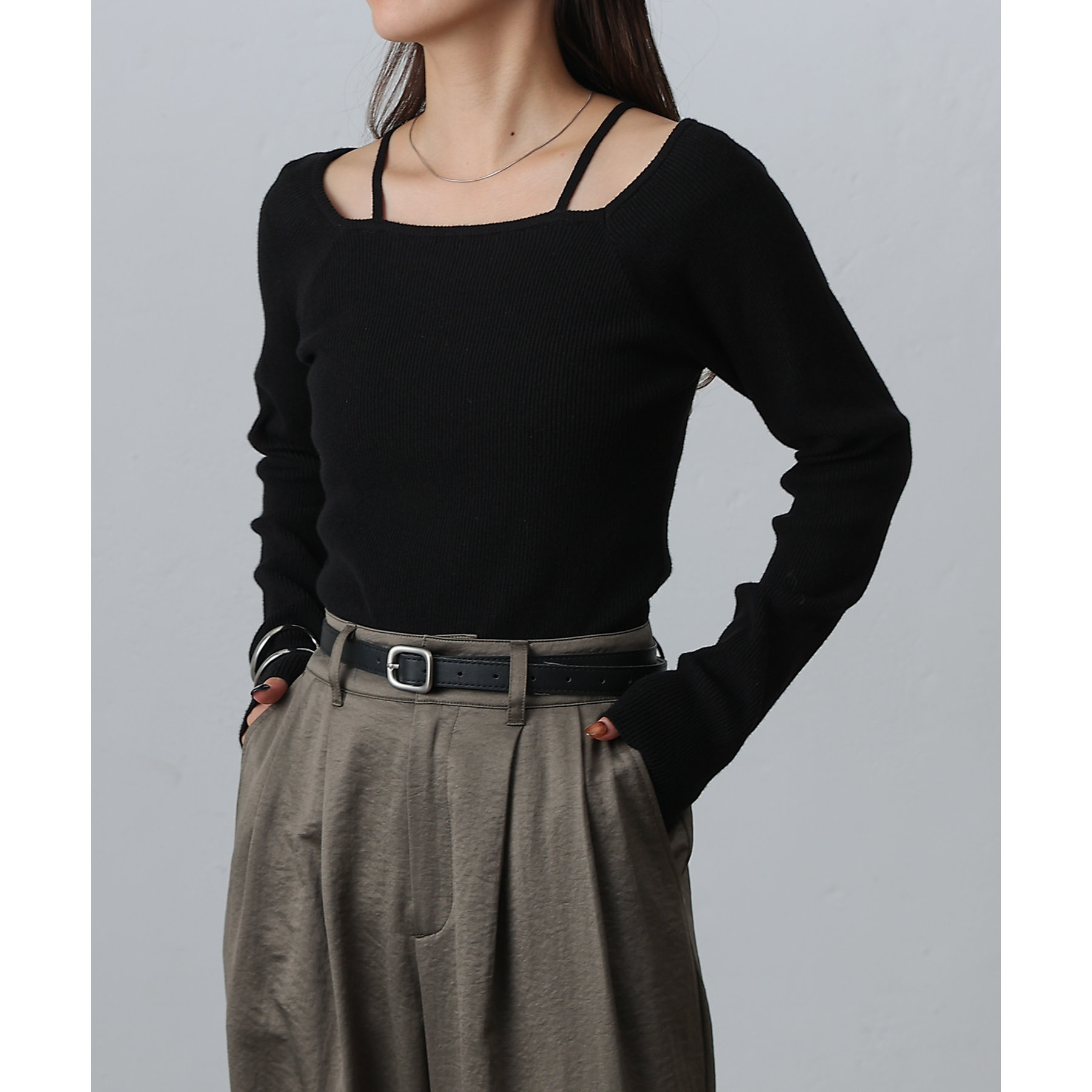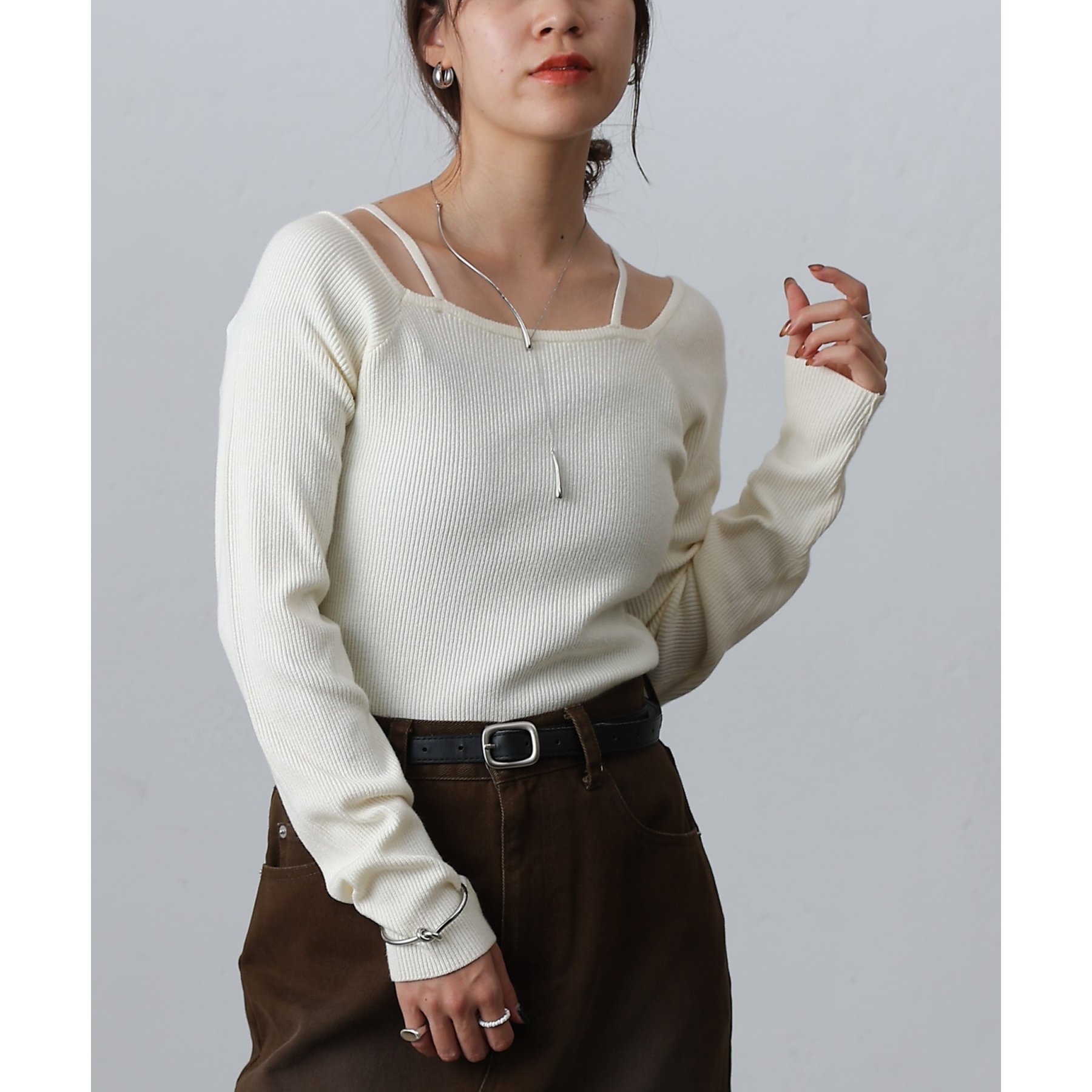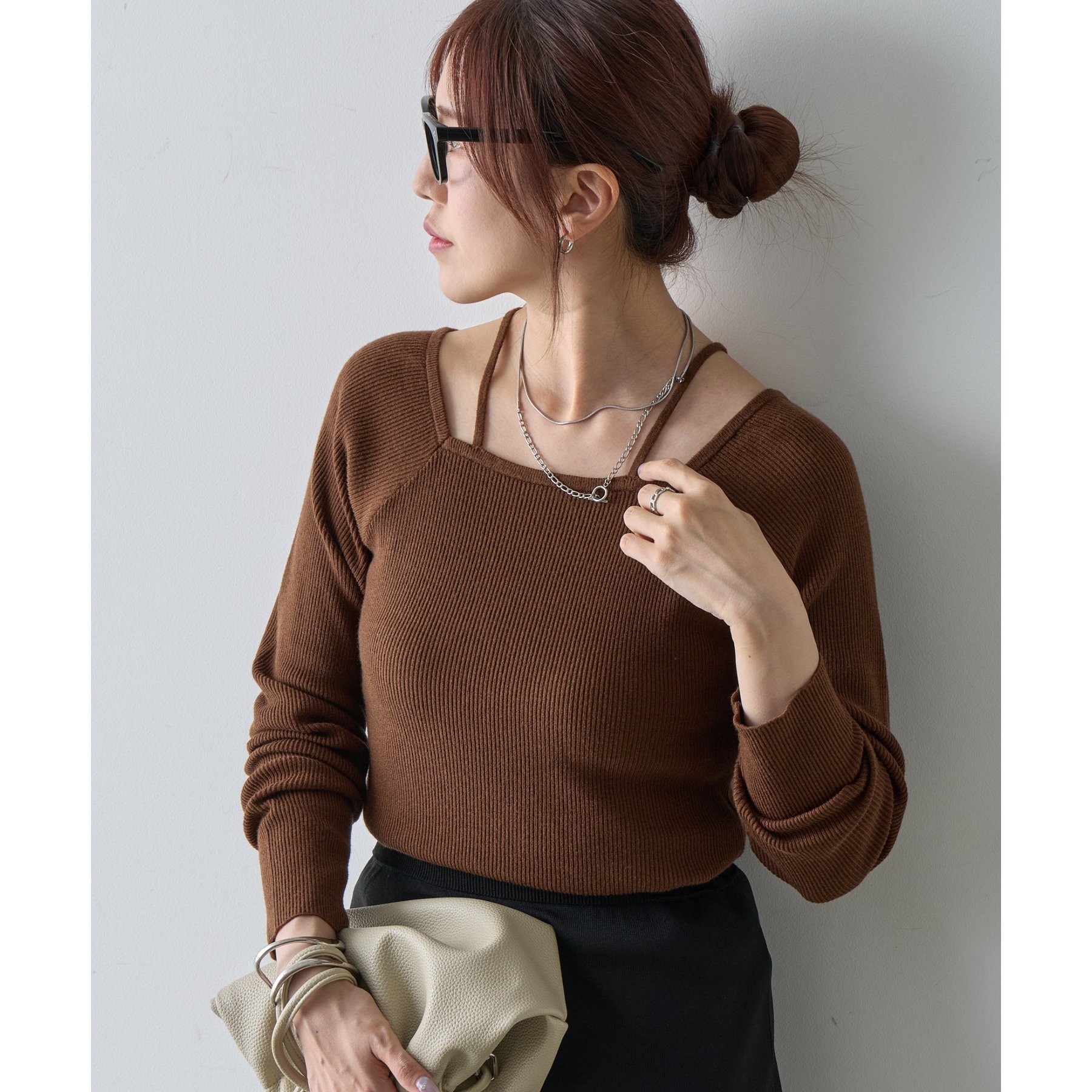大きめのスクエアネックにレイヤード風の紐デザインが特徴のニット