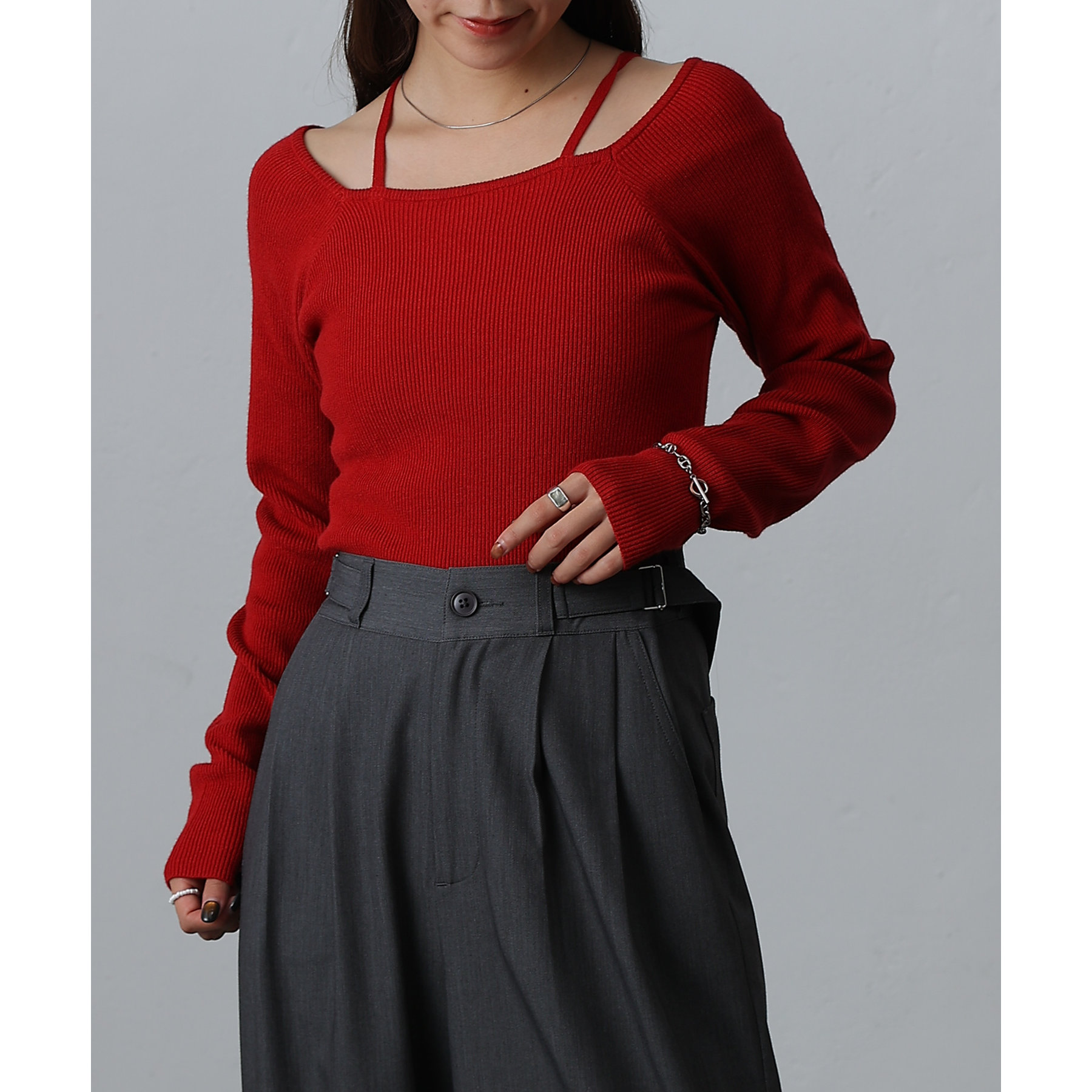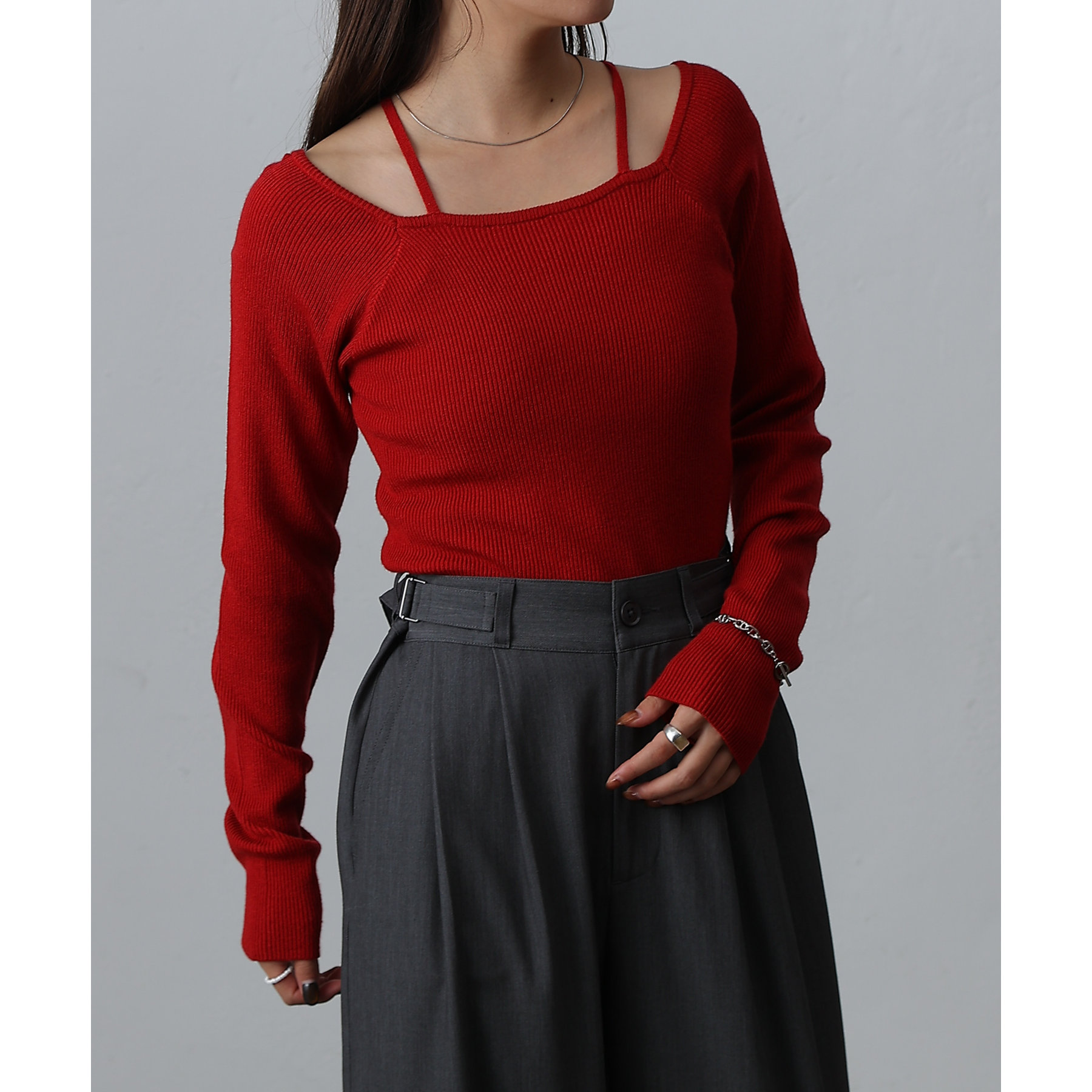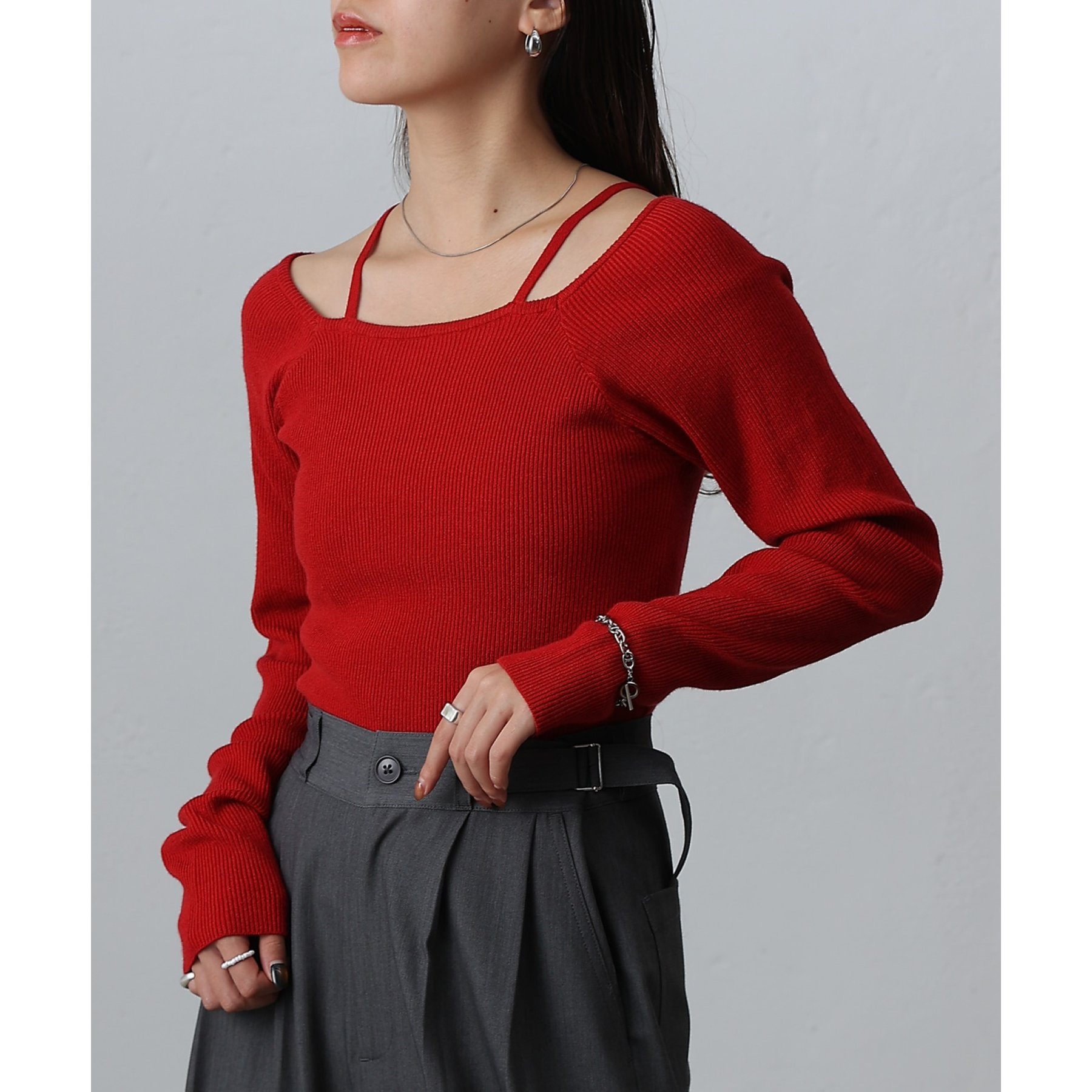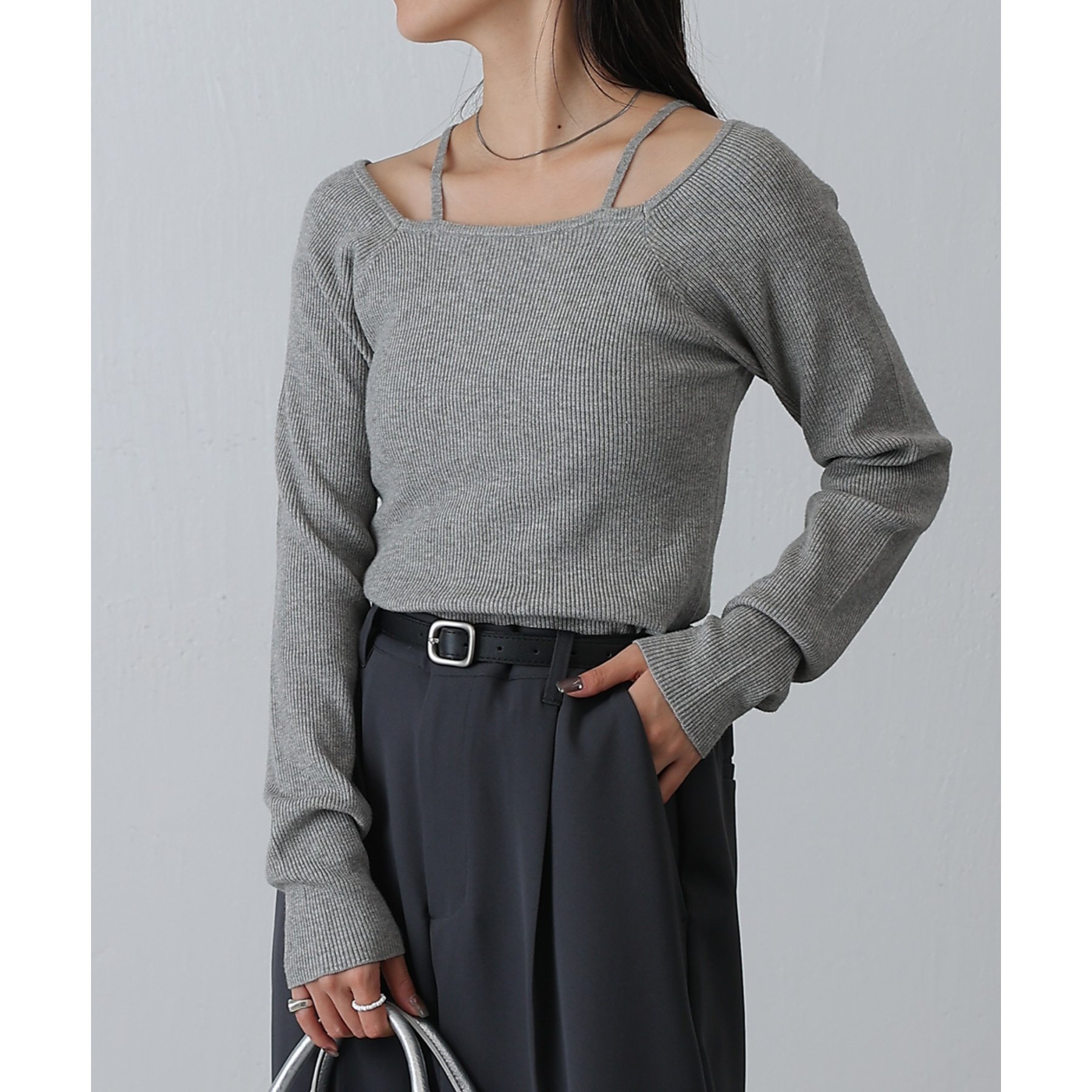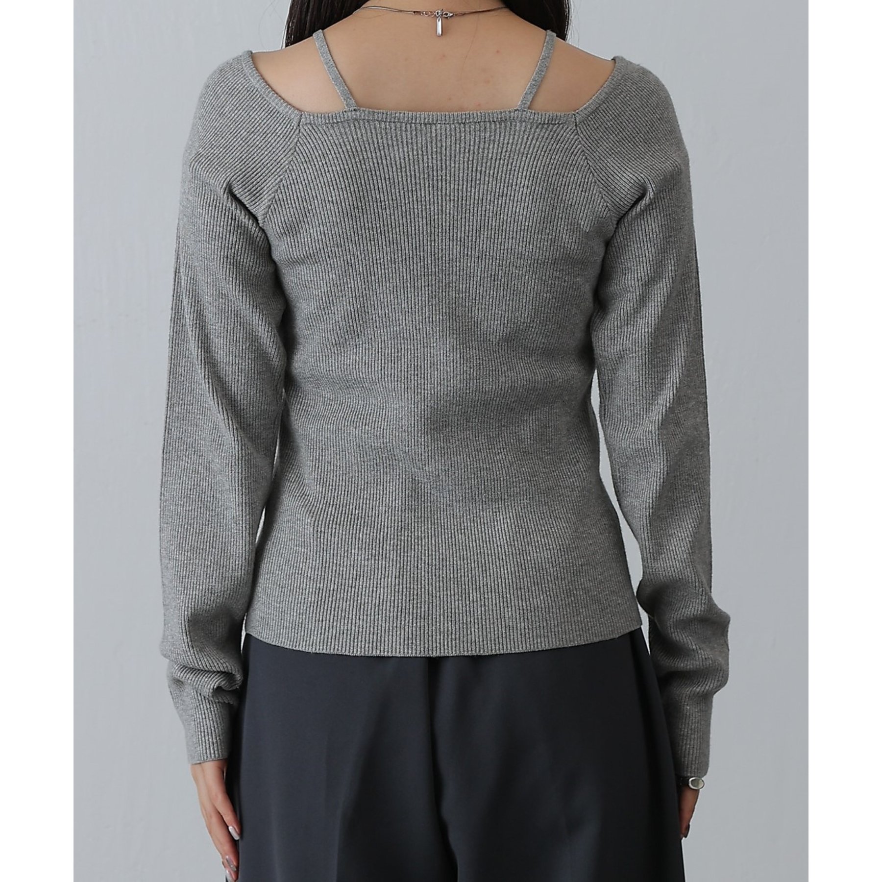 大きめのスクエアネックにレイヤード風の紐デザインが特徴のニット