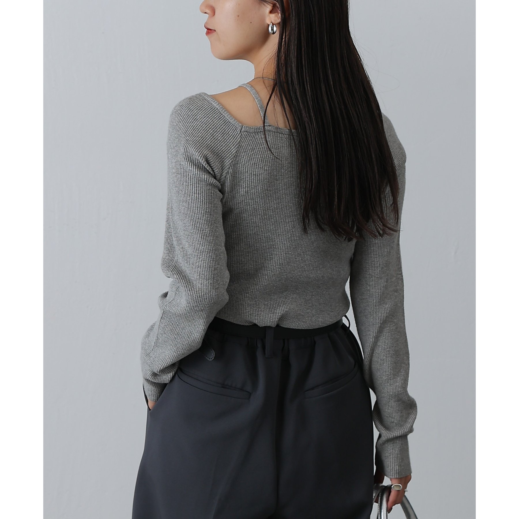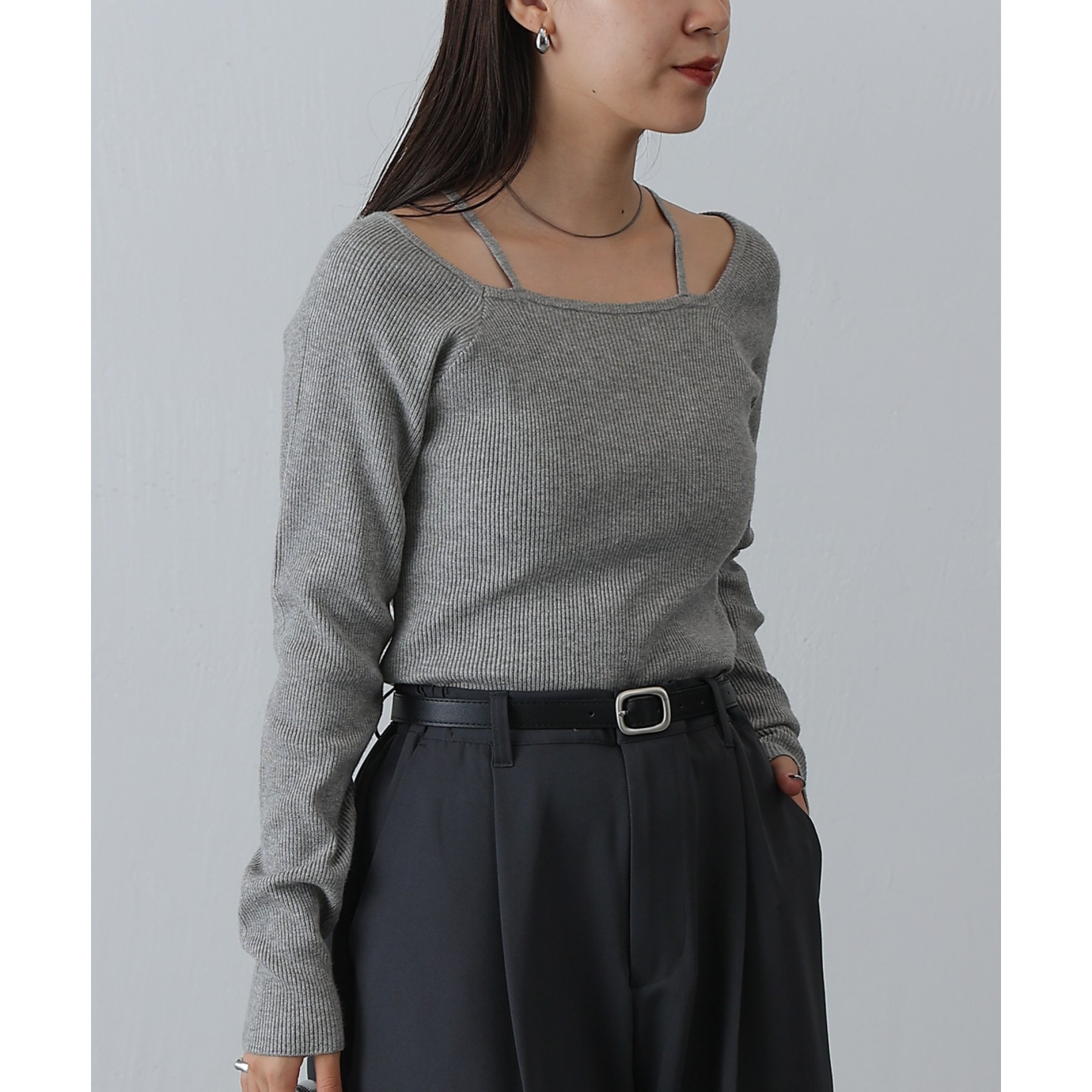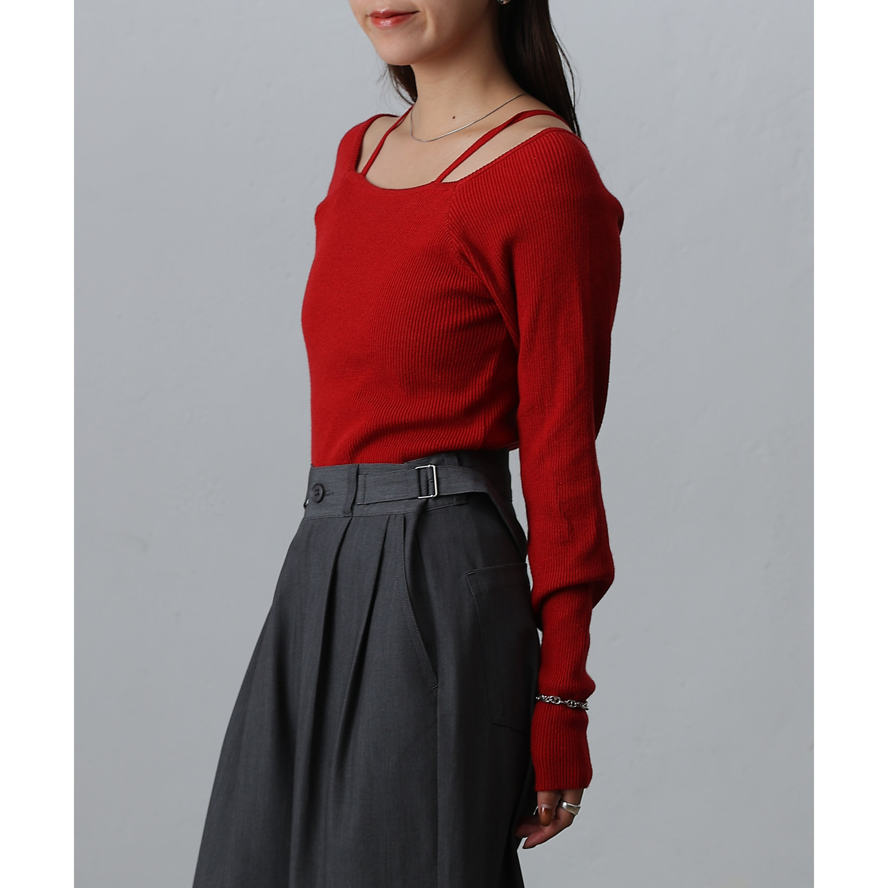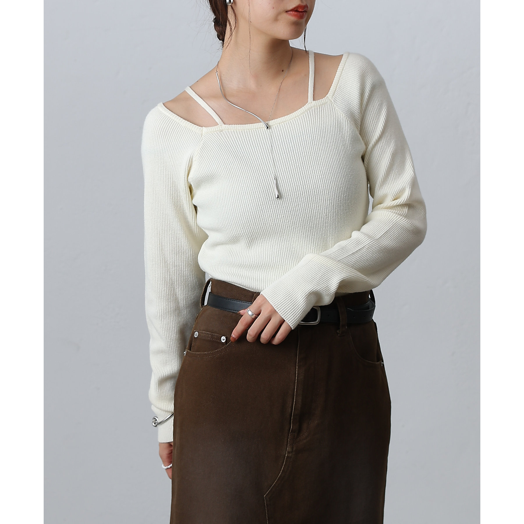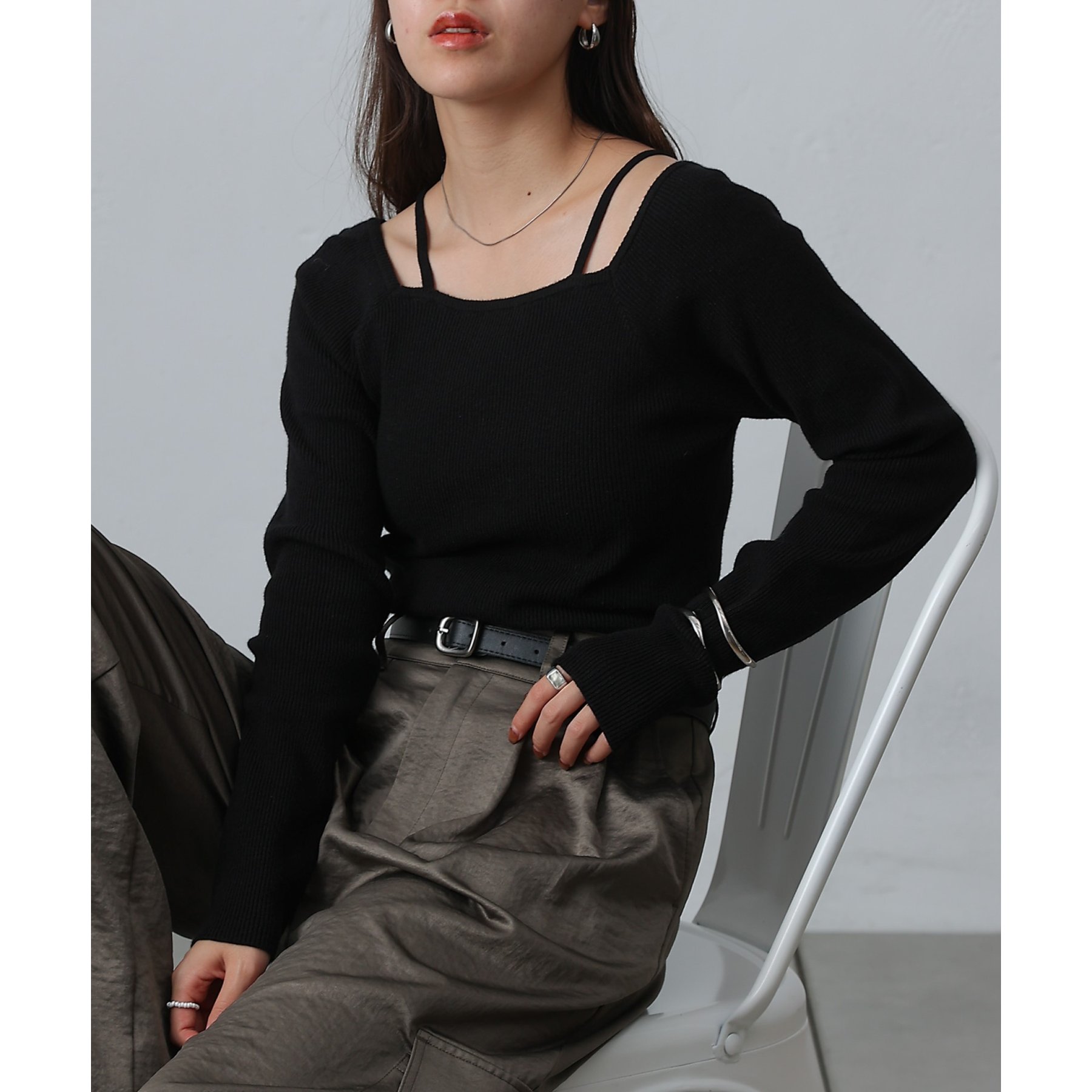大きめのスクエアネックにレイヤード風の紐デザインが特徴のニット