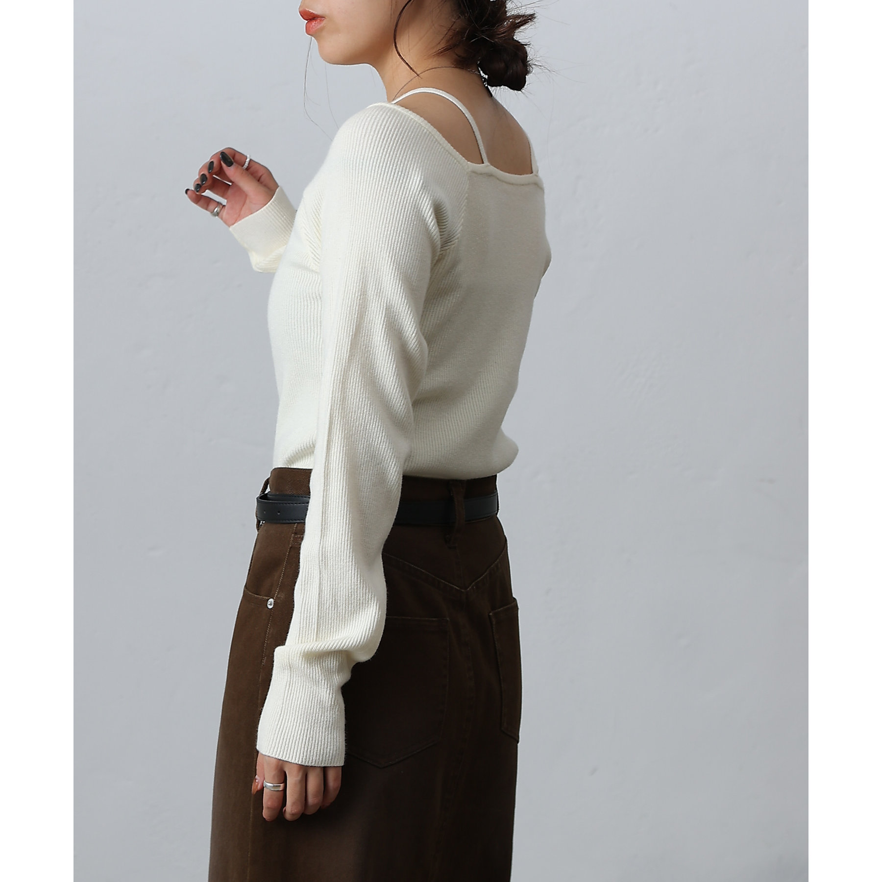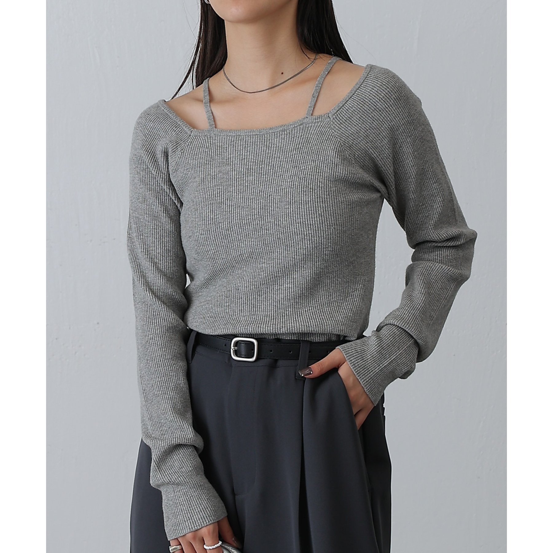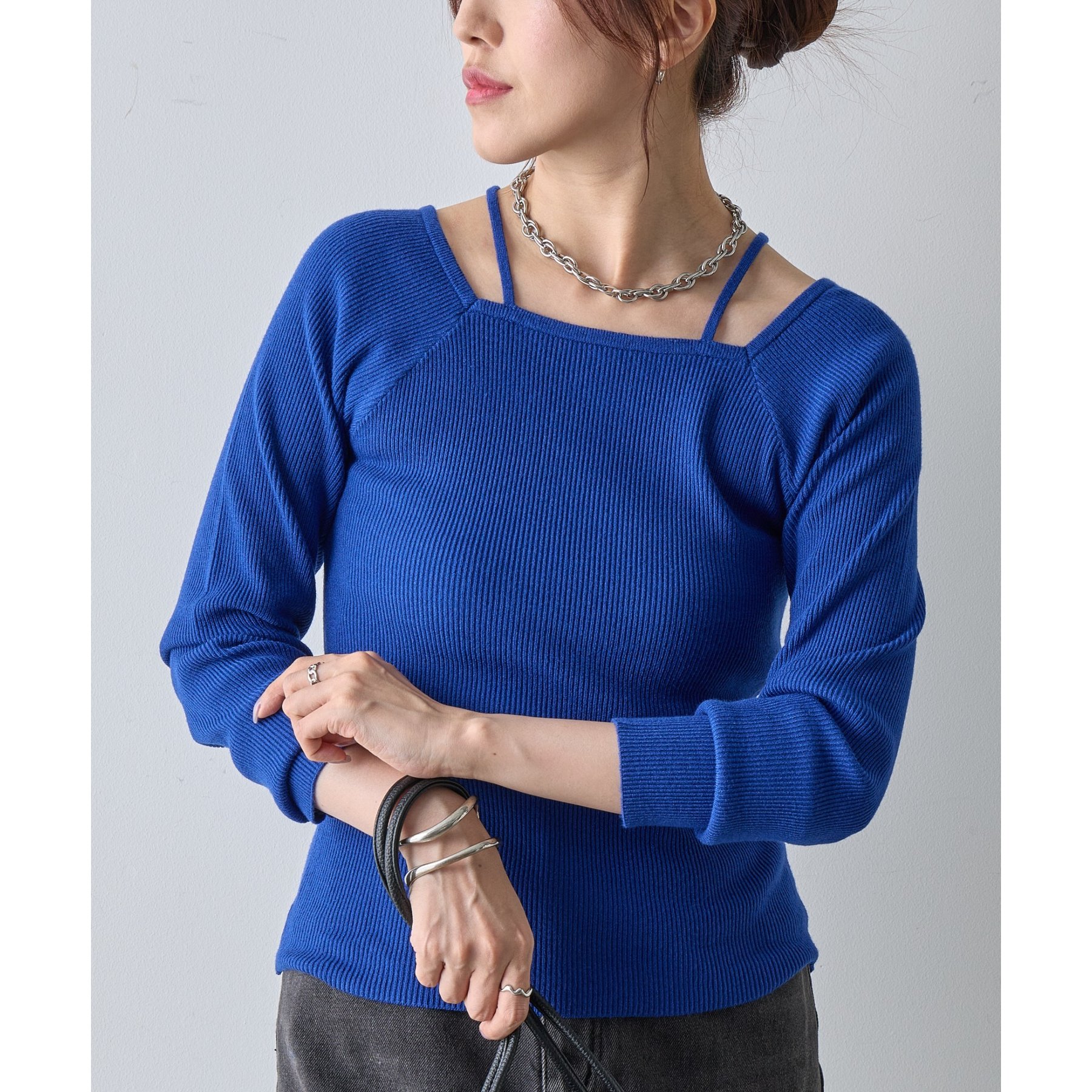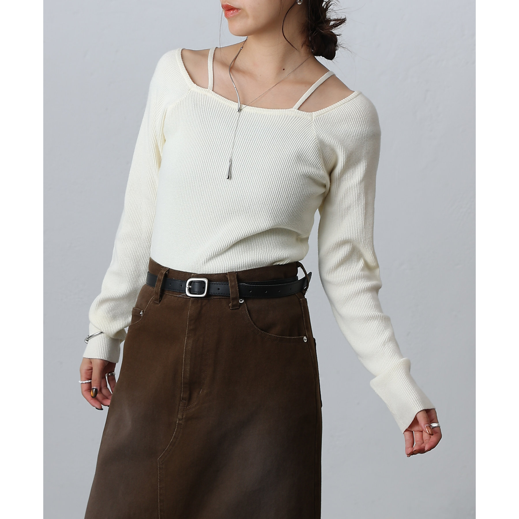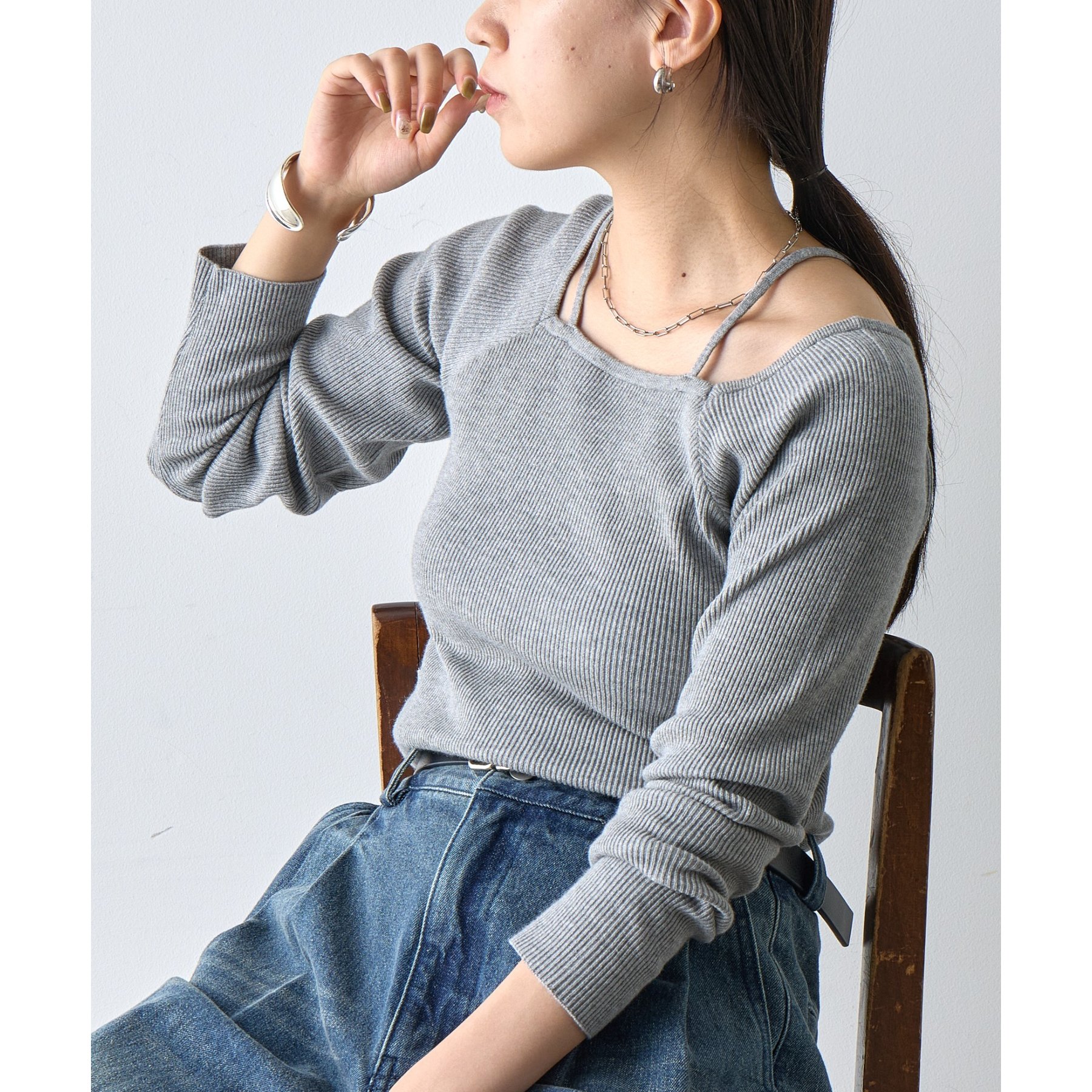 大きめのスクエアネックにレイヤード風の紐デザインが特徴のニット