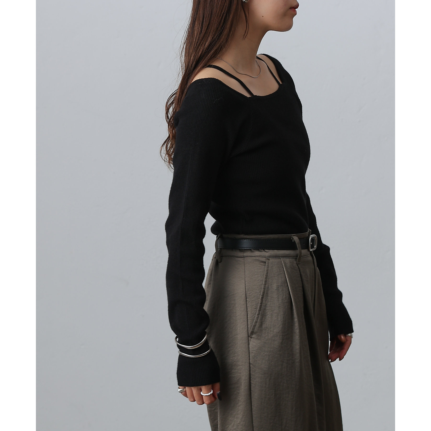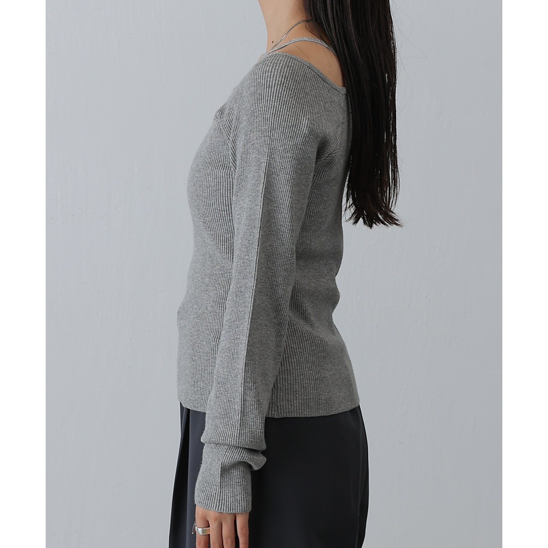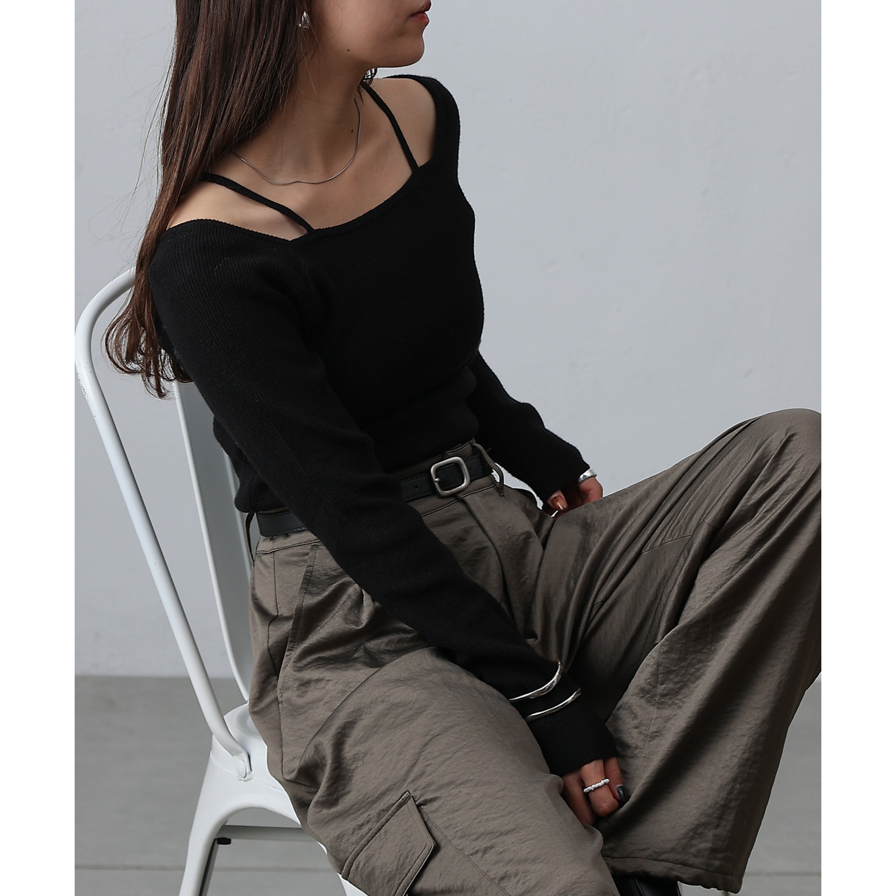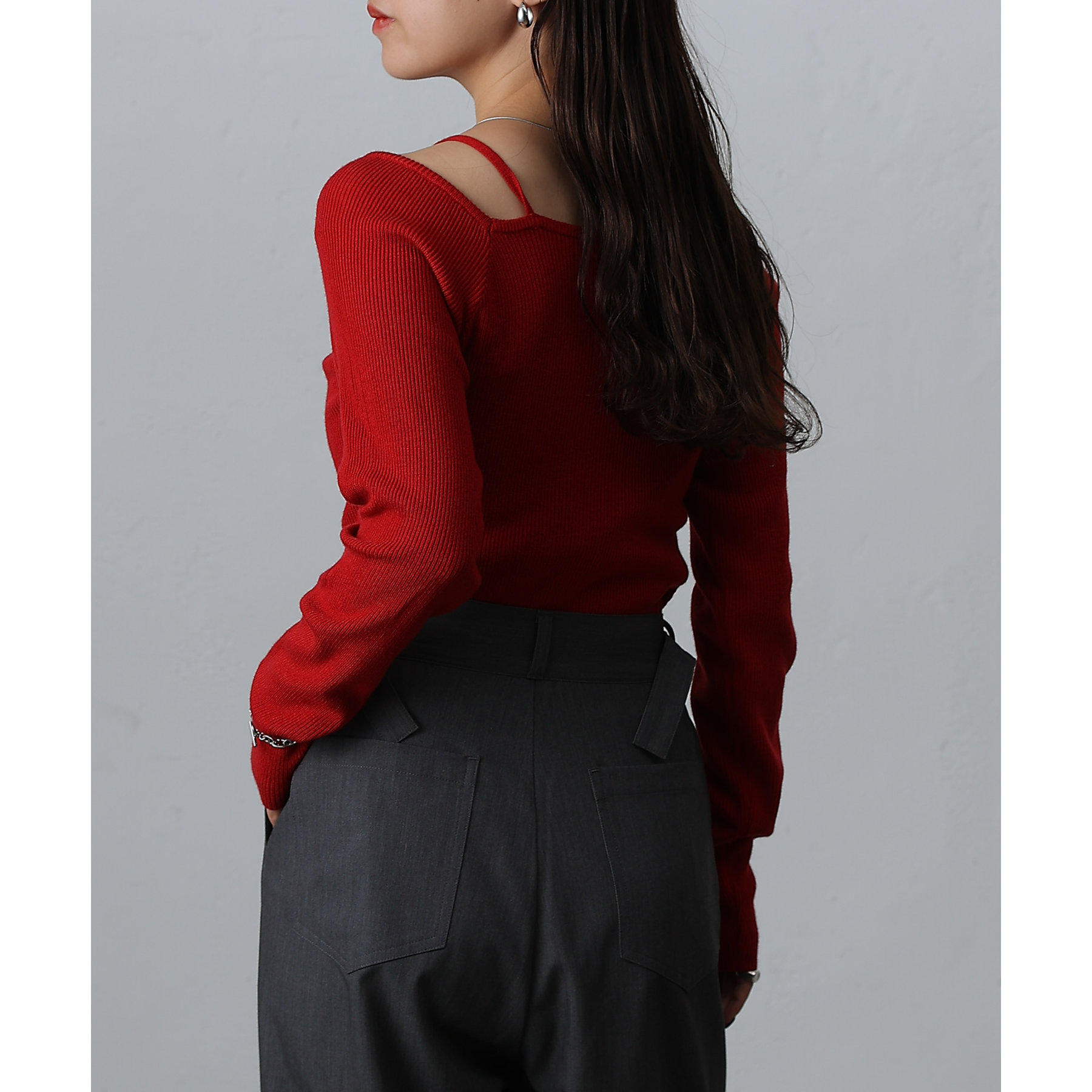 大きめのスクエアネックにレイヤード風の紐デザインが特徴のニット
