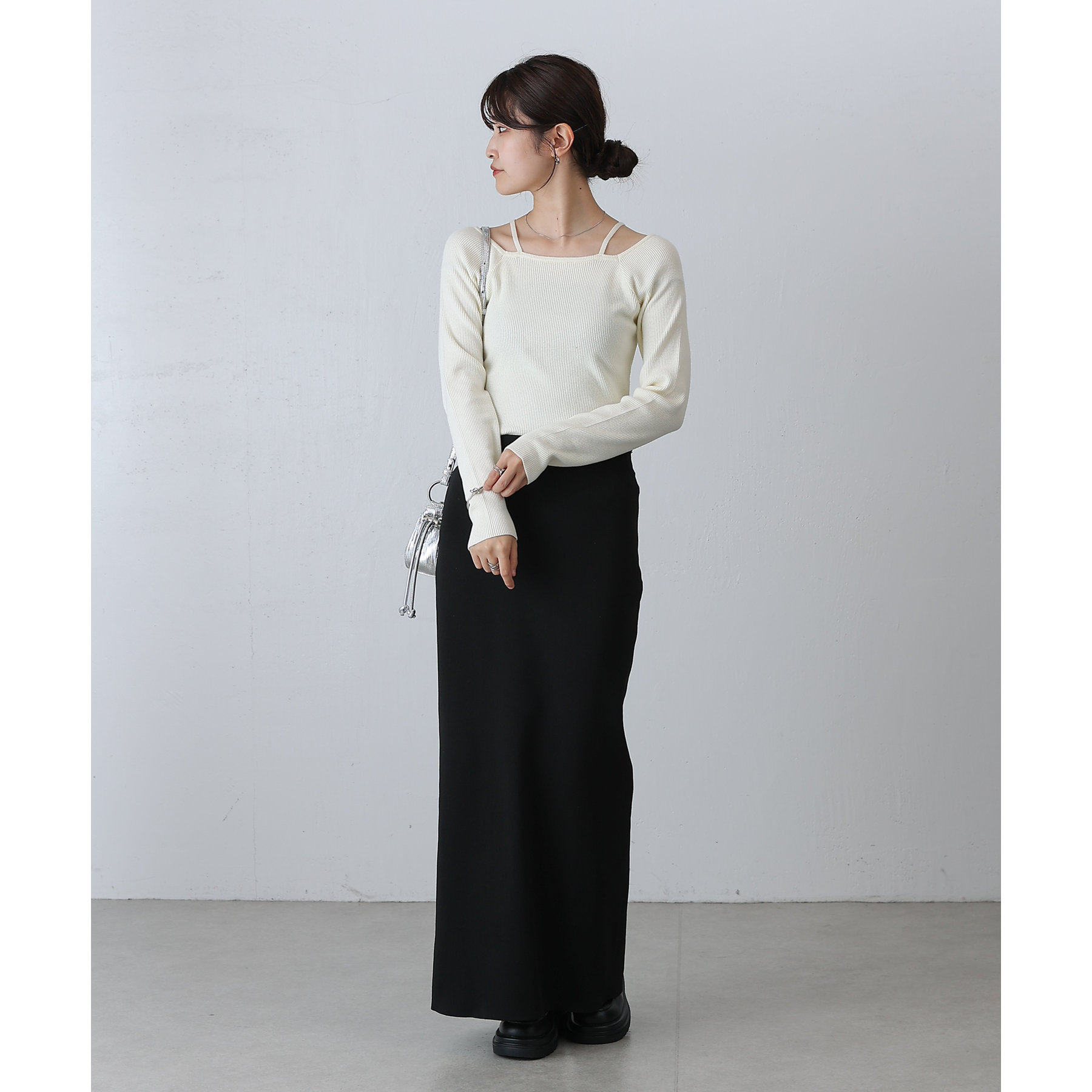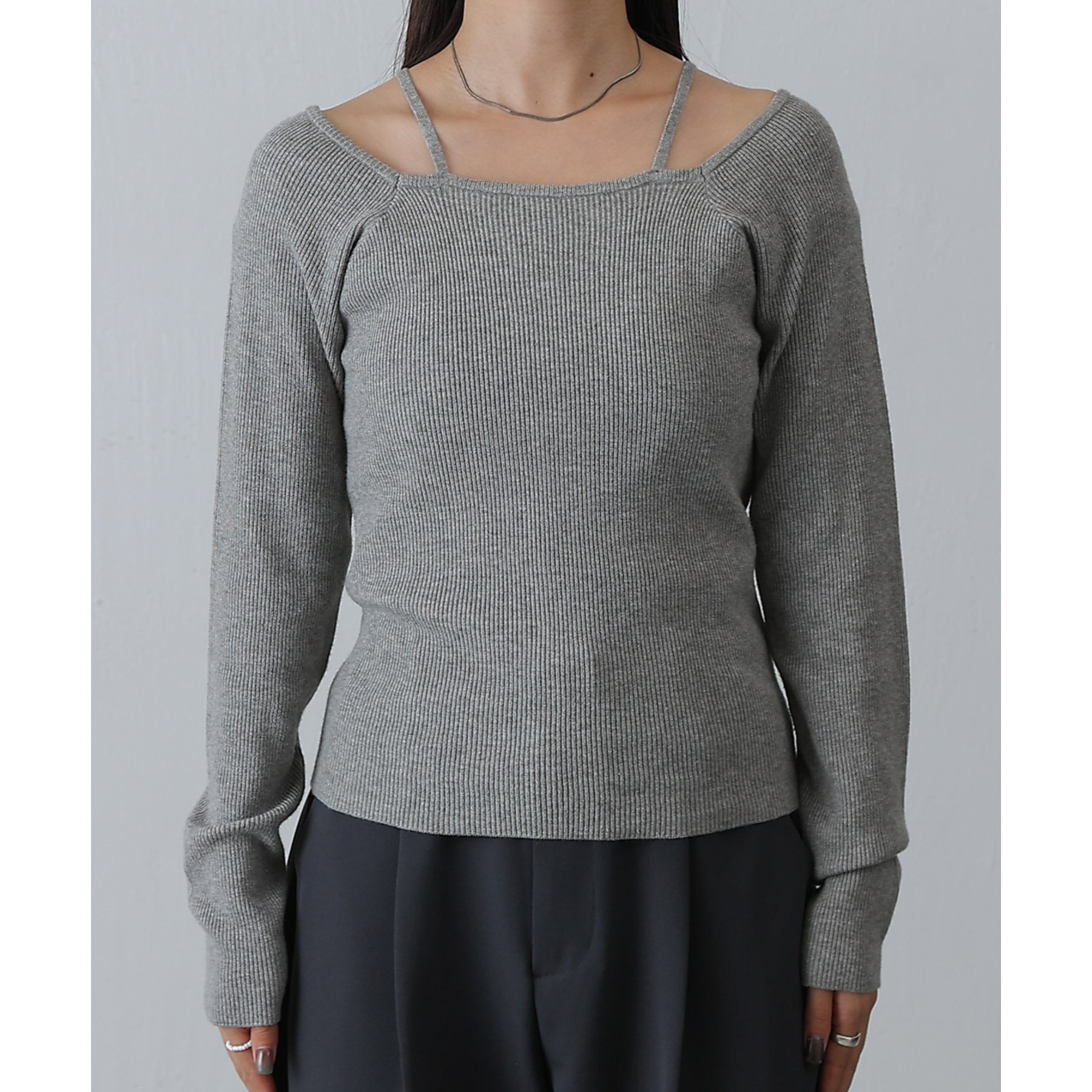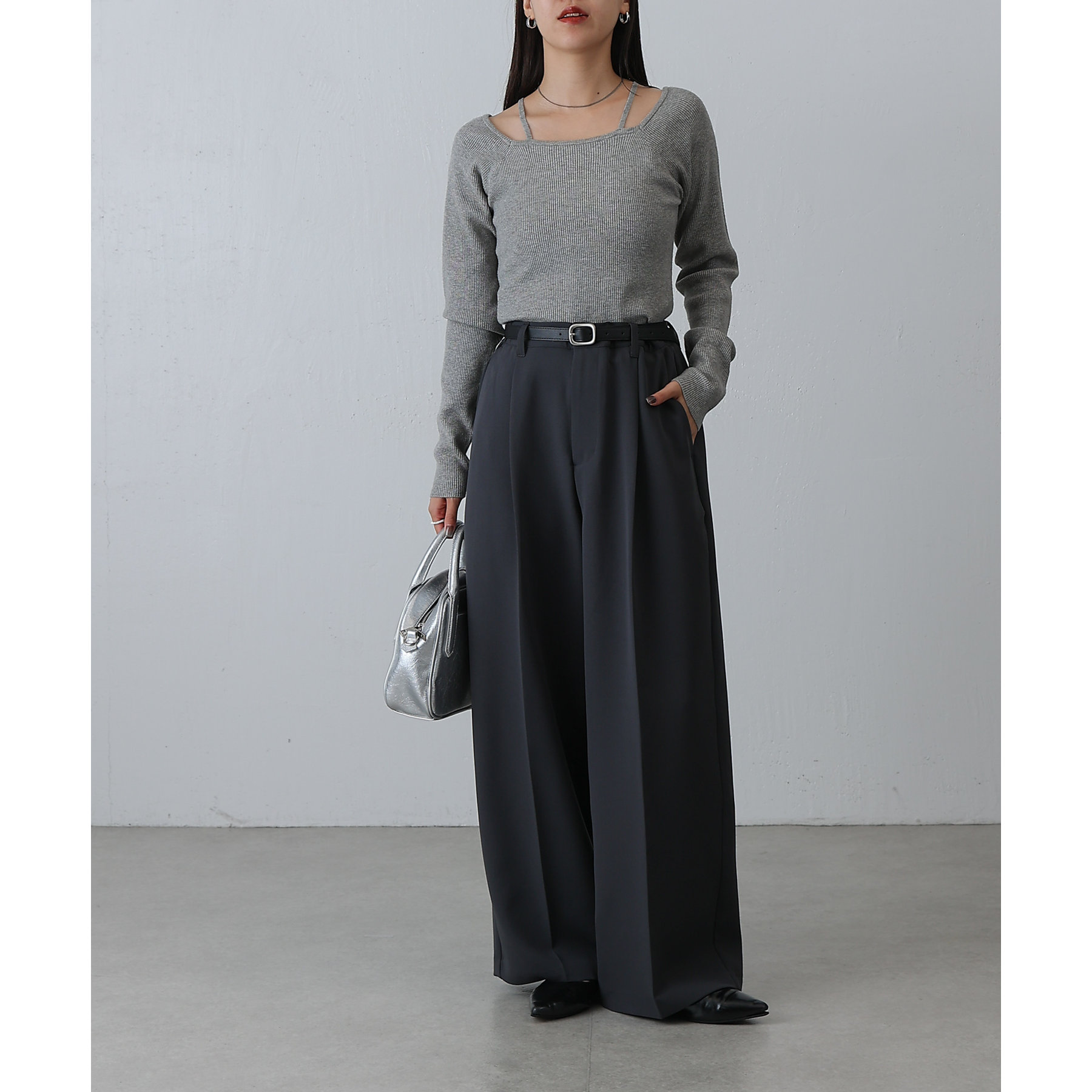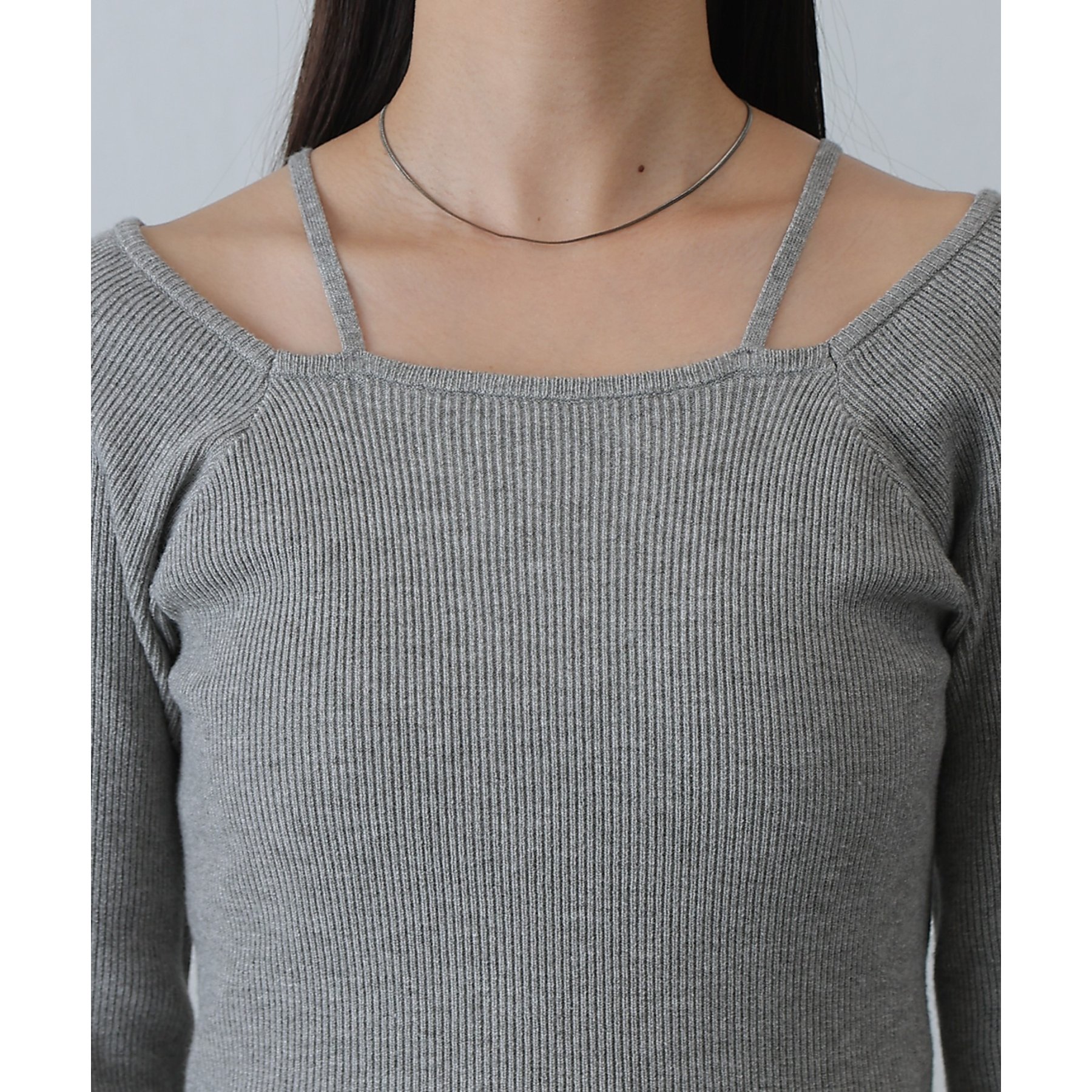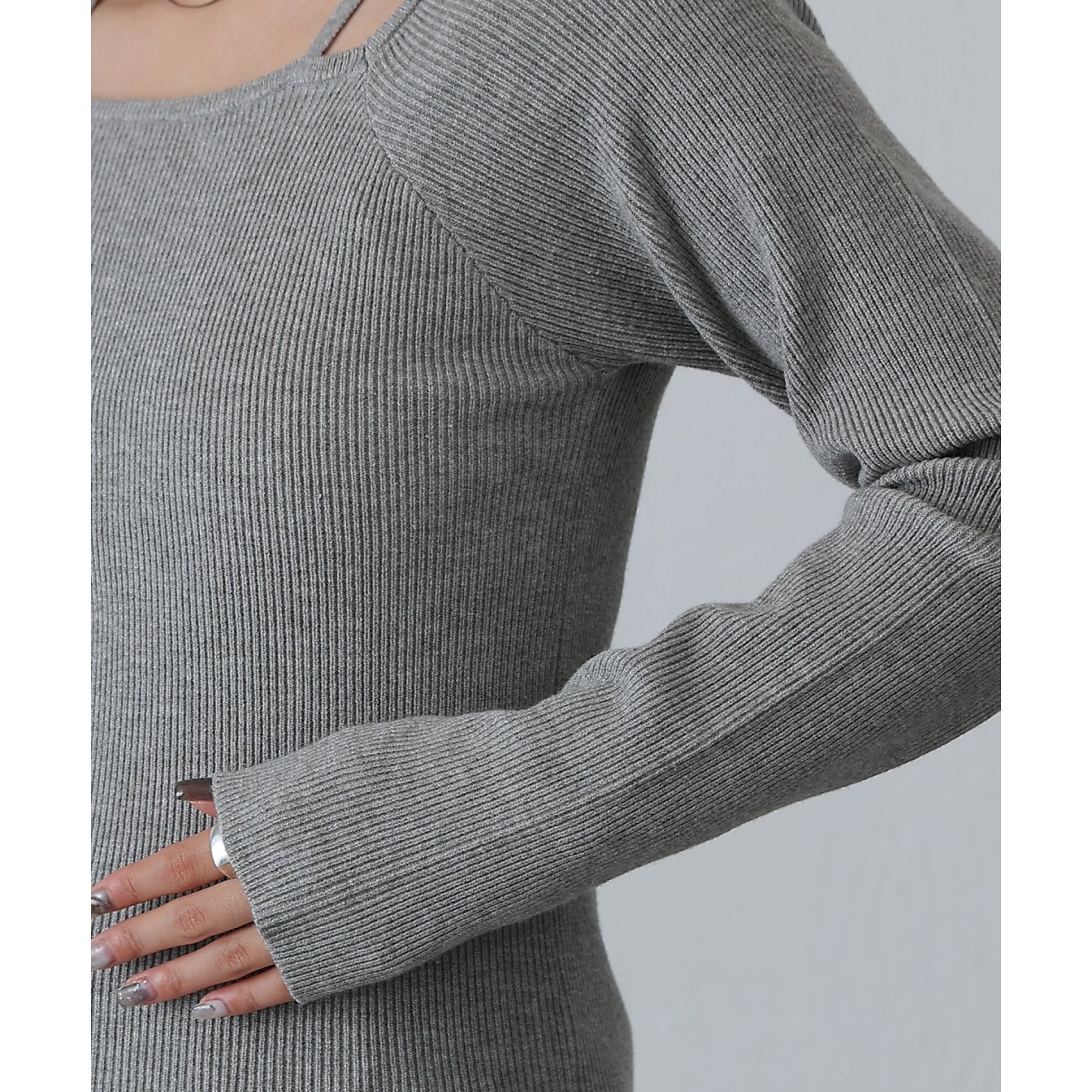 大きめのスクエアネックにレイヤード風の紐デザインが特徴のニット
