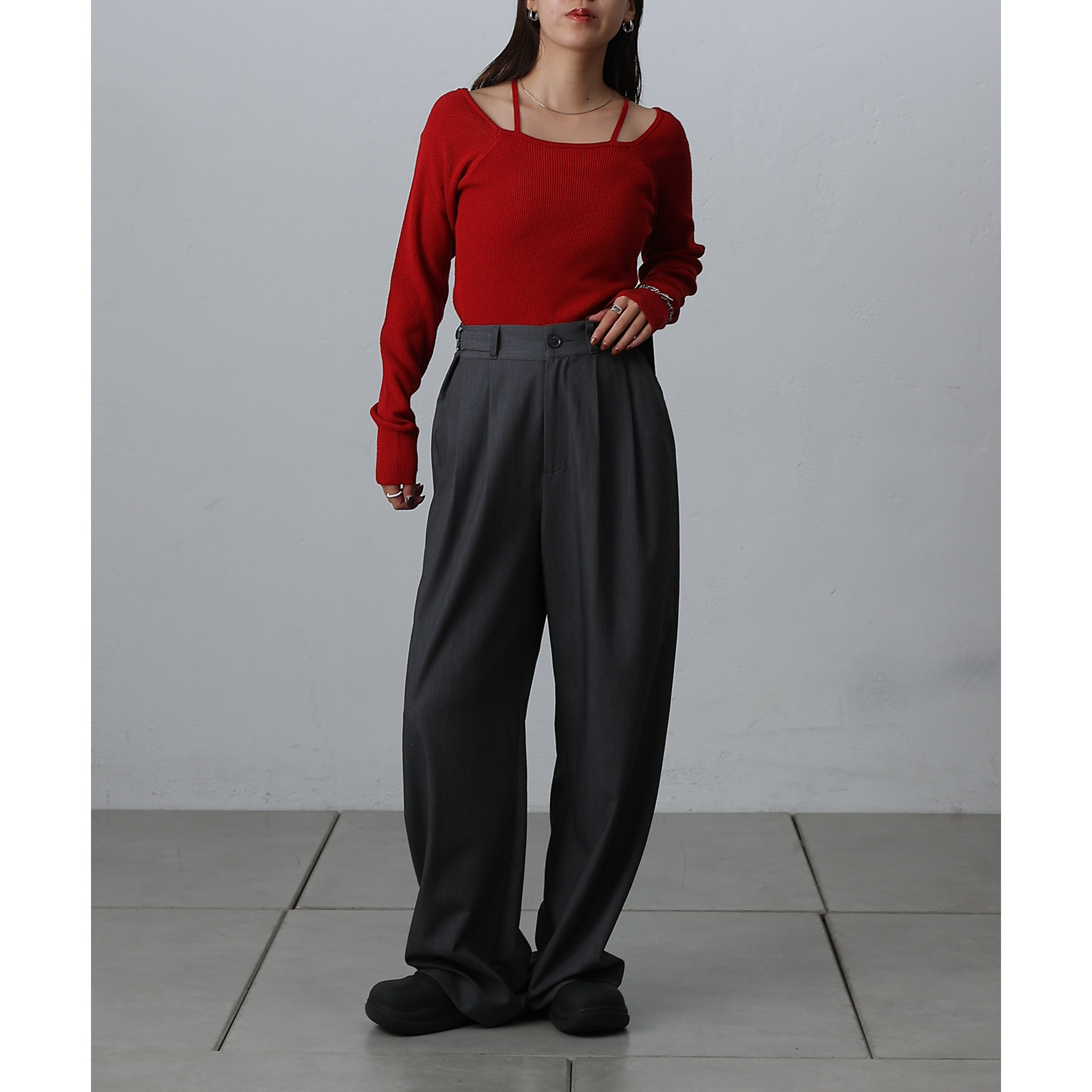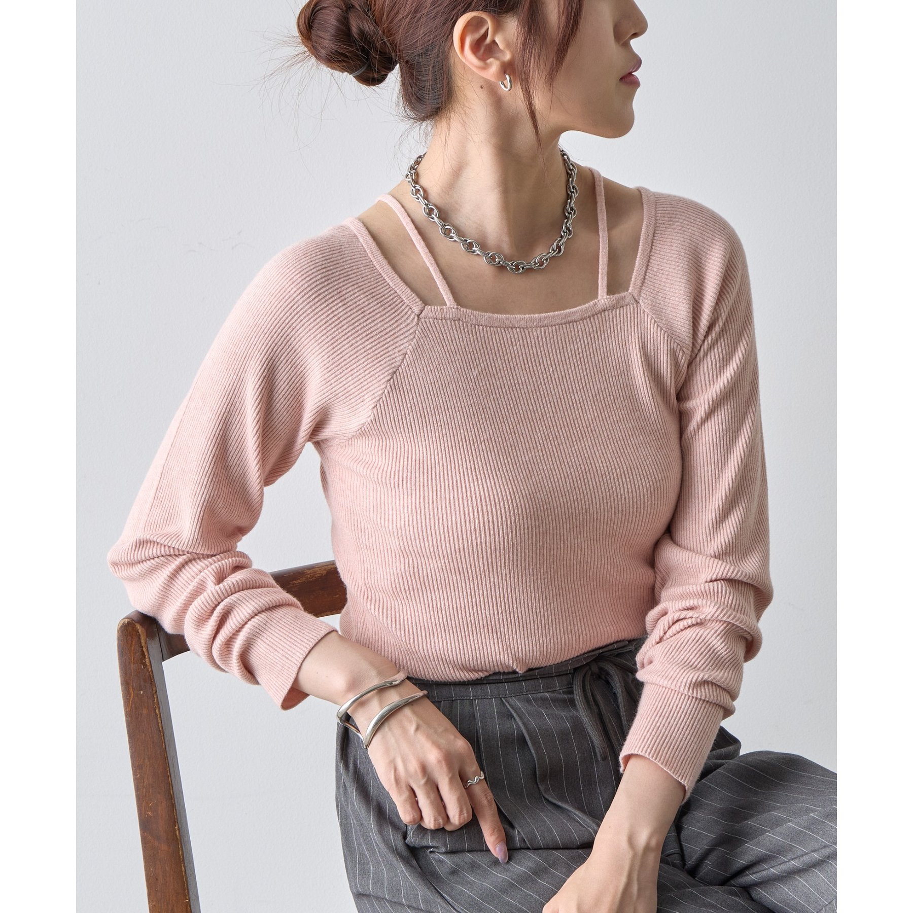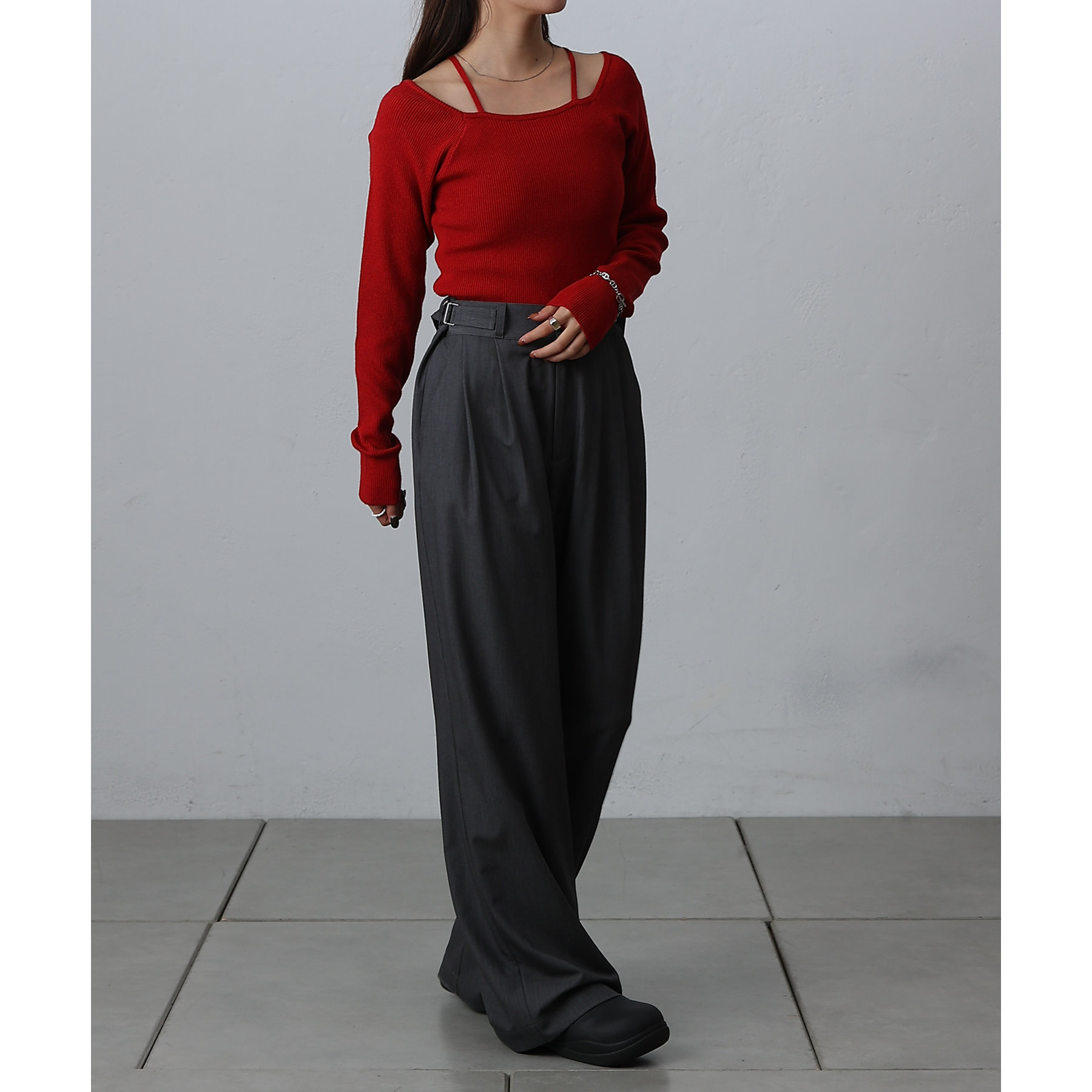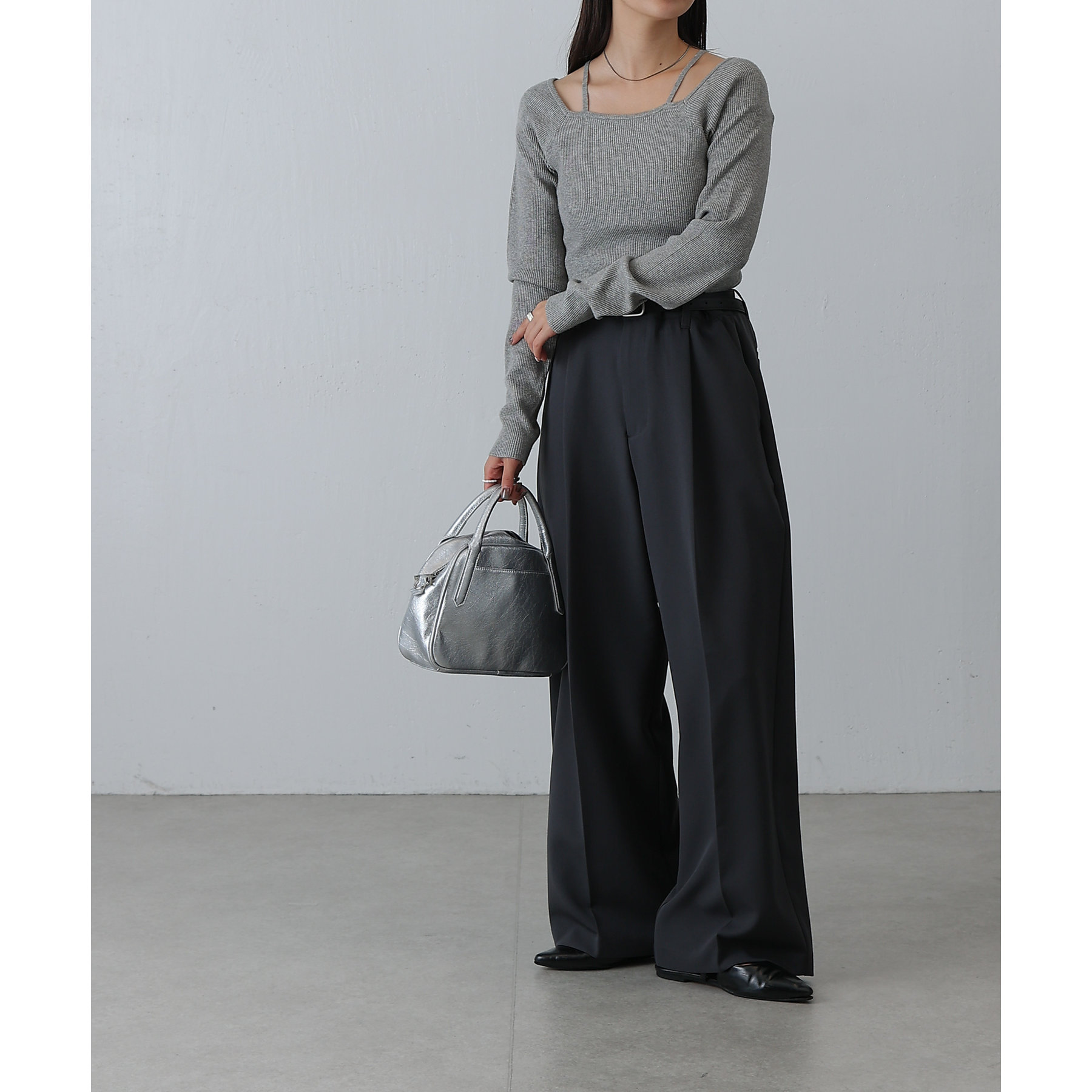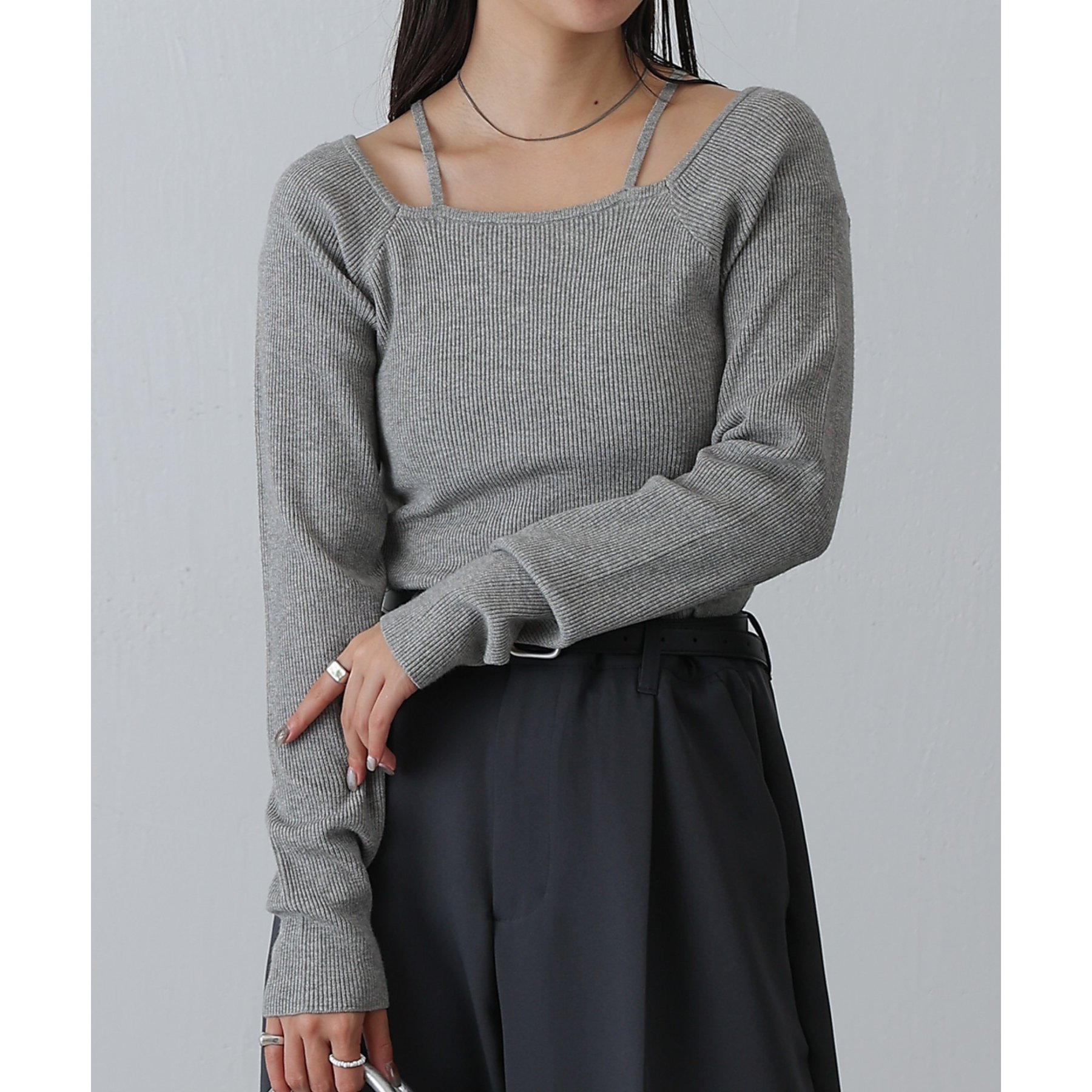 大きめのスクエアネックにレイヤード風の紐デザインが特徴のニット
