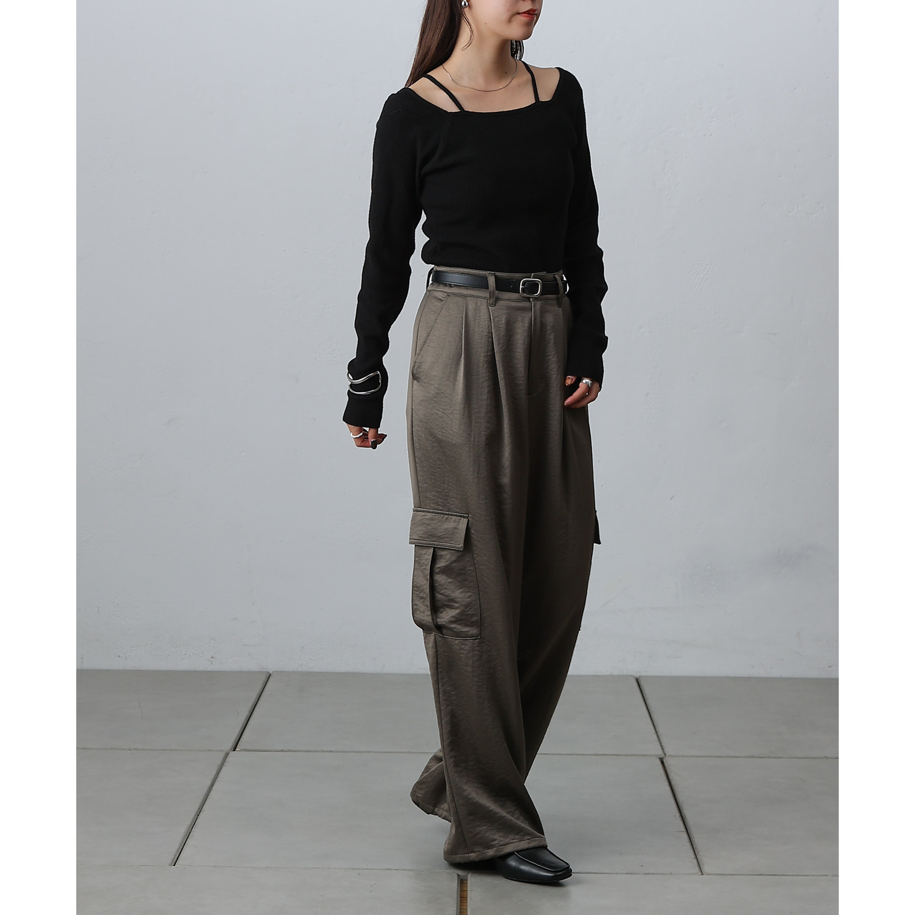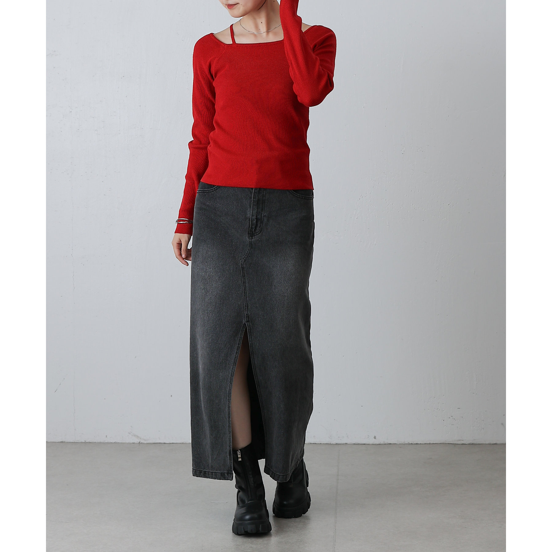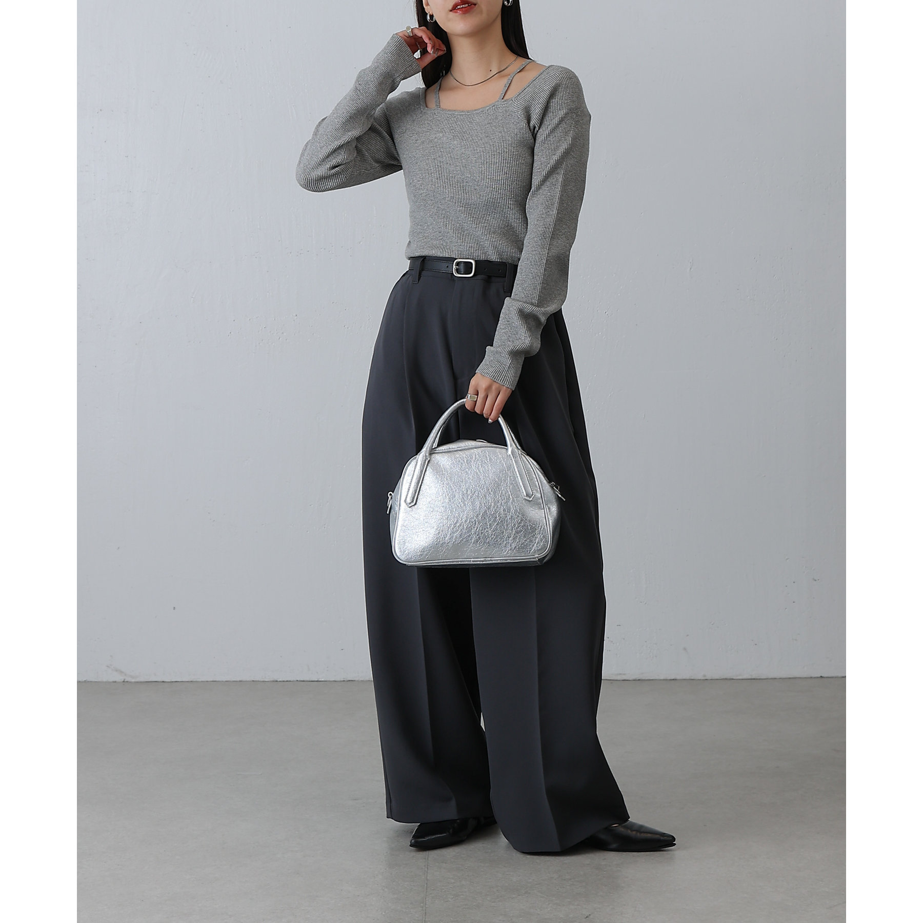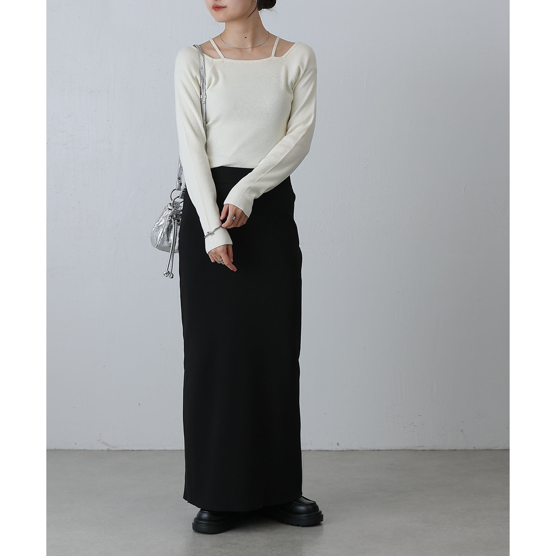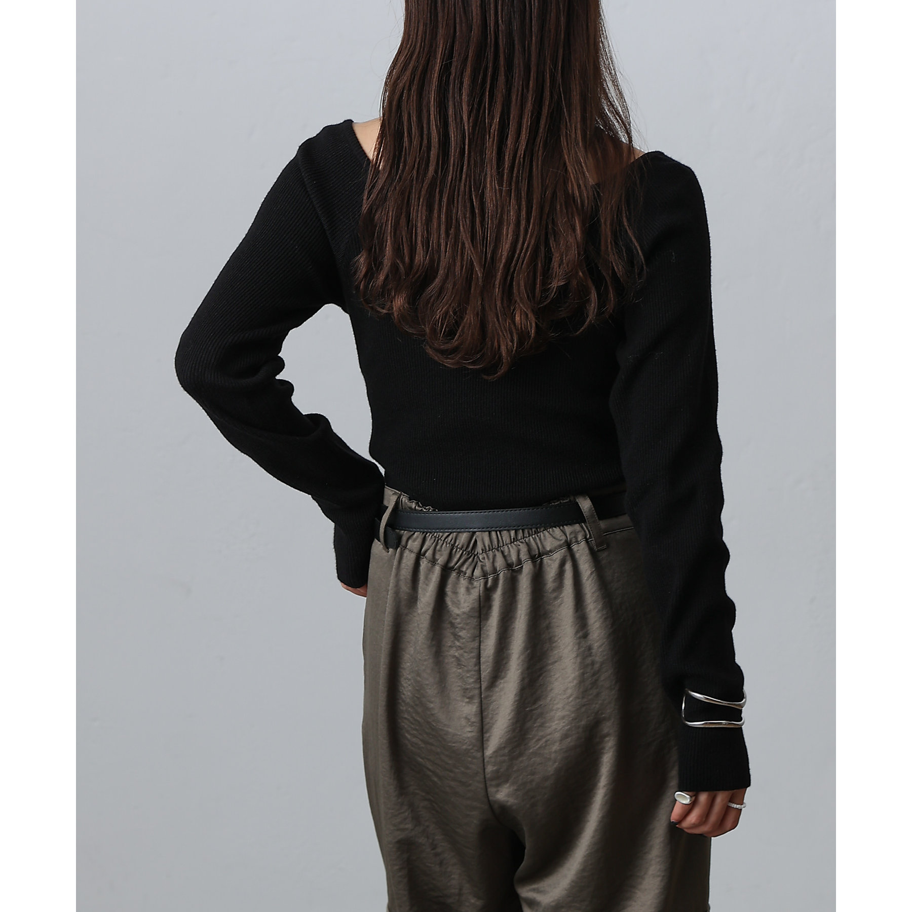 大きめのスクエアネックにレイヤード風の紐デザインが特徴のニット