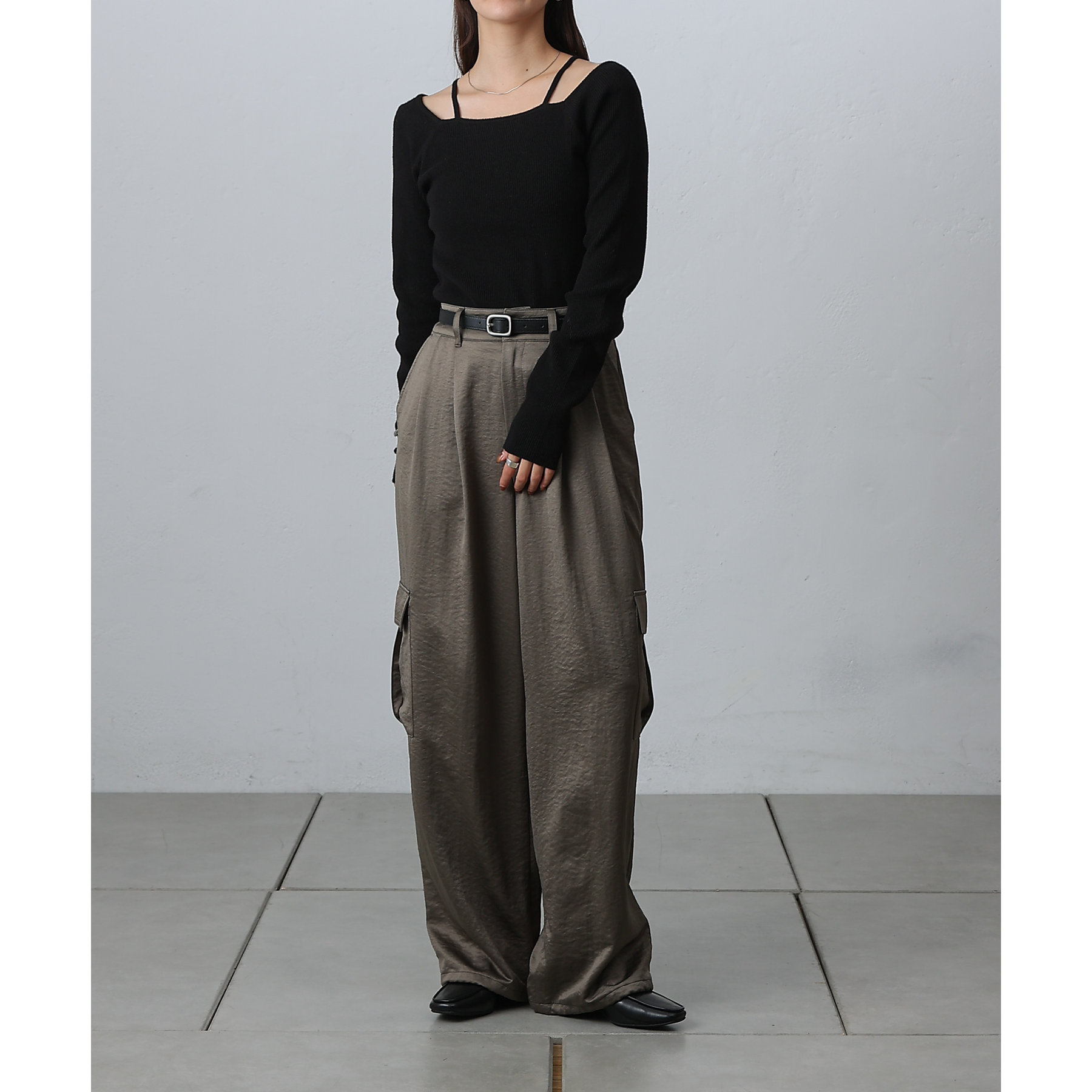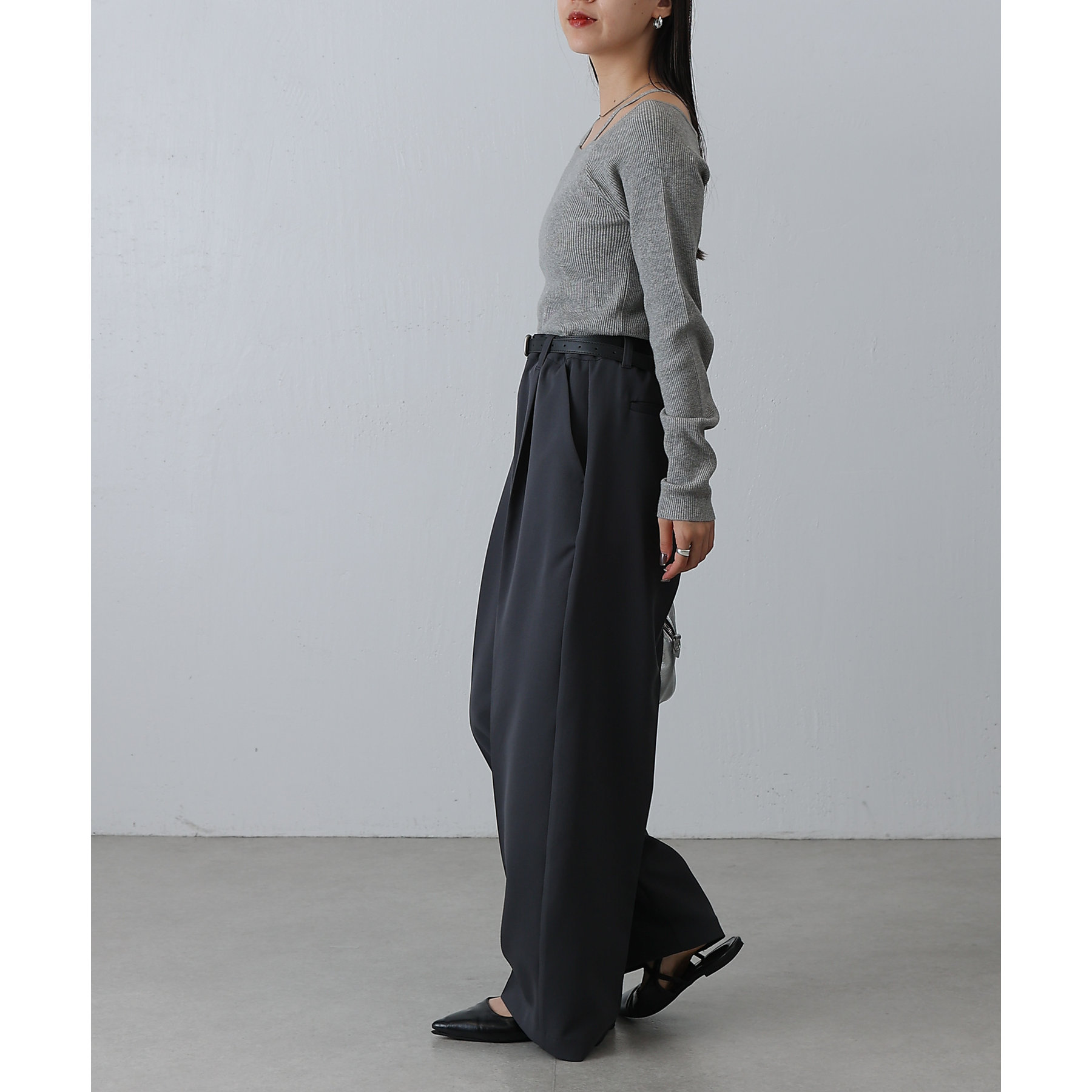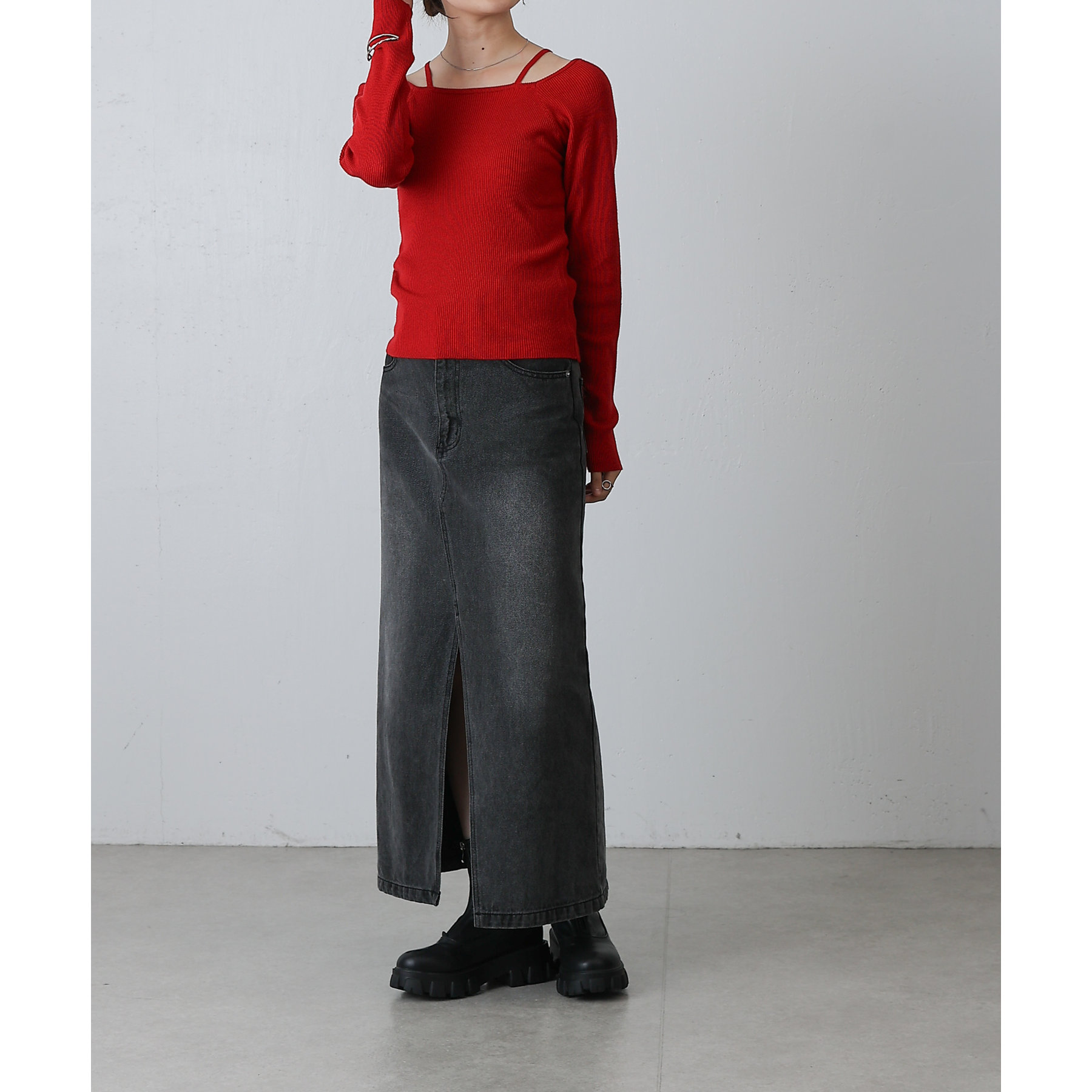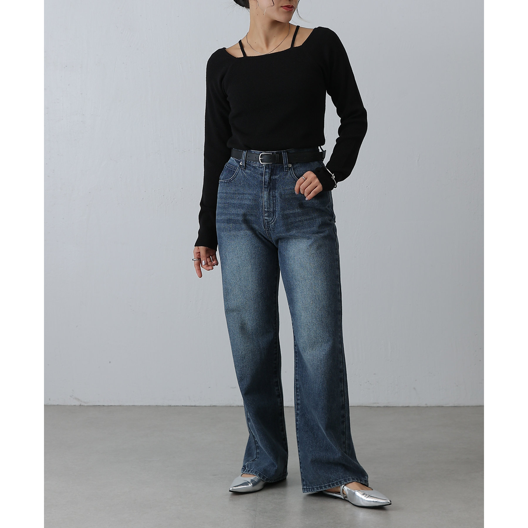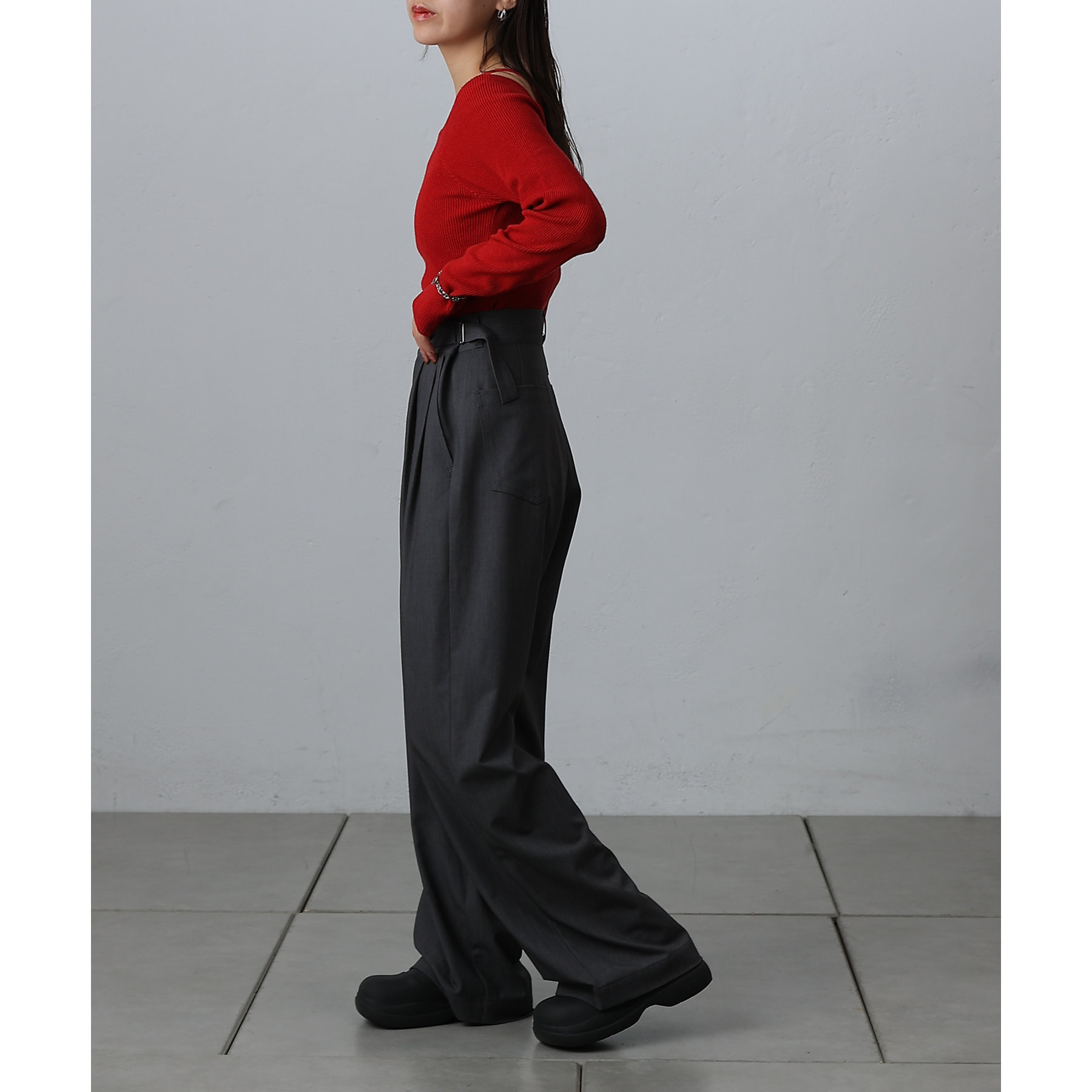 大きめのスクエアネックにレイヤード風の紐デザインが特徴のニット