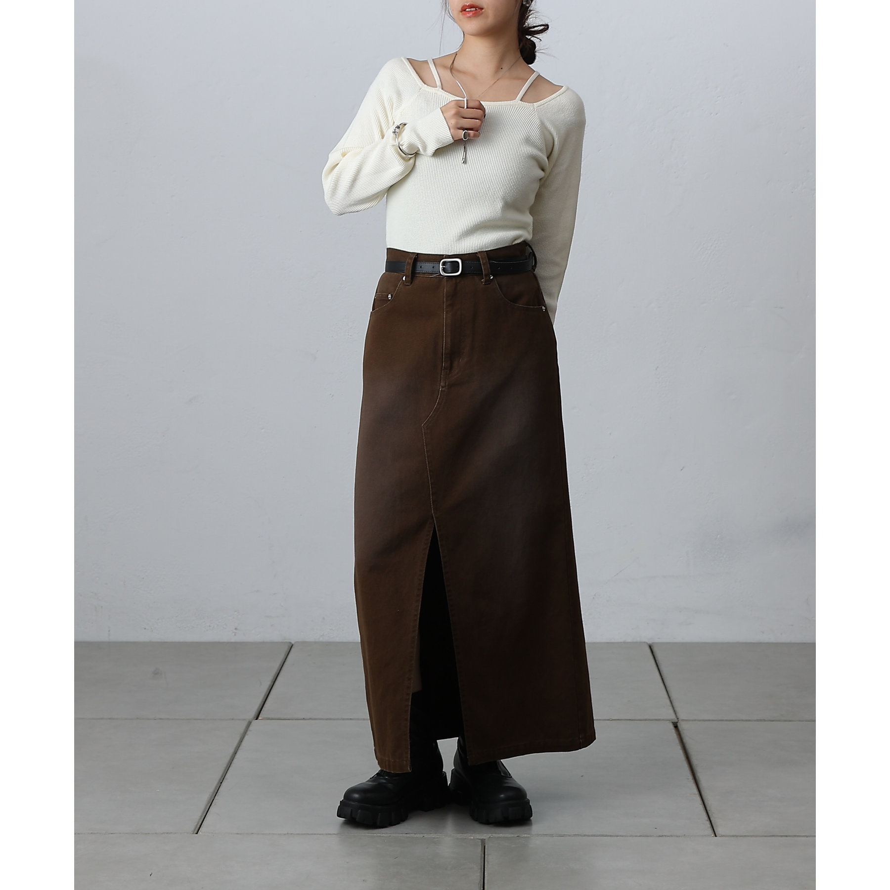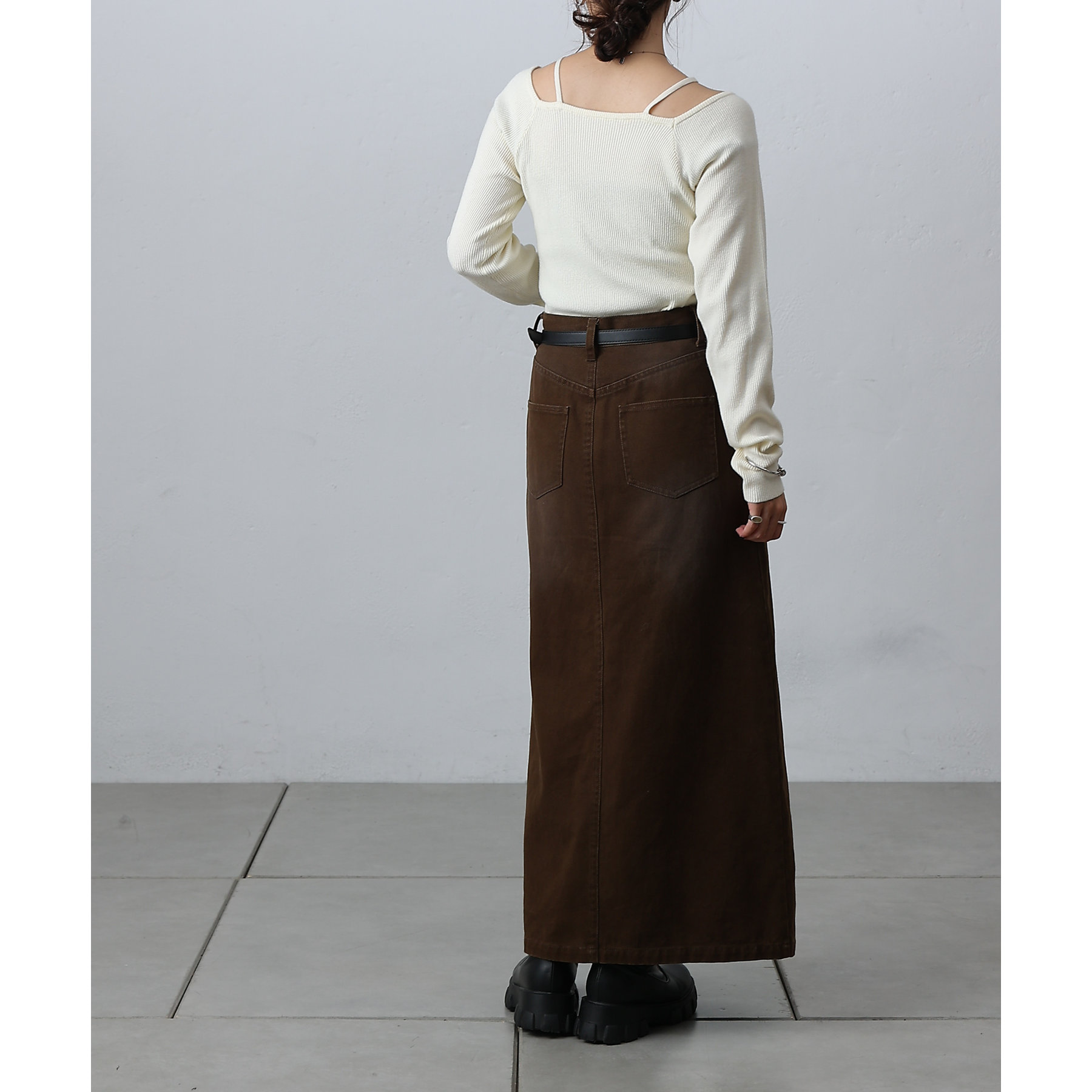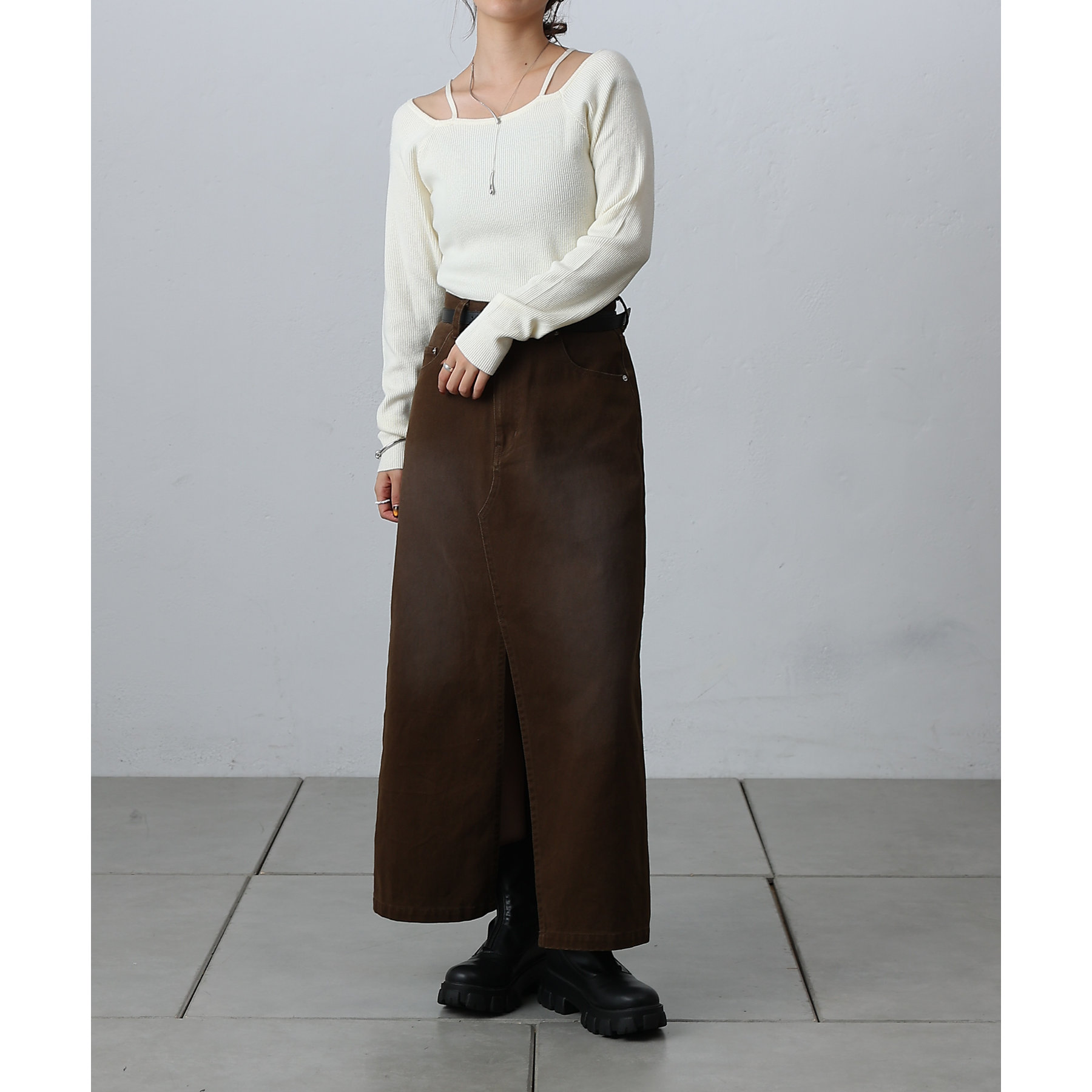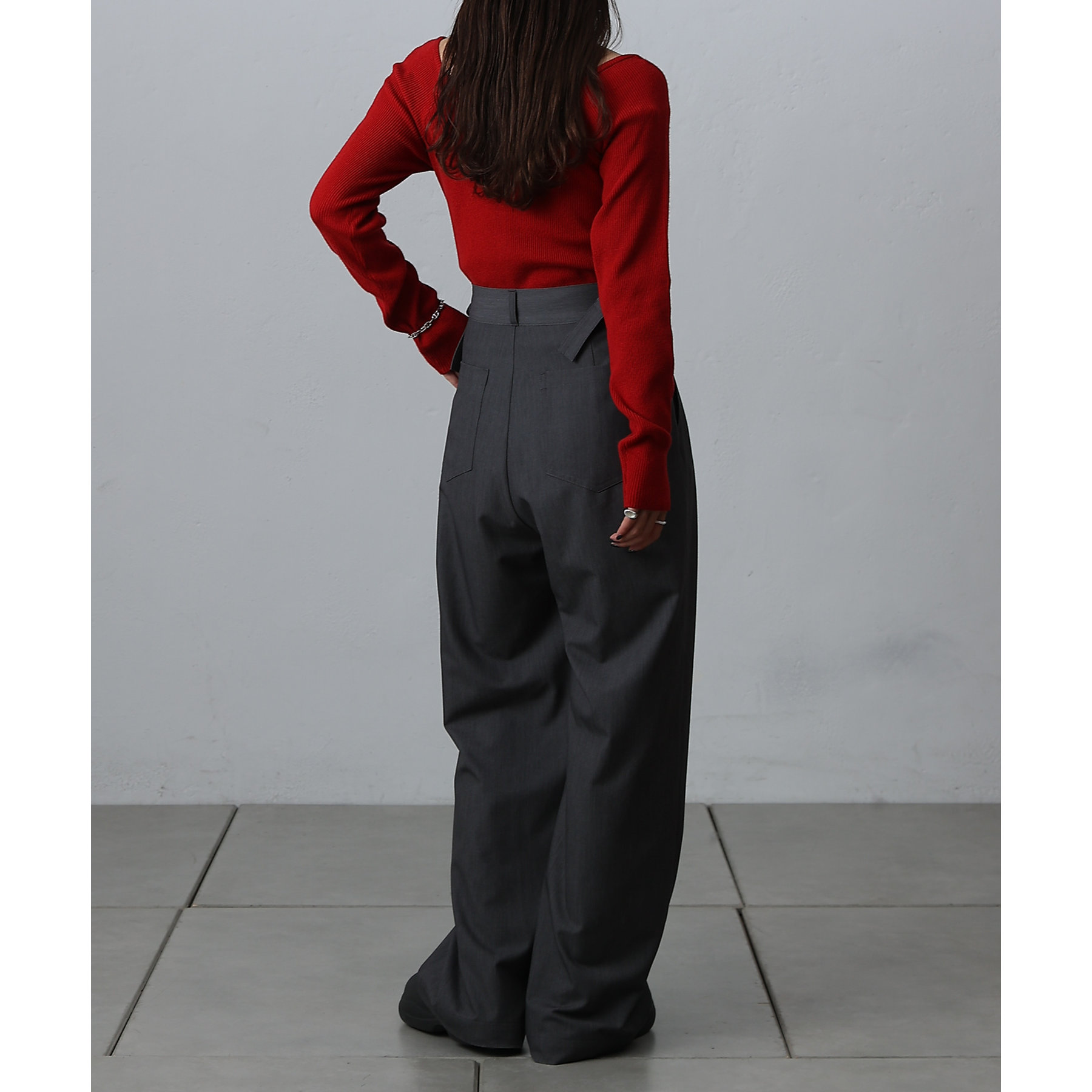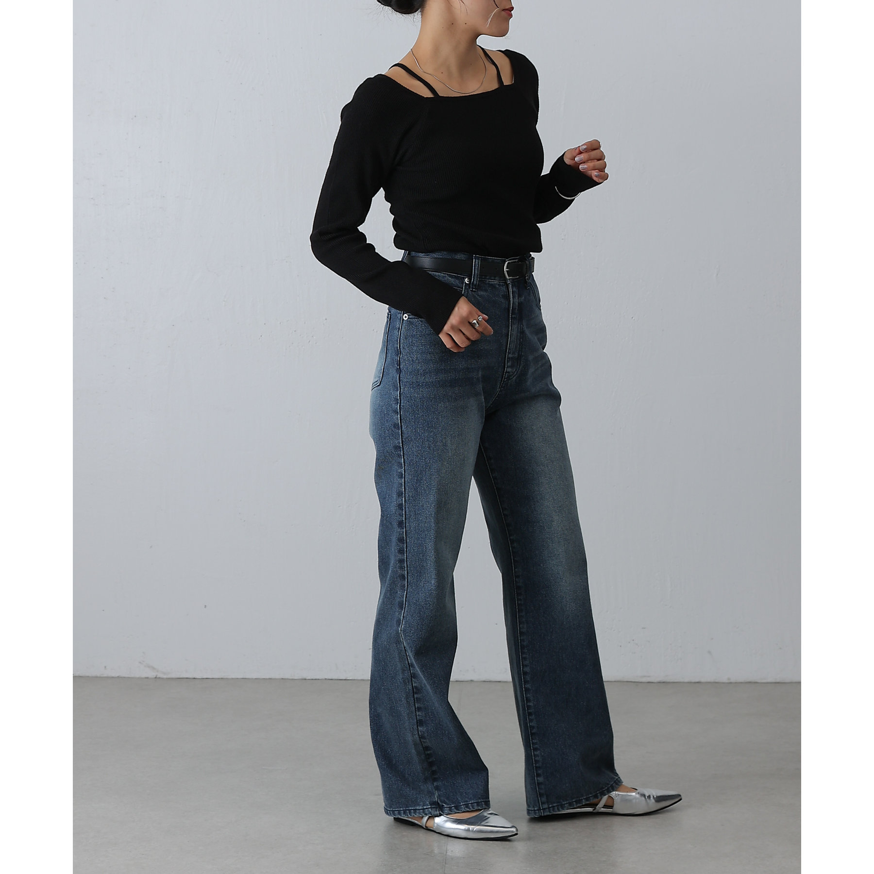 大きめのスクエアネックにレイヤード風の紐デザインが特徴のニット