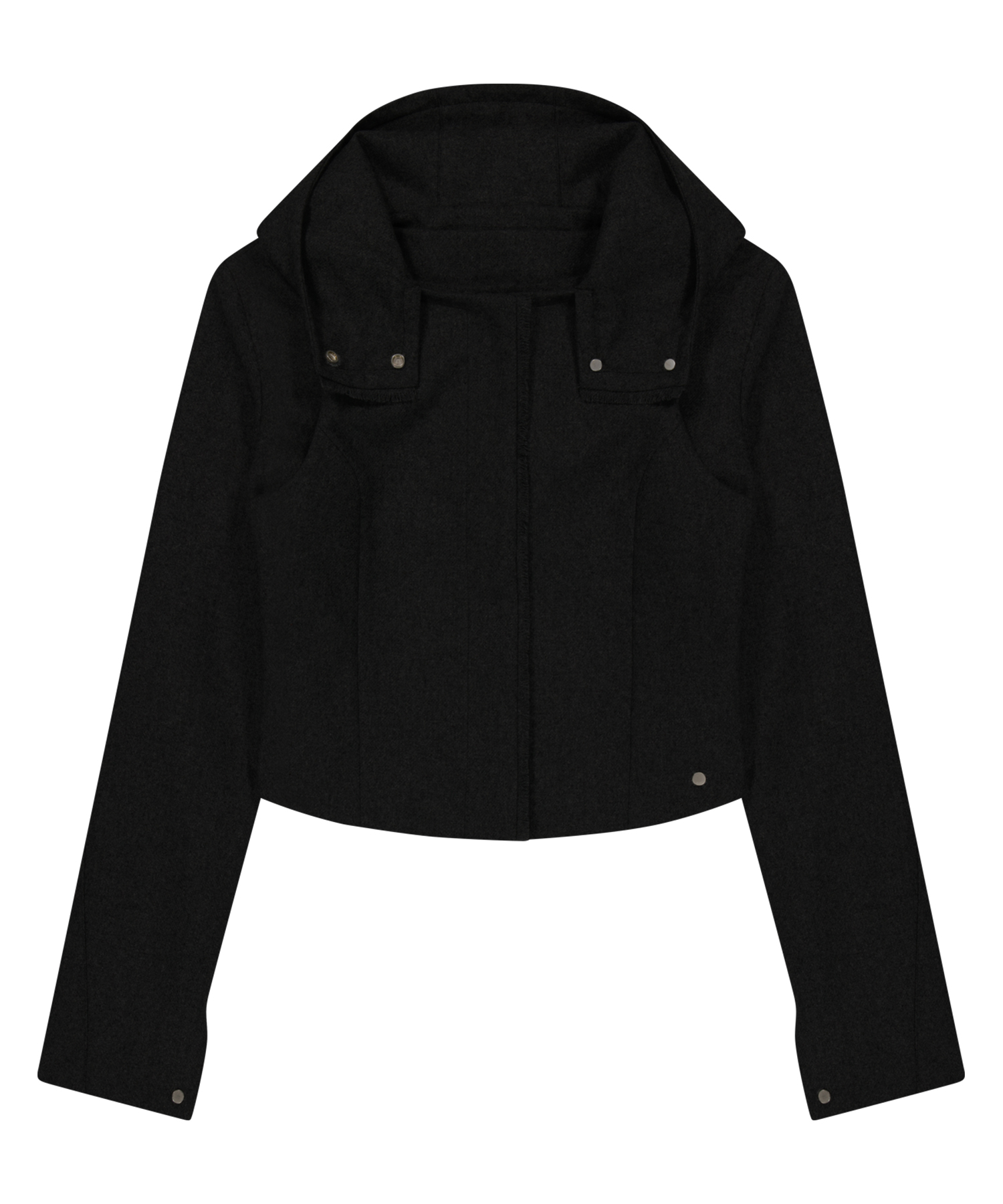 ボレロとフードベストのセットアップで多様なスタイリングが可能なレイヤードウールジャケット