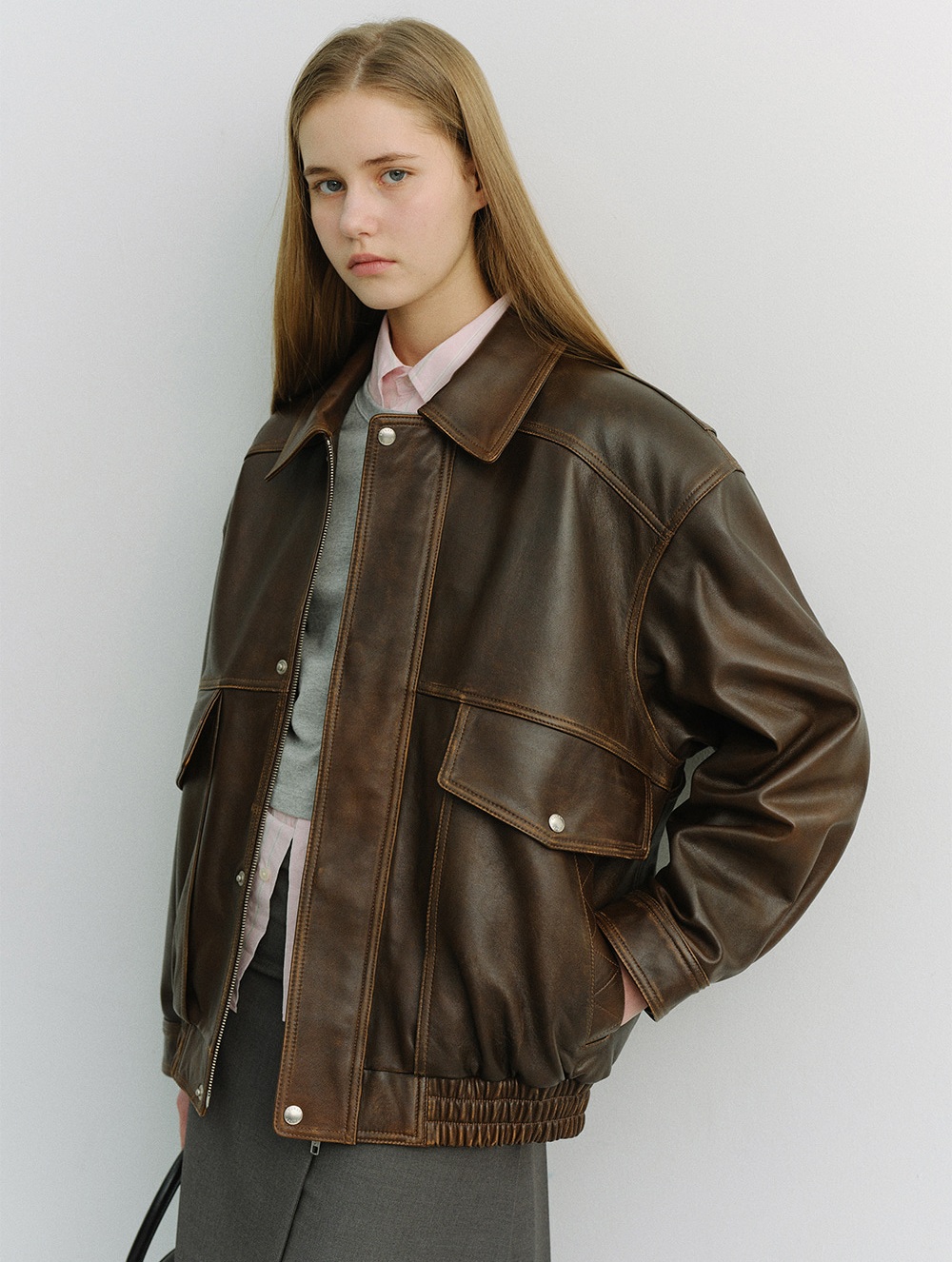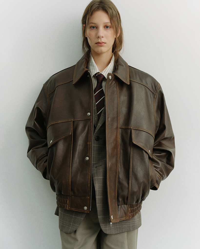 UNISEX OVERSIZED VINTAGE LEATHER BLOUSON BRUSHED BROWN_UDJU6A103W2
