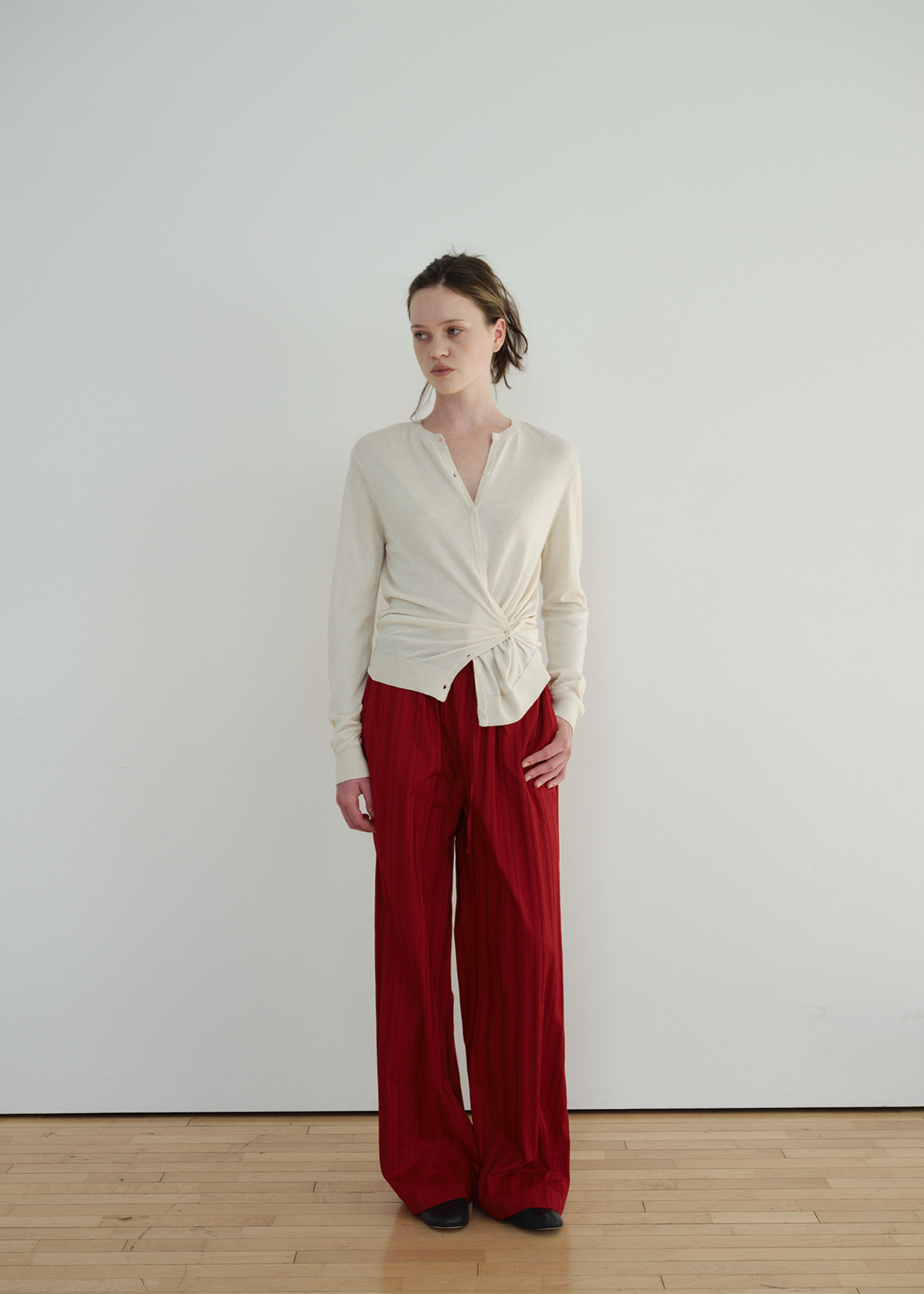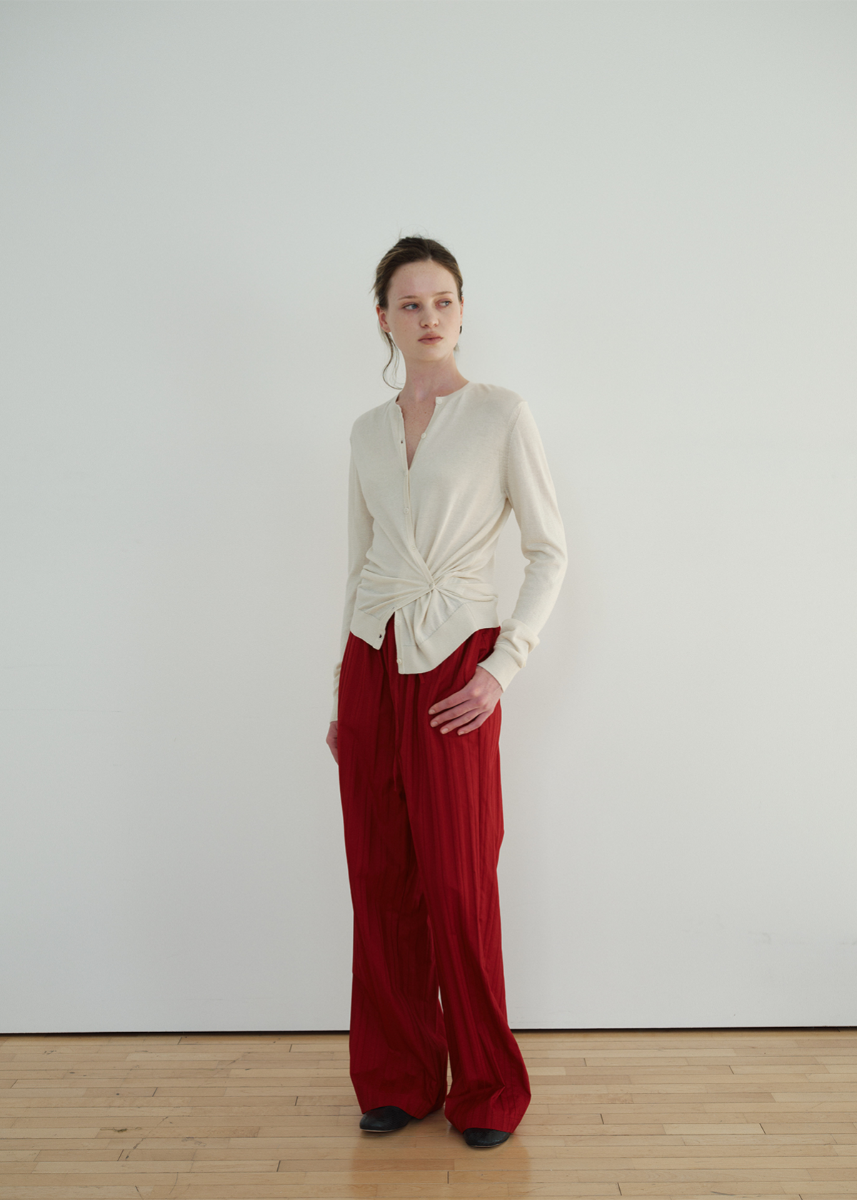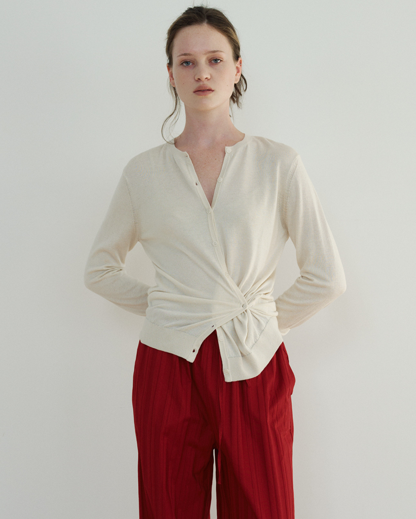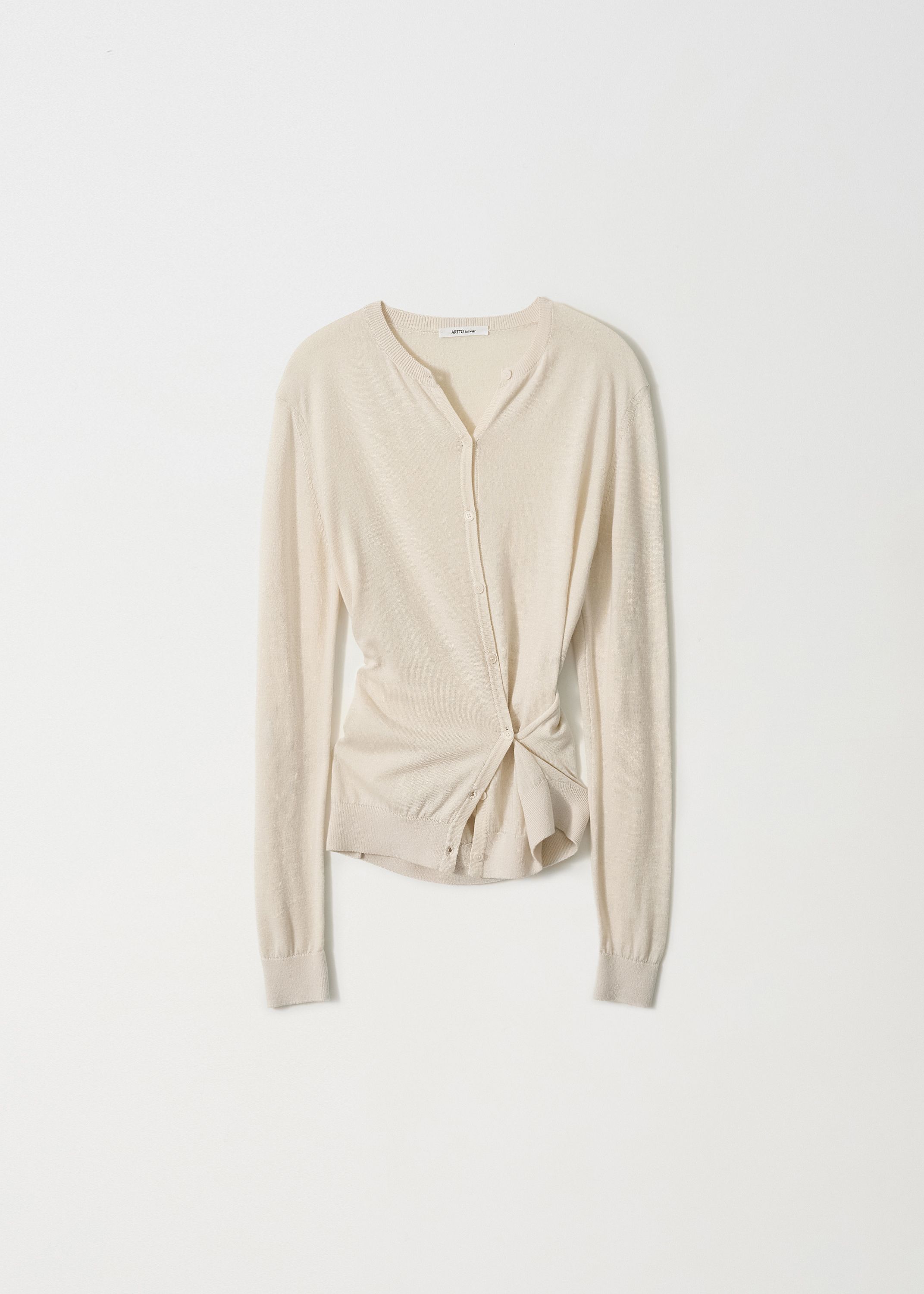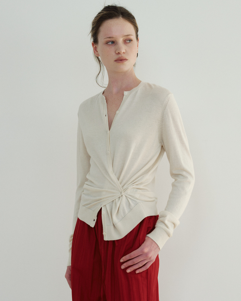 サイドラインのボタンディテールを活かしてラップのように結べる 2WAY デザインで、ベーシックなカーディガンスタイルとポイントのあるシルエットの両方を楽しめます。袖口と裾はリブ組織で仕上げ、ほどよいテンションでフォルムを整えます。Cream・Charcoal・Black の3色構成で、デイリーからフォーマルなスタイリングまで幅広くマッチします。