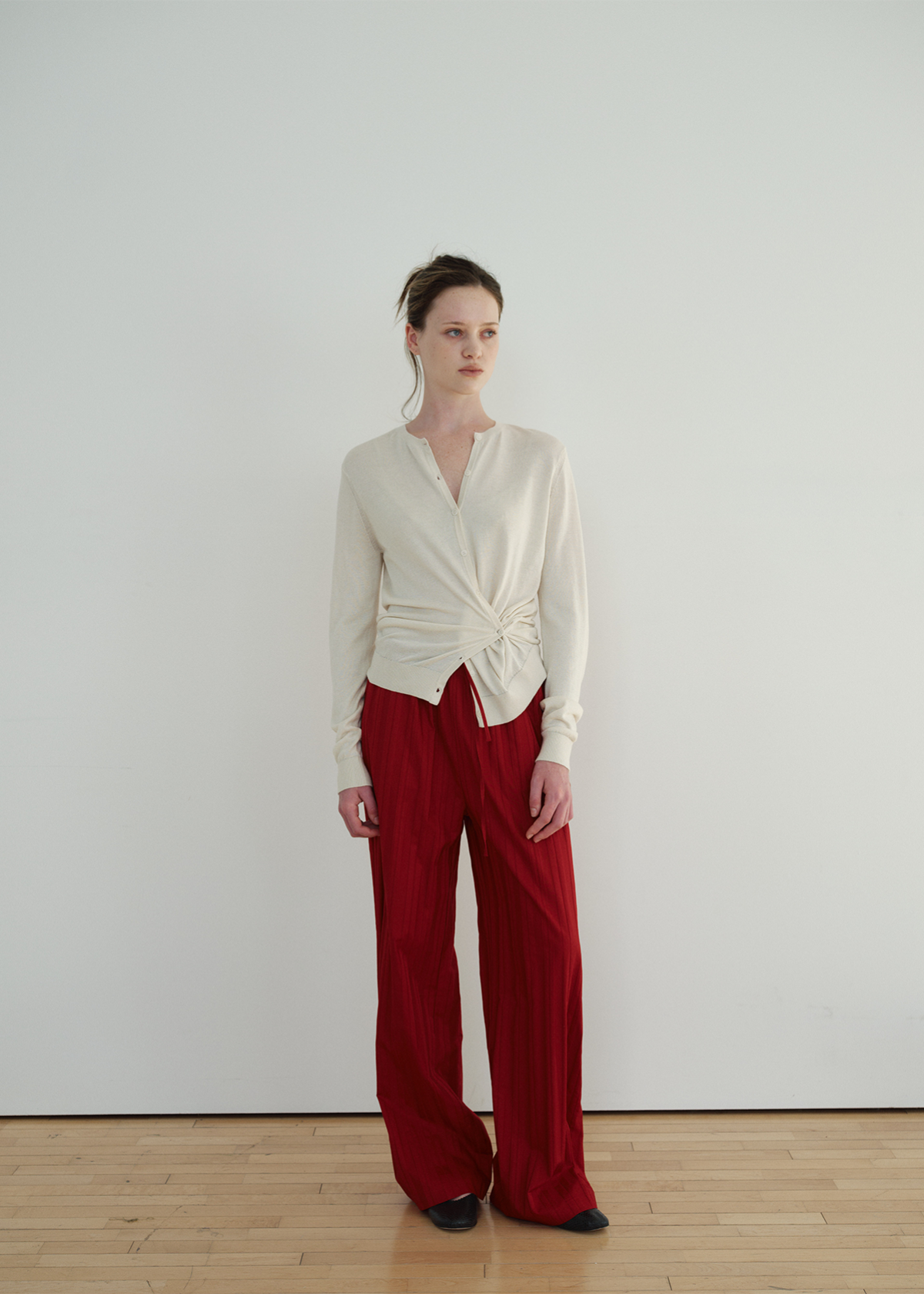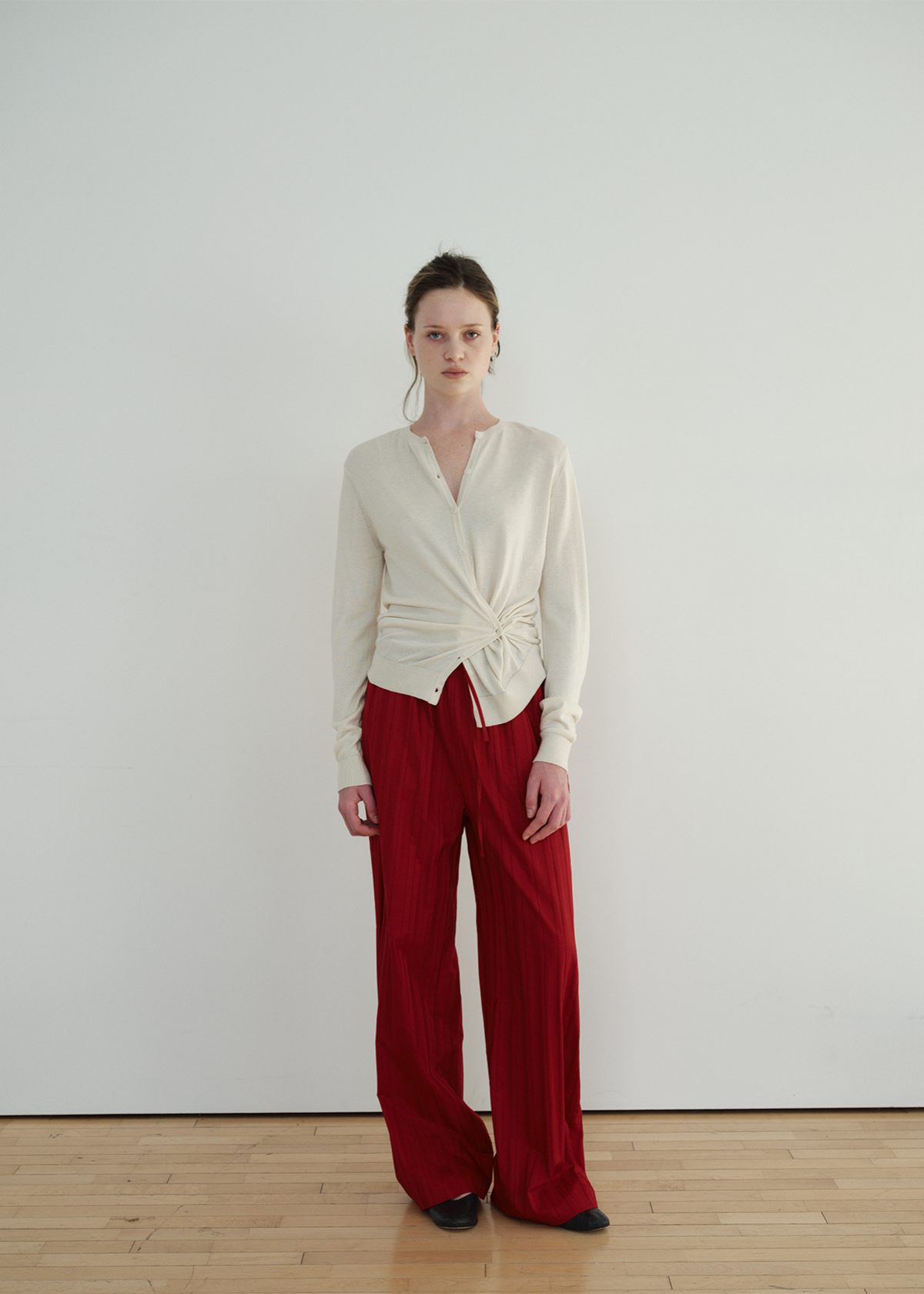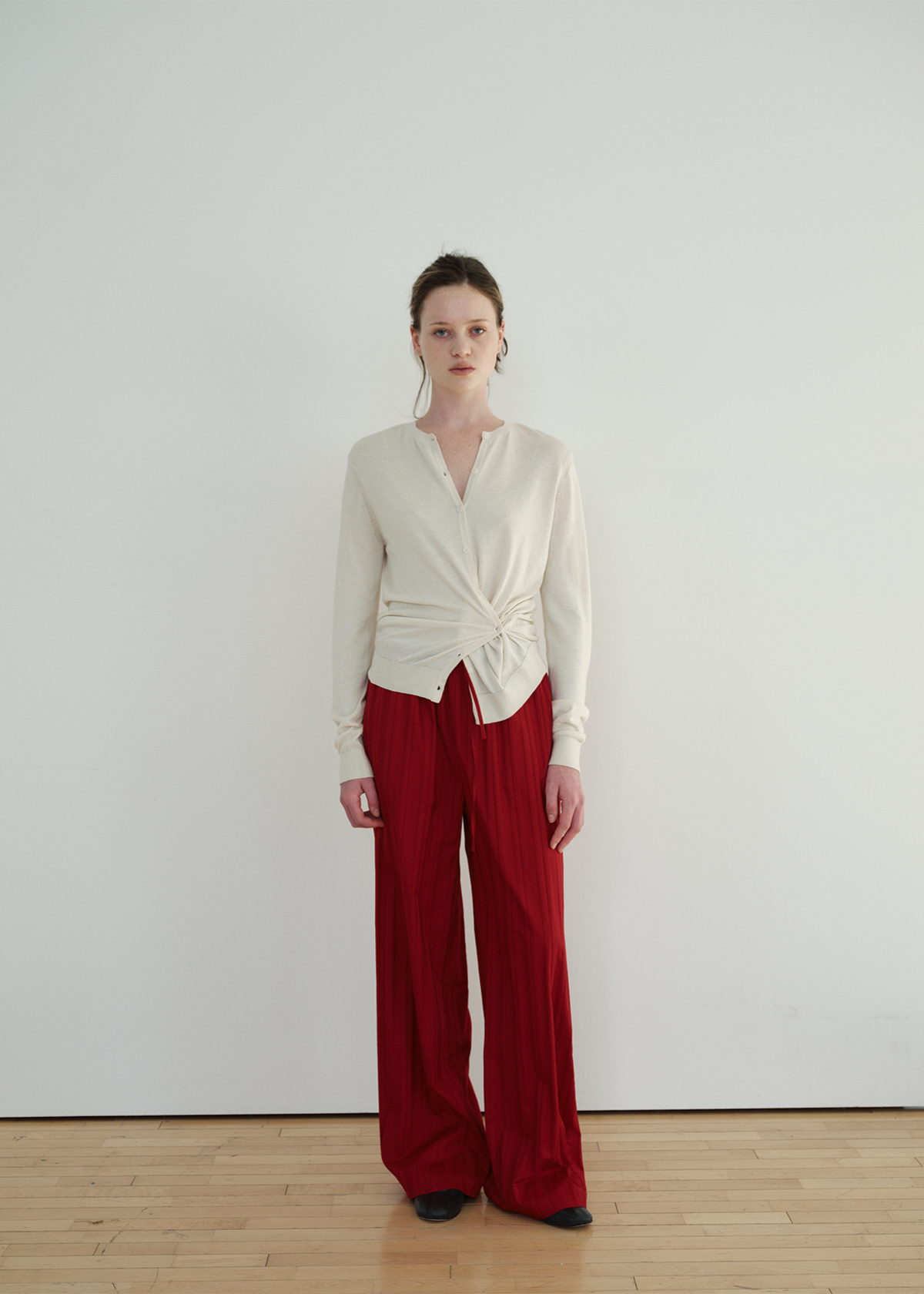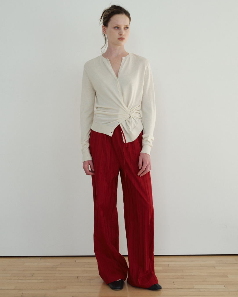 サイドラインのボタンディテールを活かしてラップのように結べる 2WAY デザインで、ベーシックなカーディガンスタイルとポイントのあるシルエットの両方を楽しめます。袖口と裾はリブ組織で仕上げ、ほどよいテンションでフォルムを整えます。Cream・Charcoal・Black の3色構成で、デイリーからフォーマルなスタイリングまで幅広くマッチします。