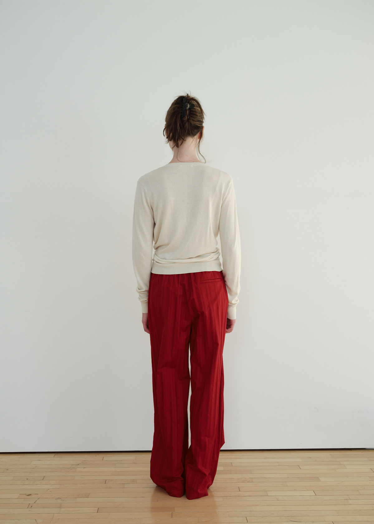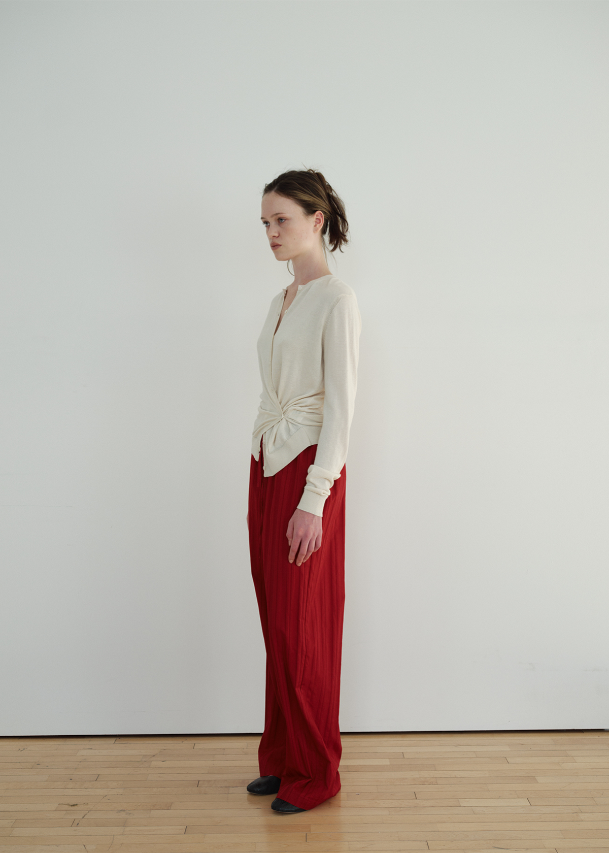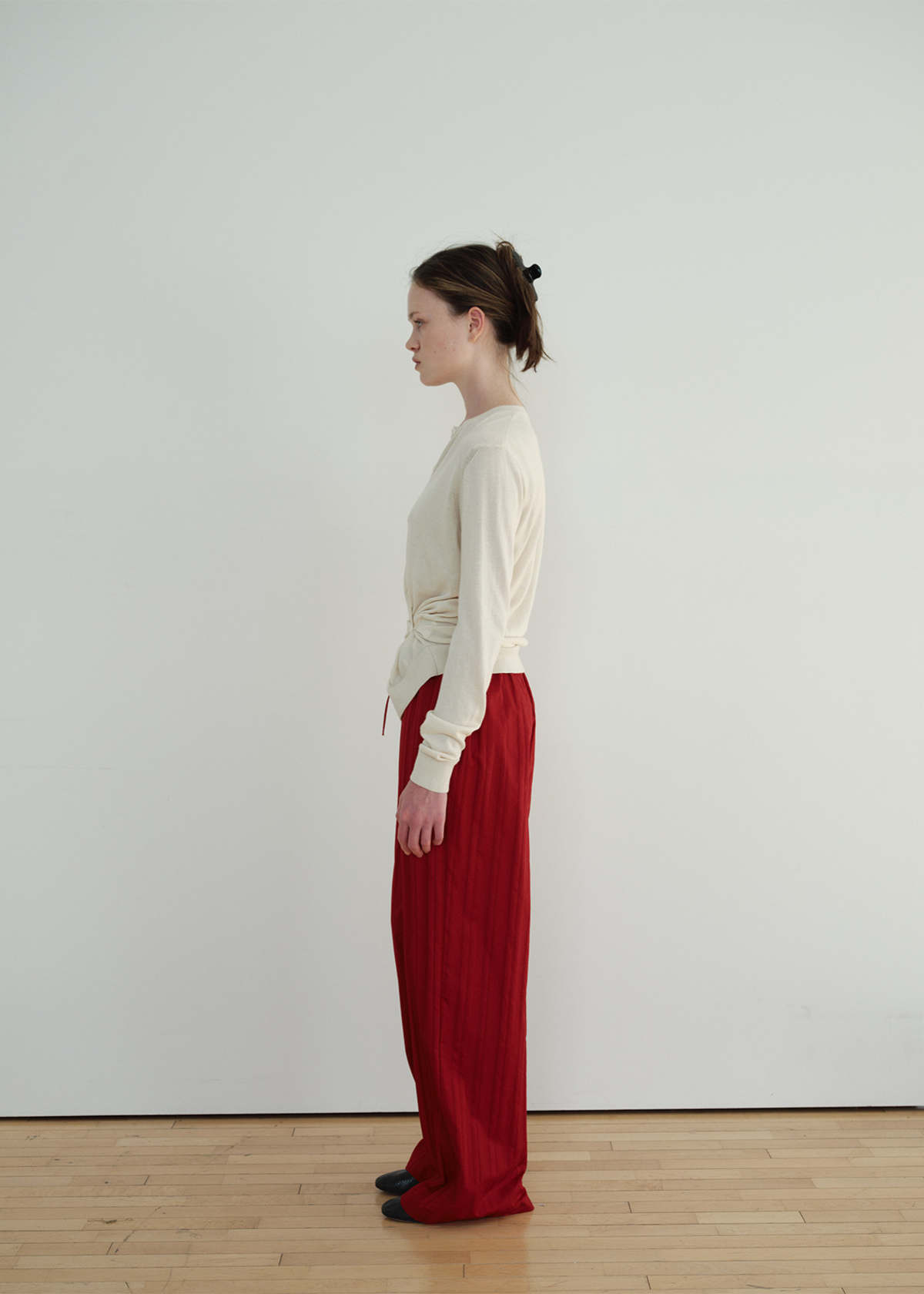 - 本製品のリブ部分は、デザイン上しっかりとしたフィット感を出すため、全面にスパン糸を一緒に編み込んでいます。SILK ブレンド糸とスパン糸の特性差により、生地表面に微細なミキシング(トーン差)が見られる場合があります。Cream と Black カラーにも同様の現象がありますが、カラー特性上 Charcoal カラーで比較的目立ちやすく見えることがあります。これは糸の特性による自然な現象であり、不良事由には該当しません。