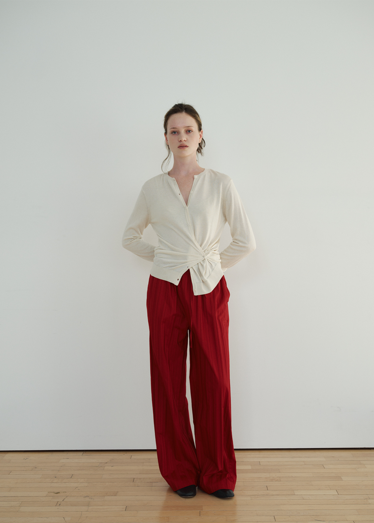 - ラップニットの特性上、ボタンを留める過程で生地にテンションがかかると、ボタン部分に伸びが生じる場合があります。ボタン部分の伸びや着用痕が発生した場合、交換および返品はできません。
