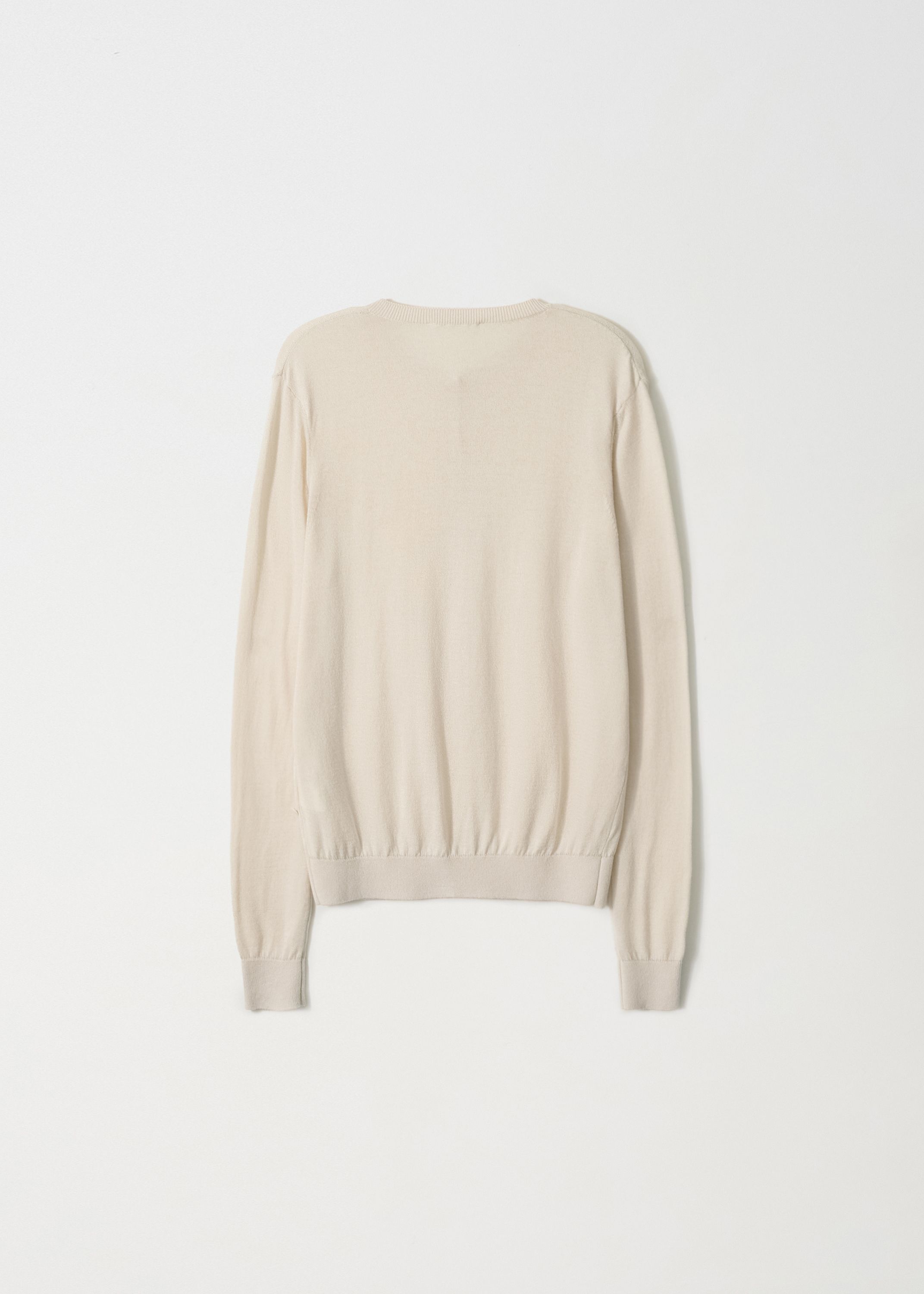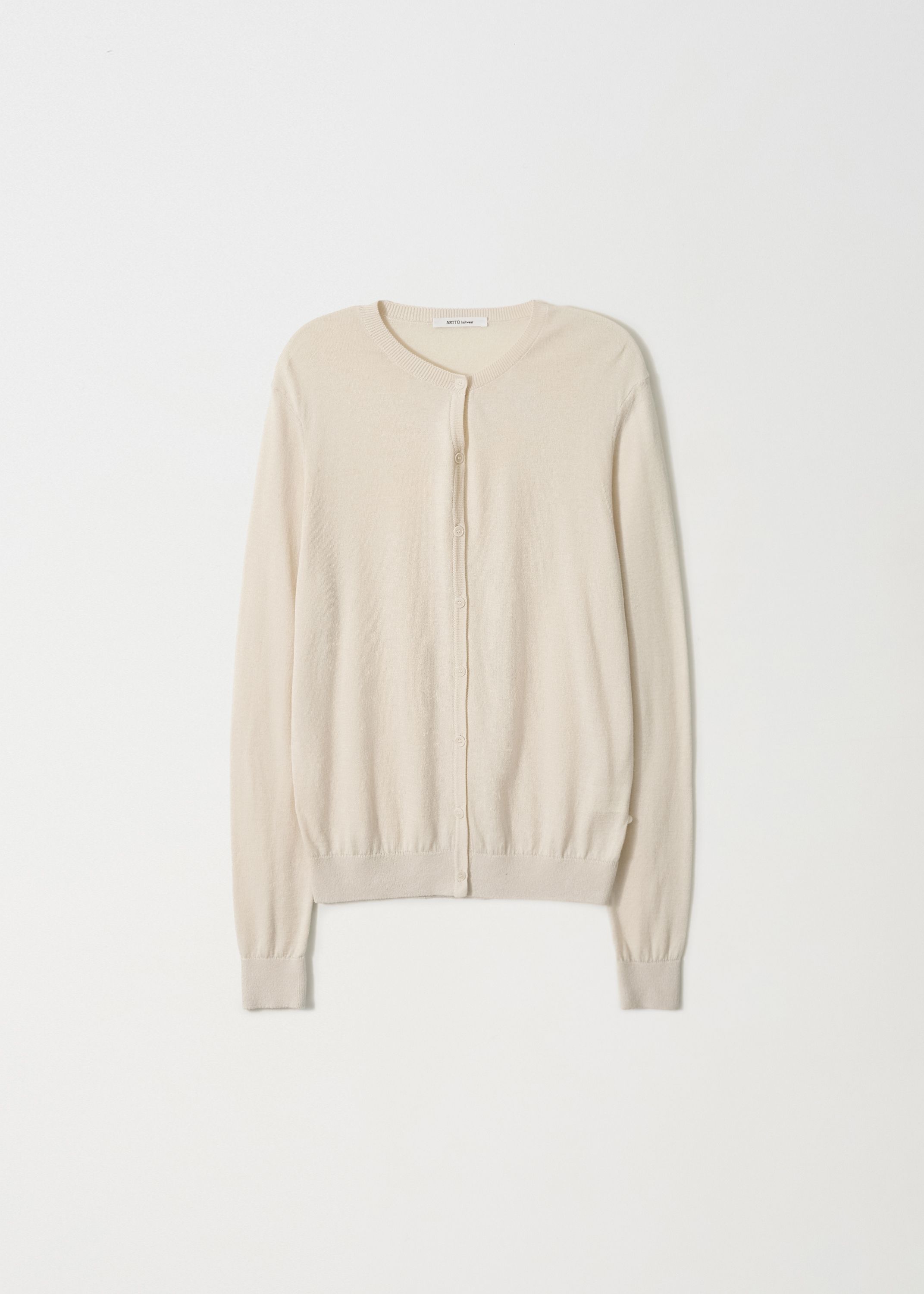 SILK ブレンド糸で仕立てたニットカーディガンです。RAYON 混ならではのシルキーなタッチと自然なドレープが際立ち、季節の変わり目には一枚で、またアウターのインナーとしても活用しやすい厚みに仕上げました。