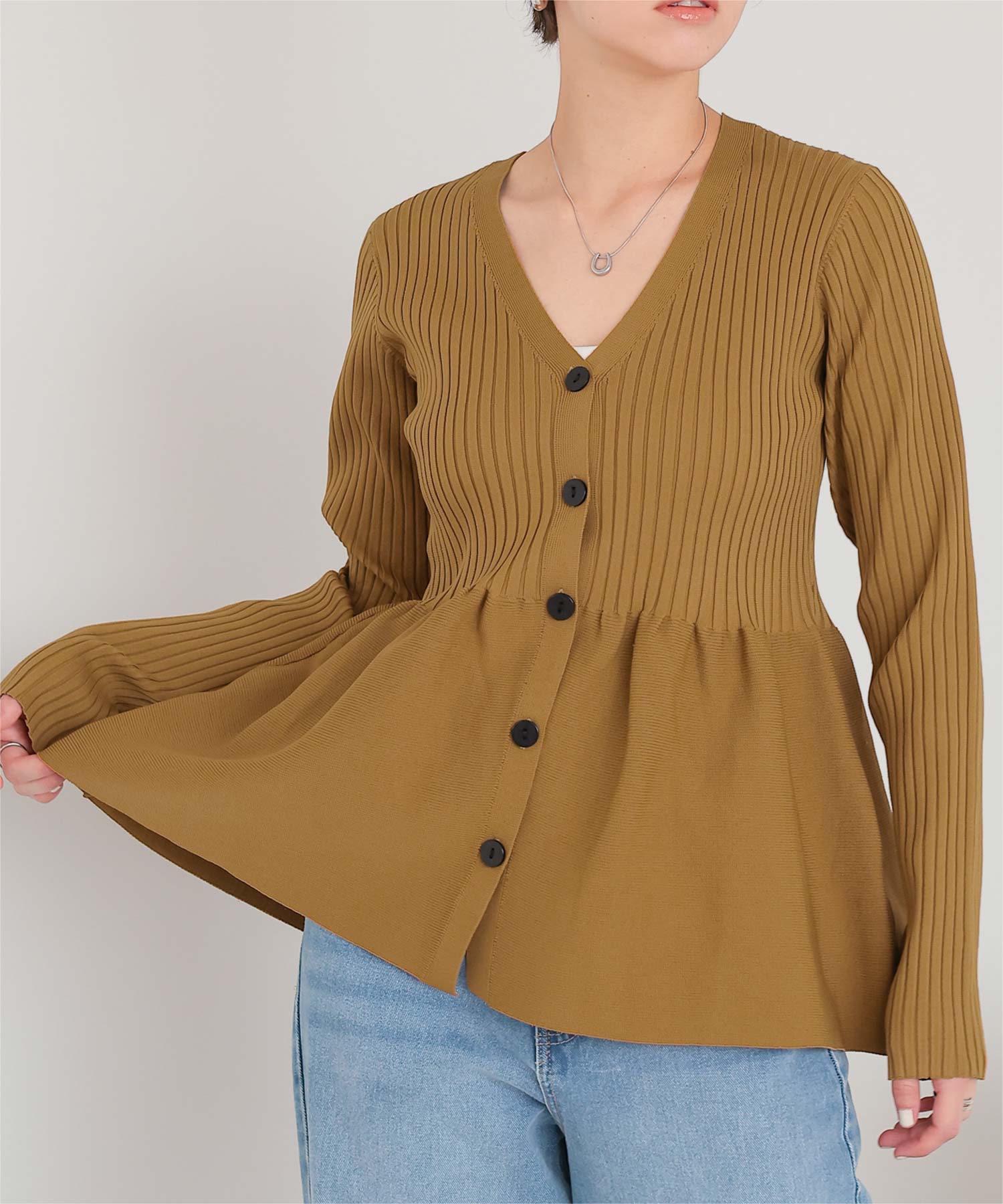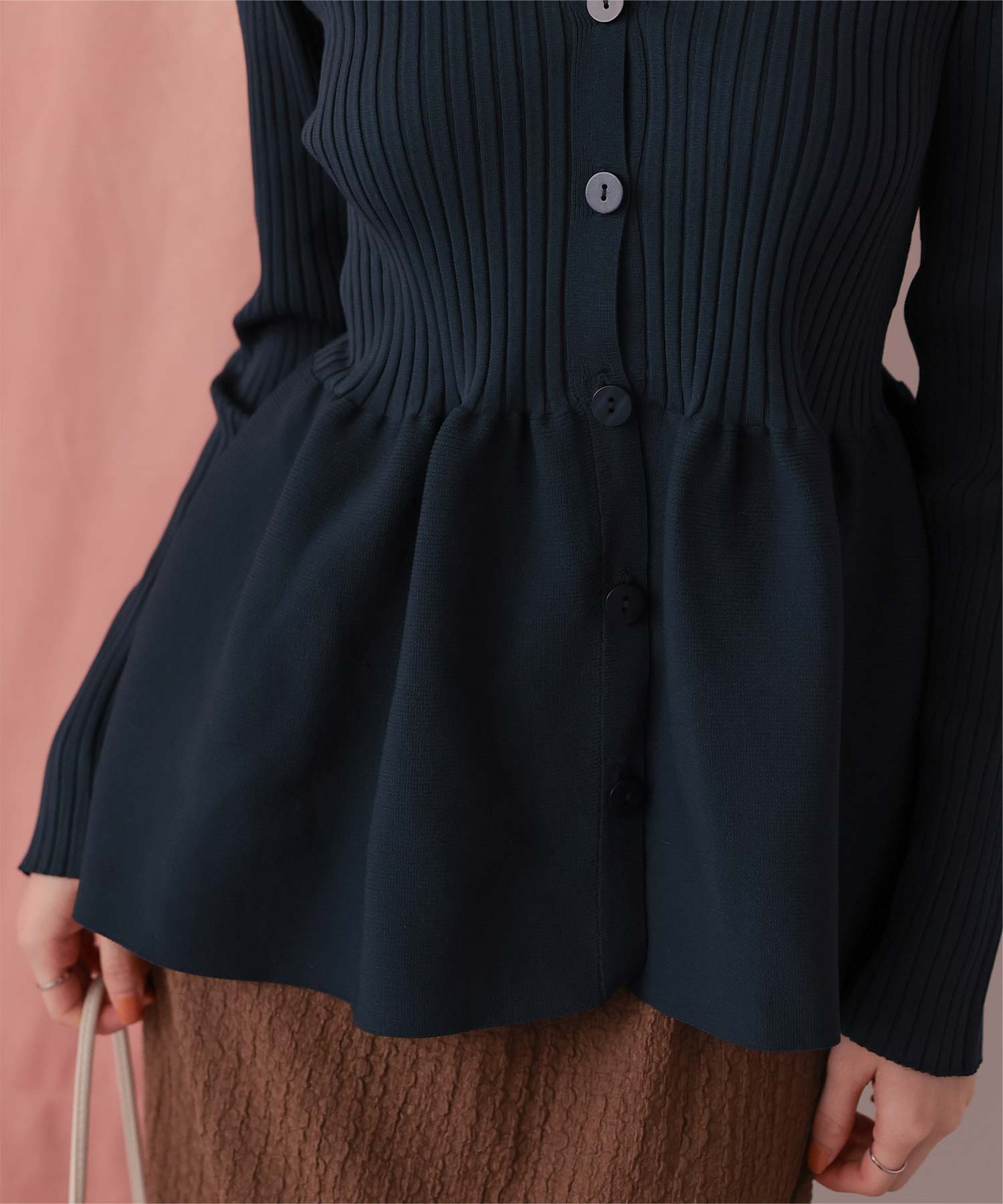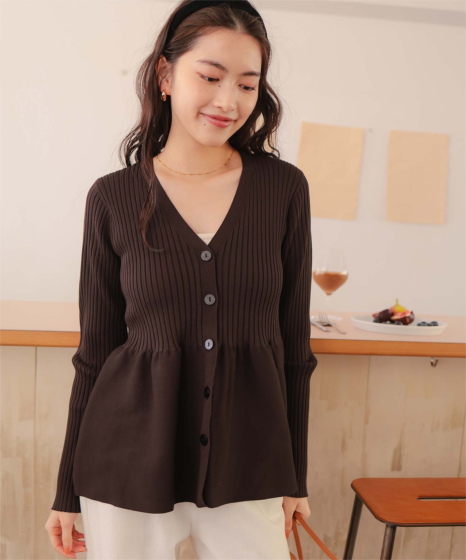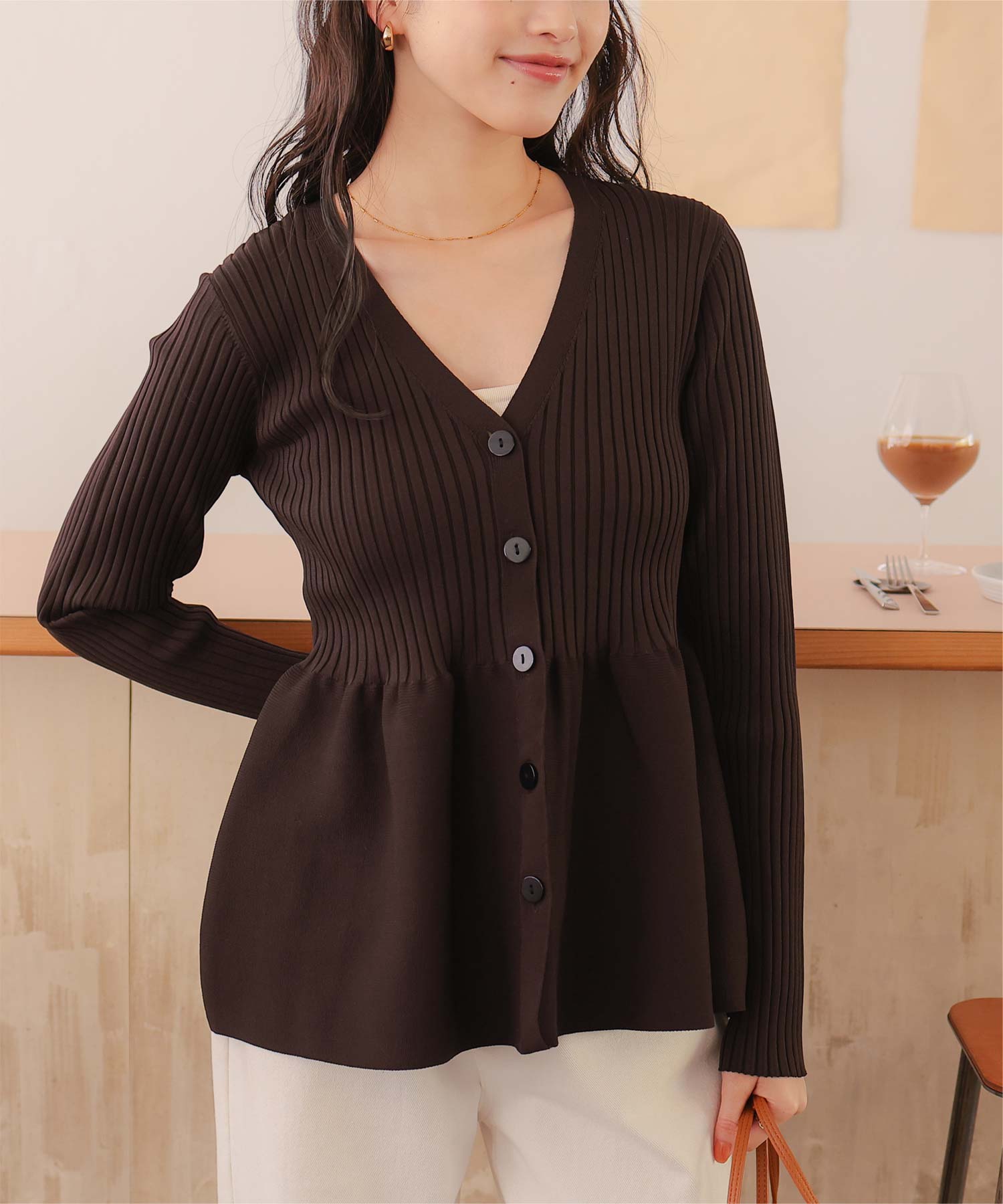 ・前後2way着用できる、ペプラムシルエットが女性らしいニットカーディガン