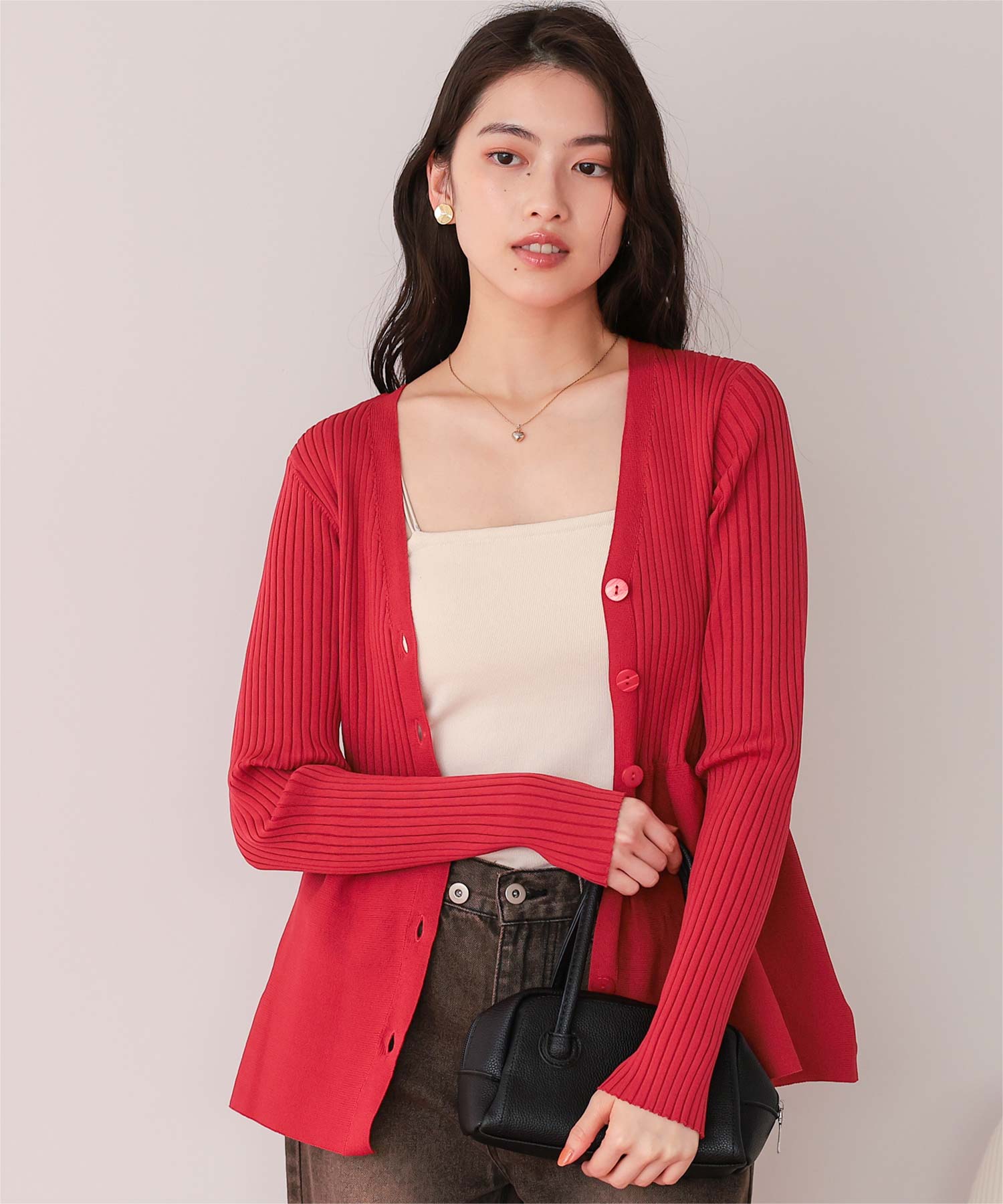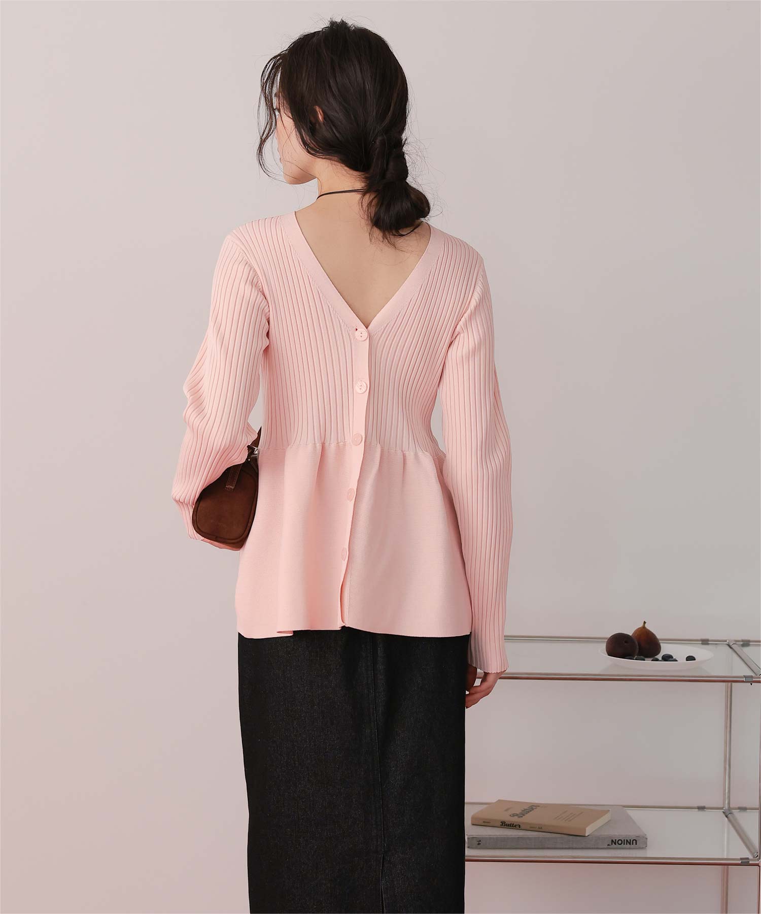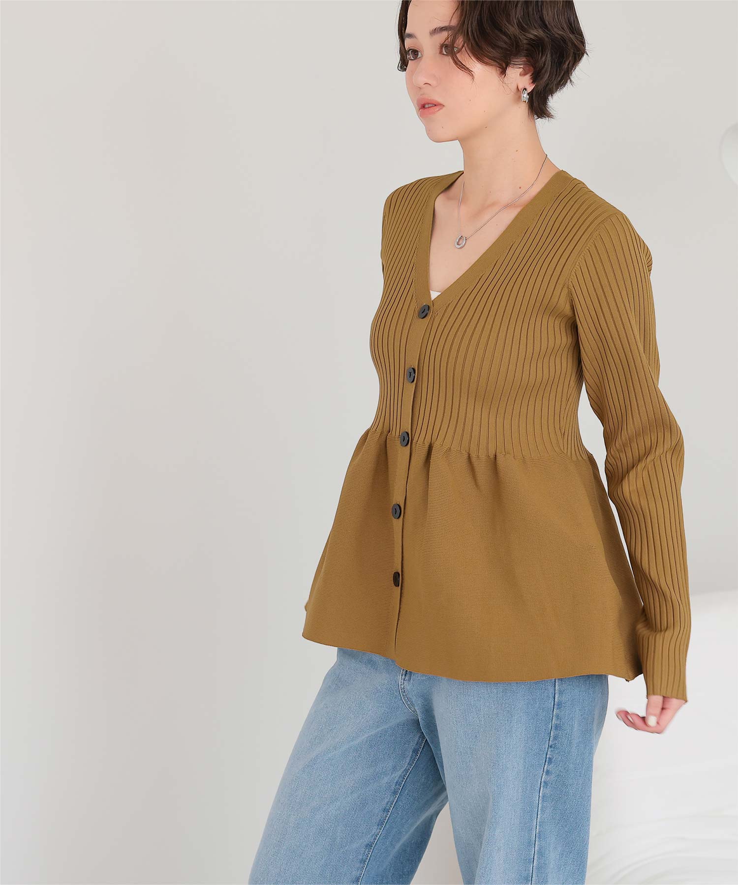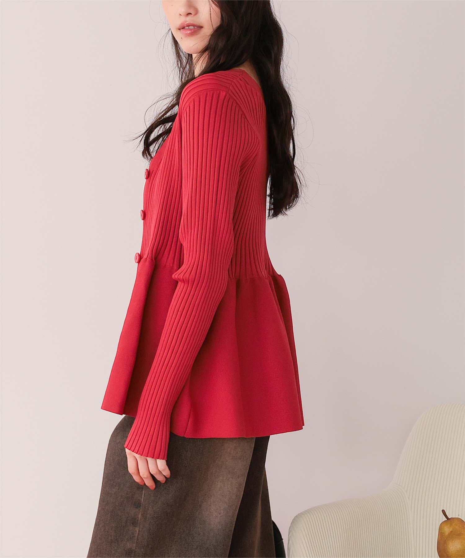 ・前後2way着用できる、ペプラムシルエットが女性らしいニットカーディガン