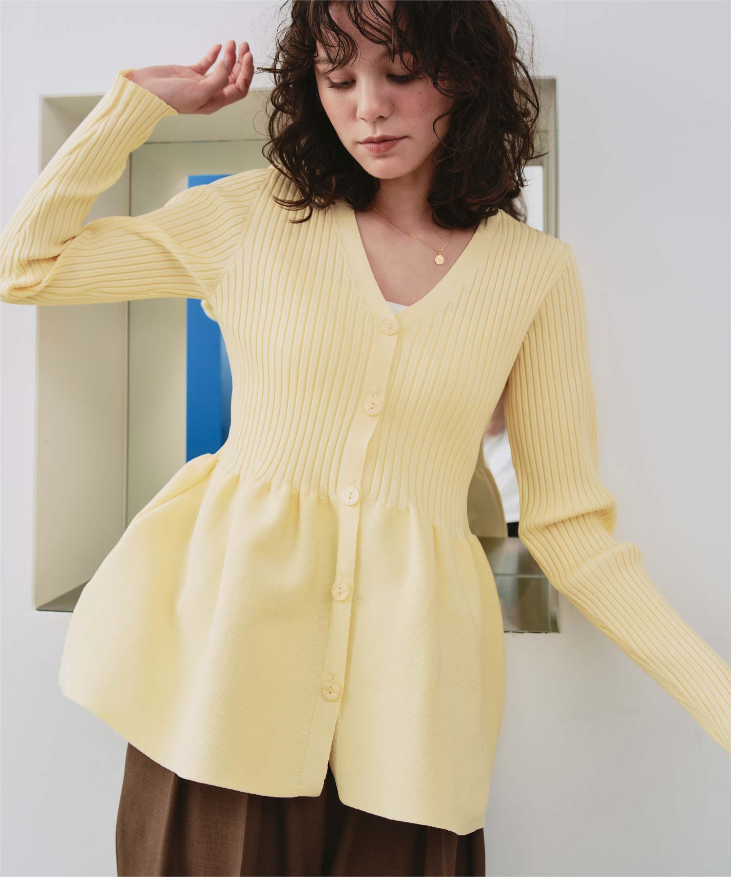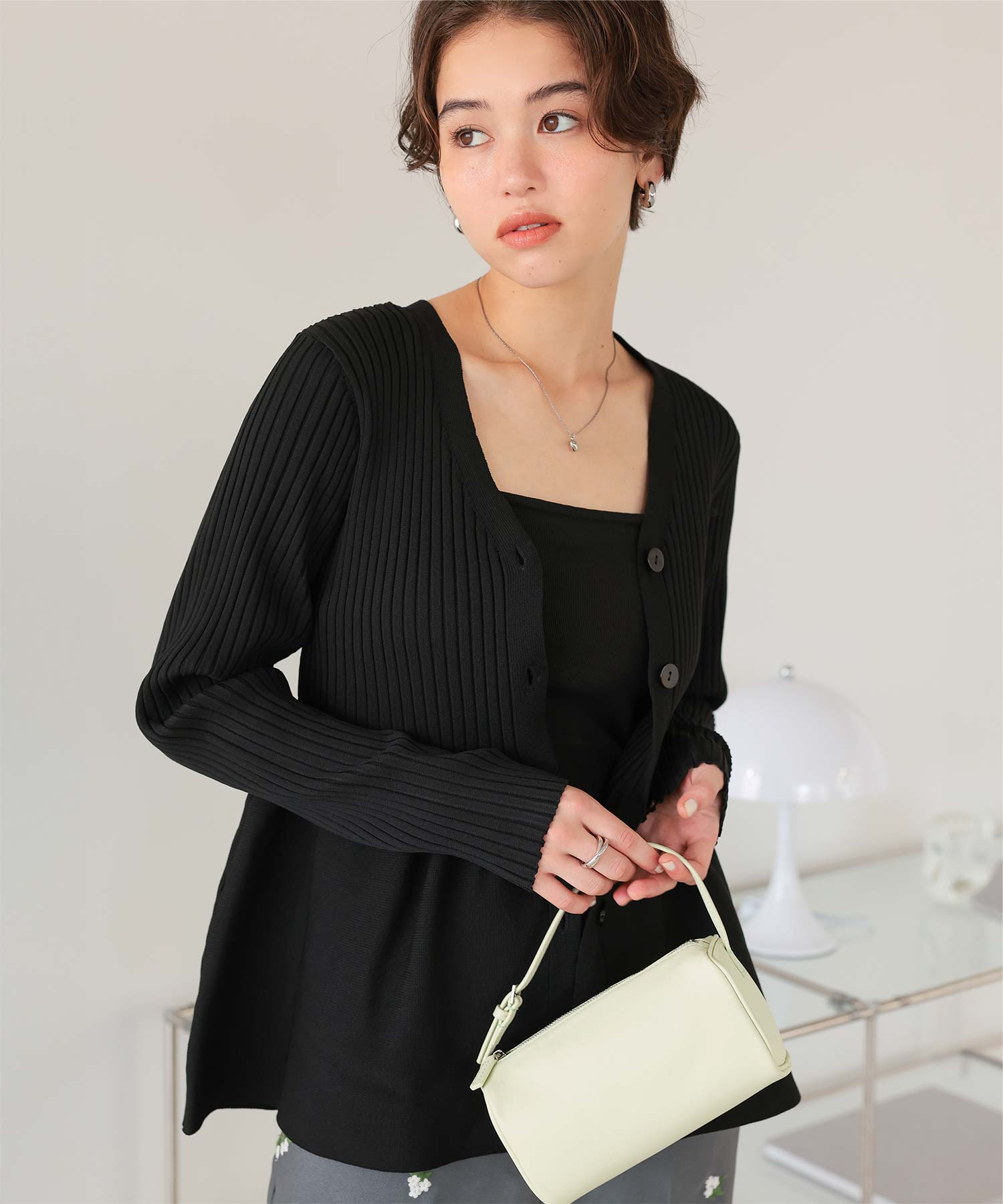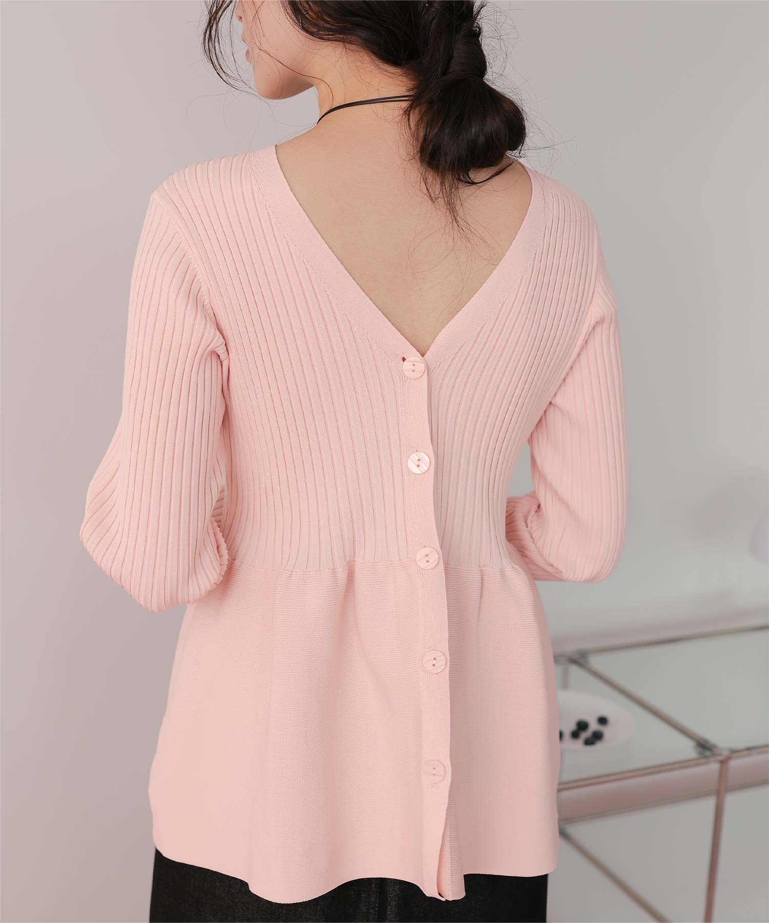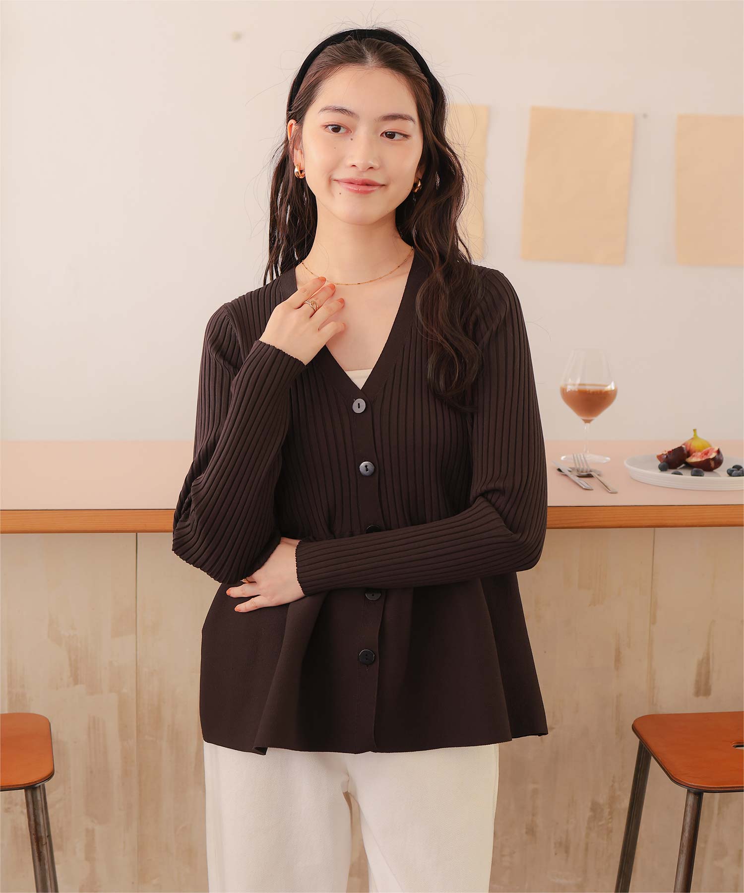 ・前後2way着用できる、ペプラムシルエットが女性らしいニットカーディガン