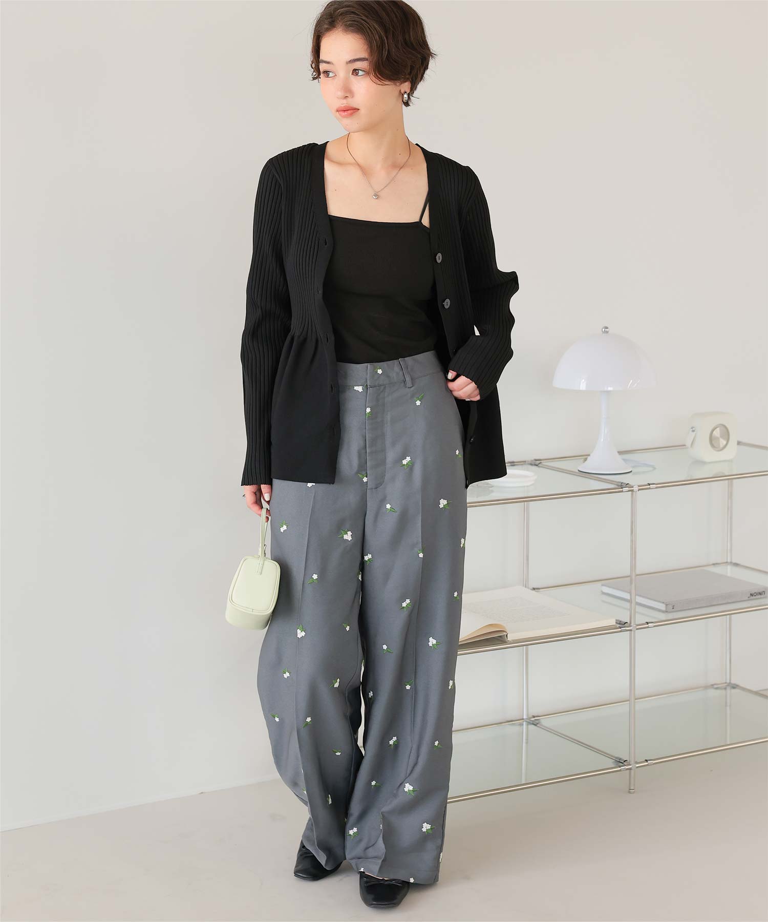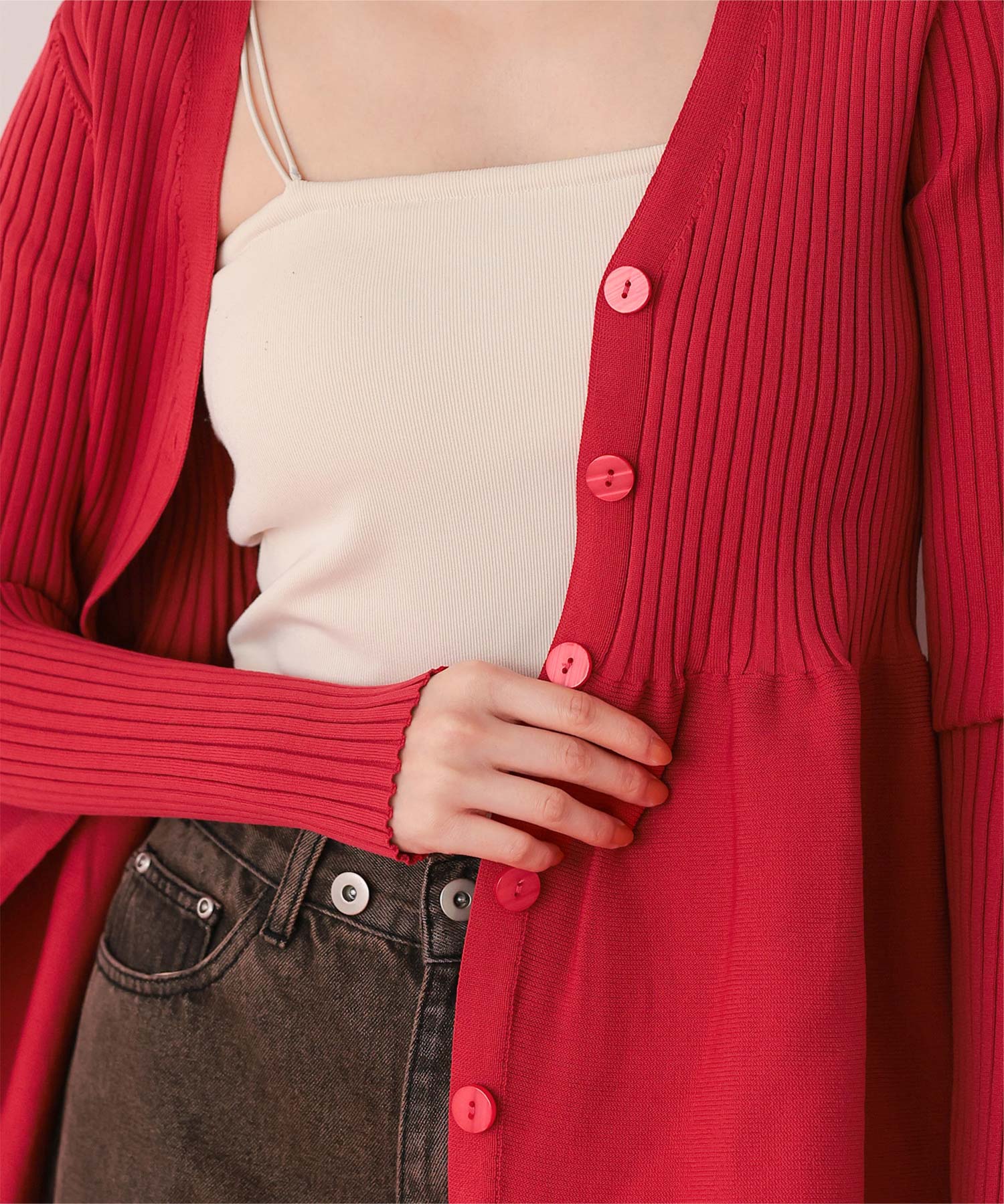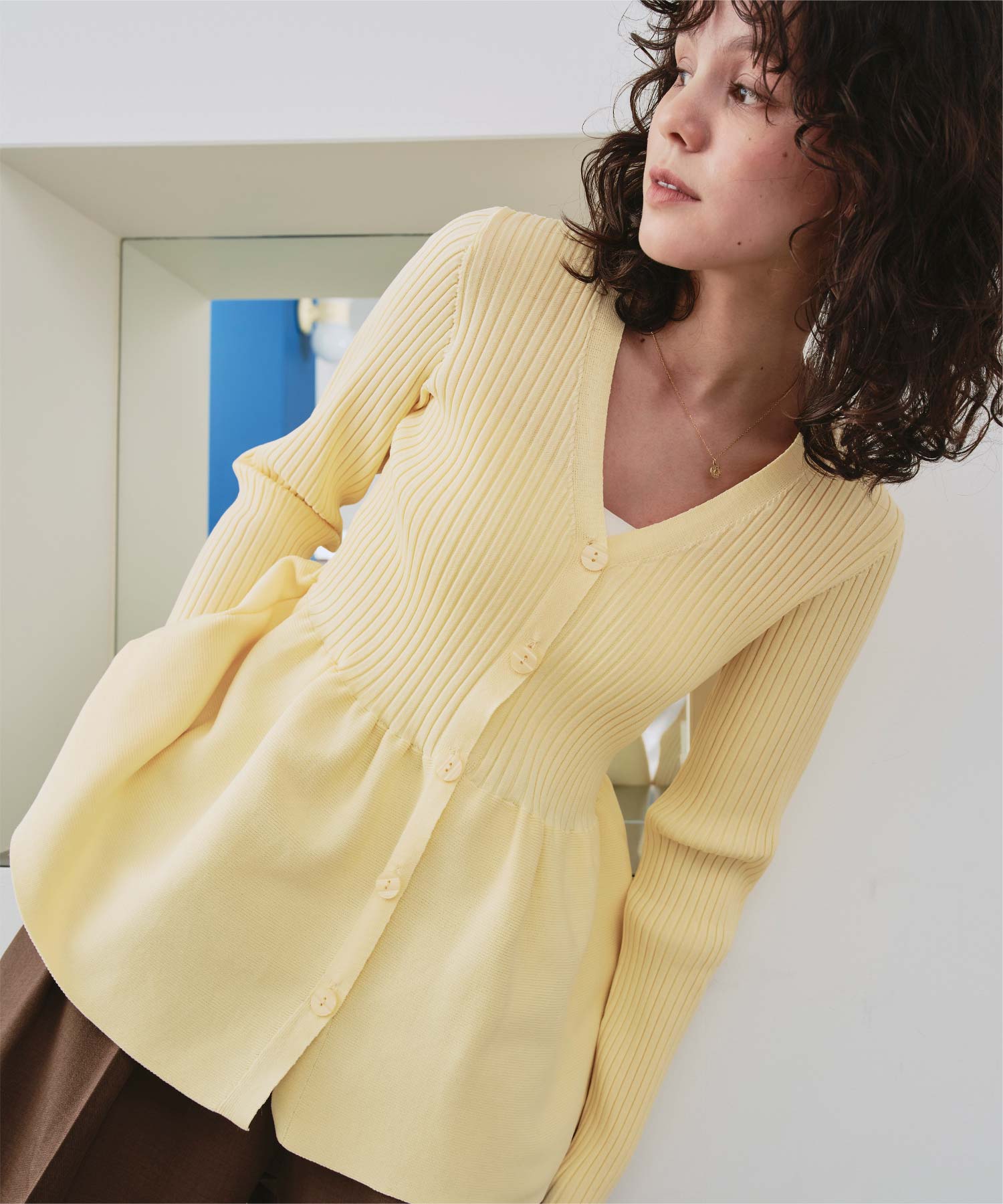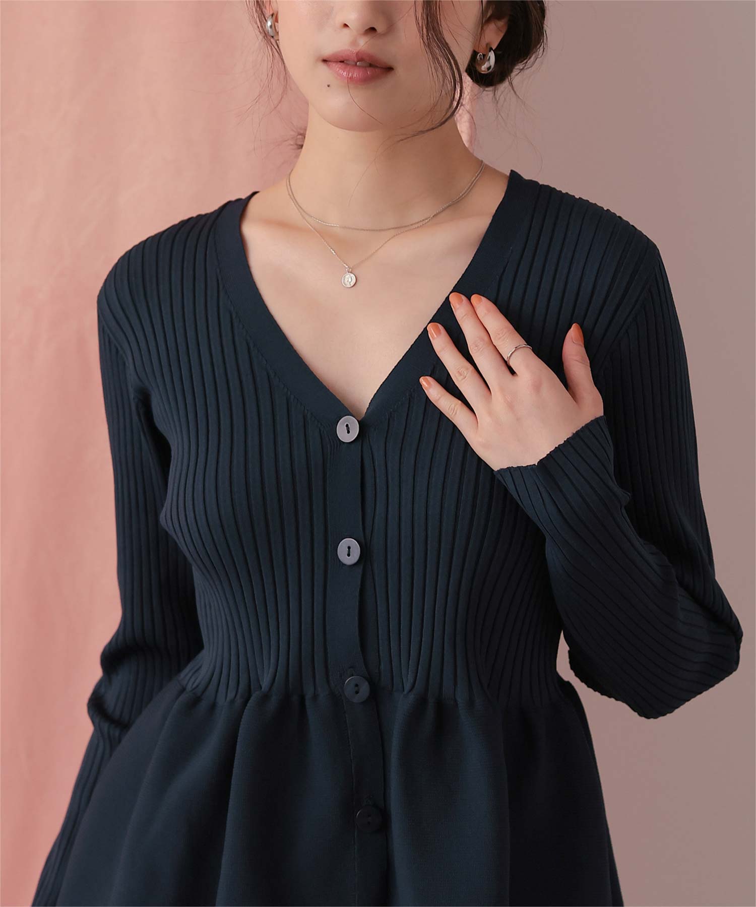 ・前後2way着用できる、ペプラムシルエットが女性らしいニットカーディガン