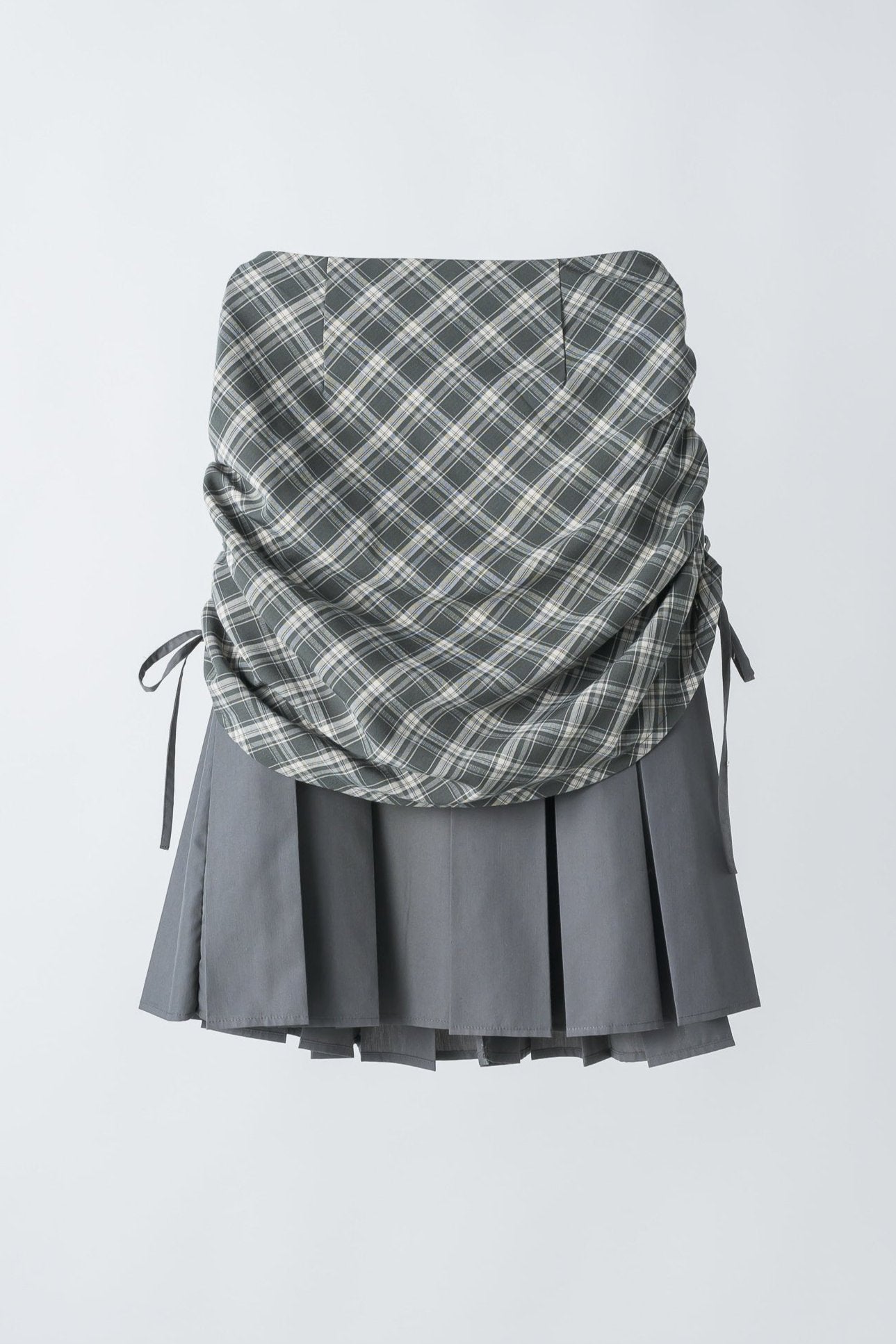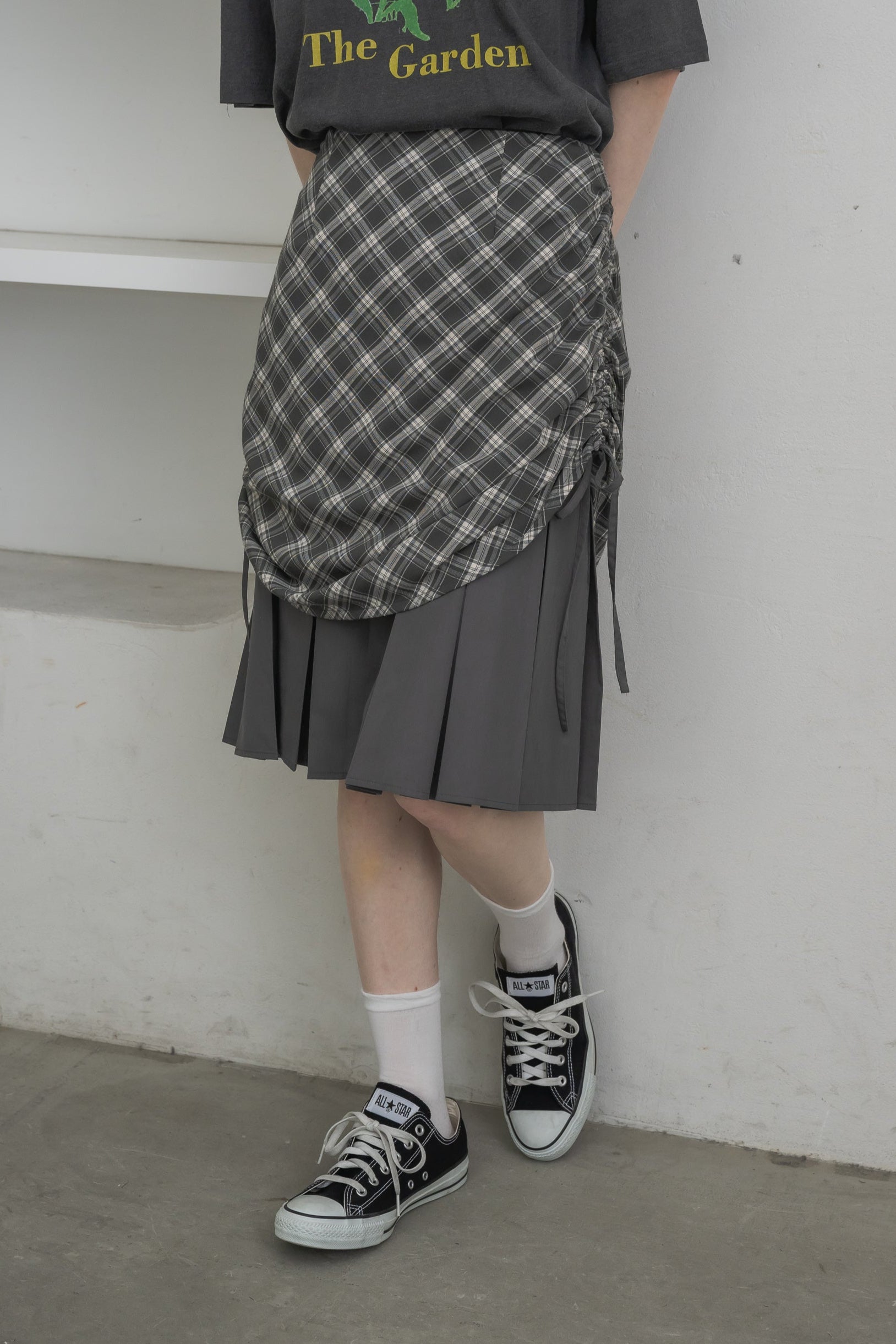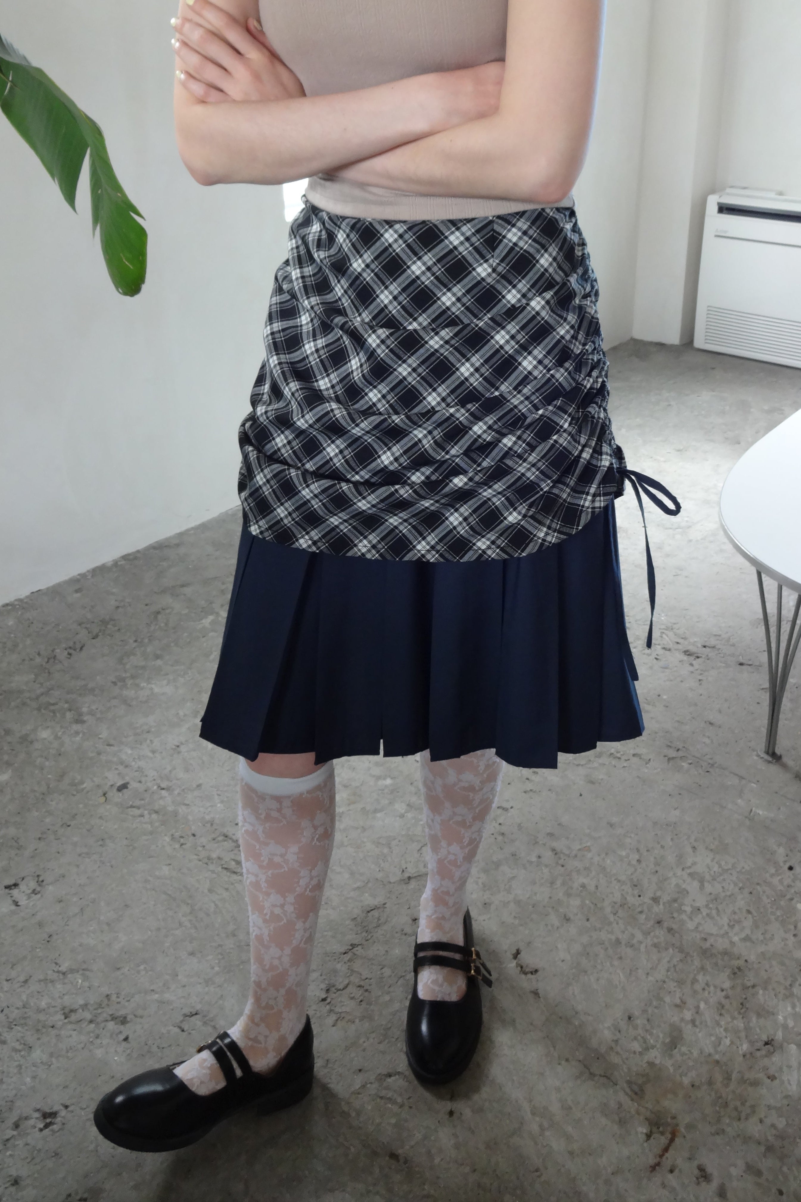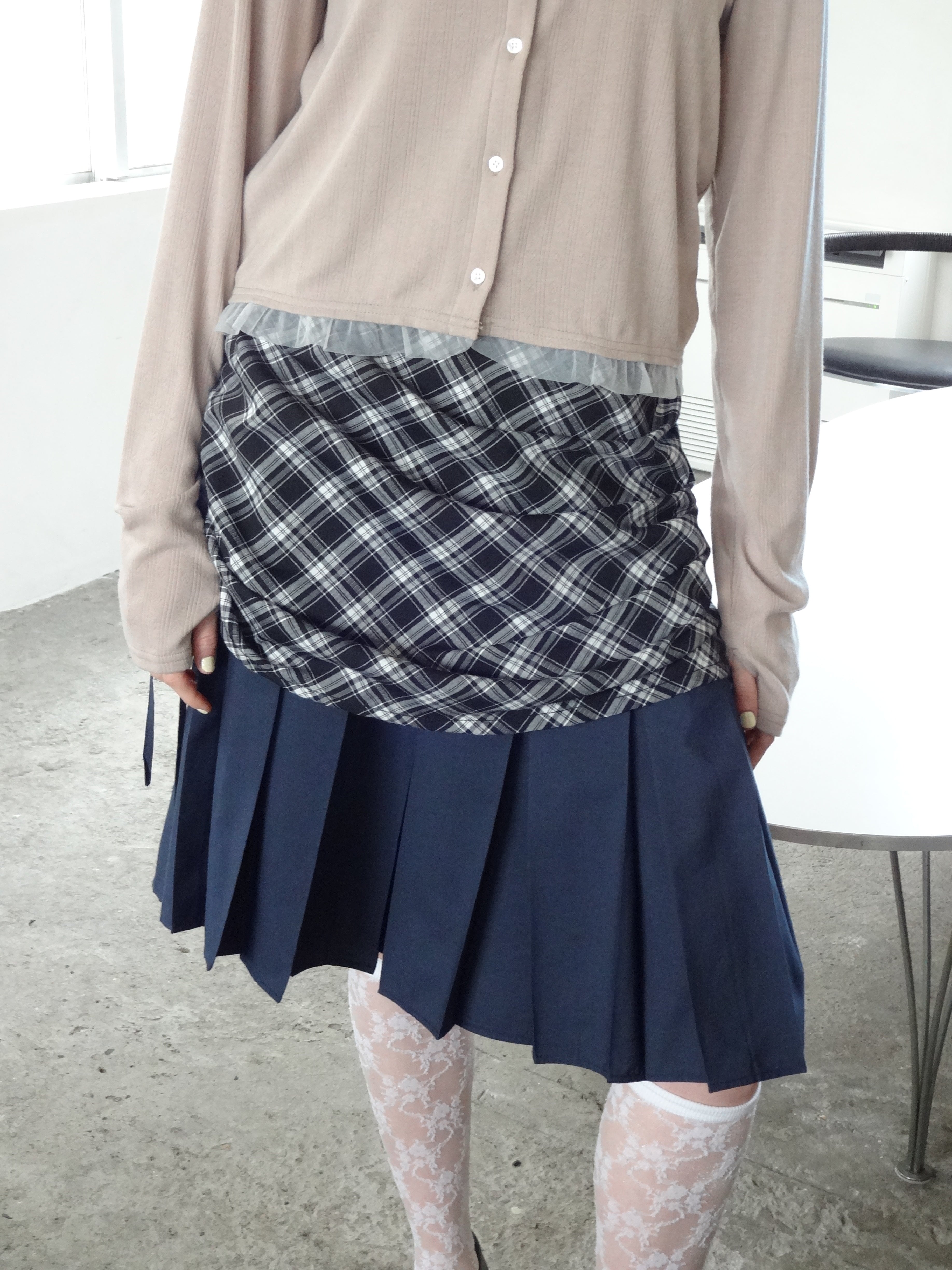 ・プリーツスカートの上にチェック柄スカートをレイヤードしたデザイン