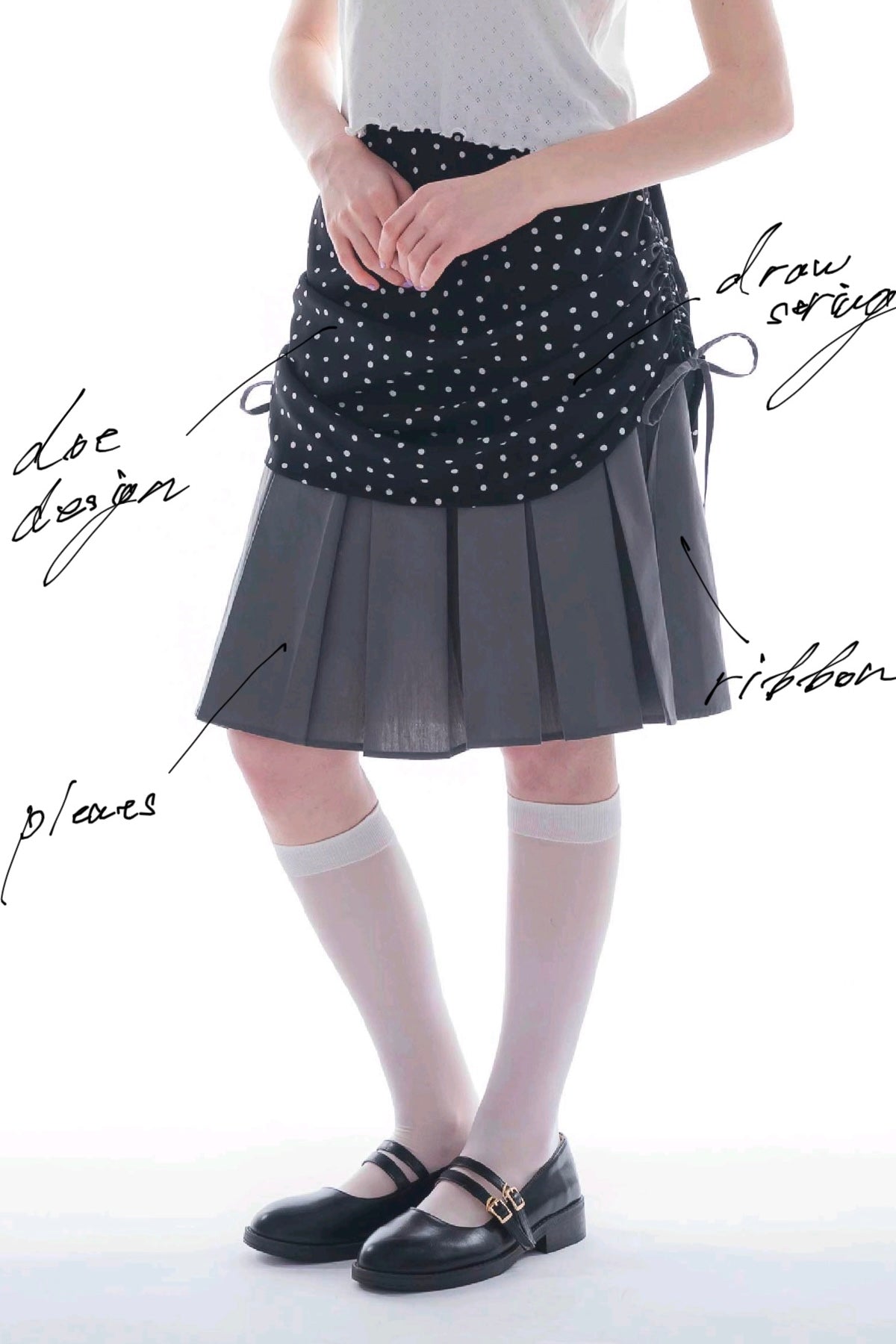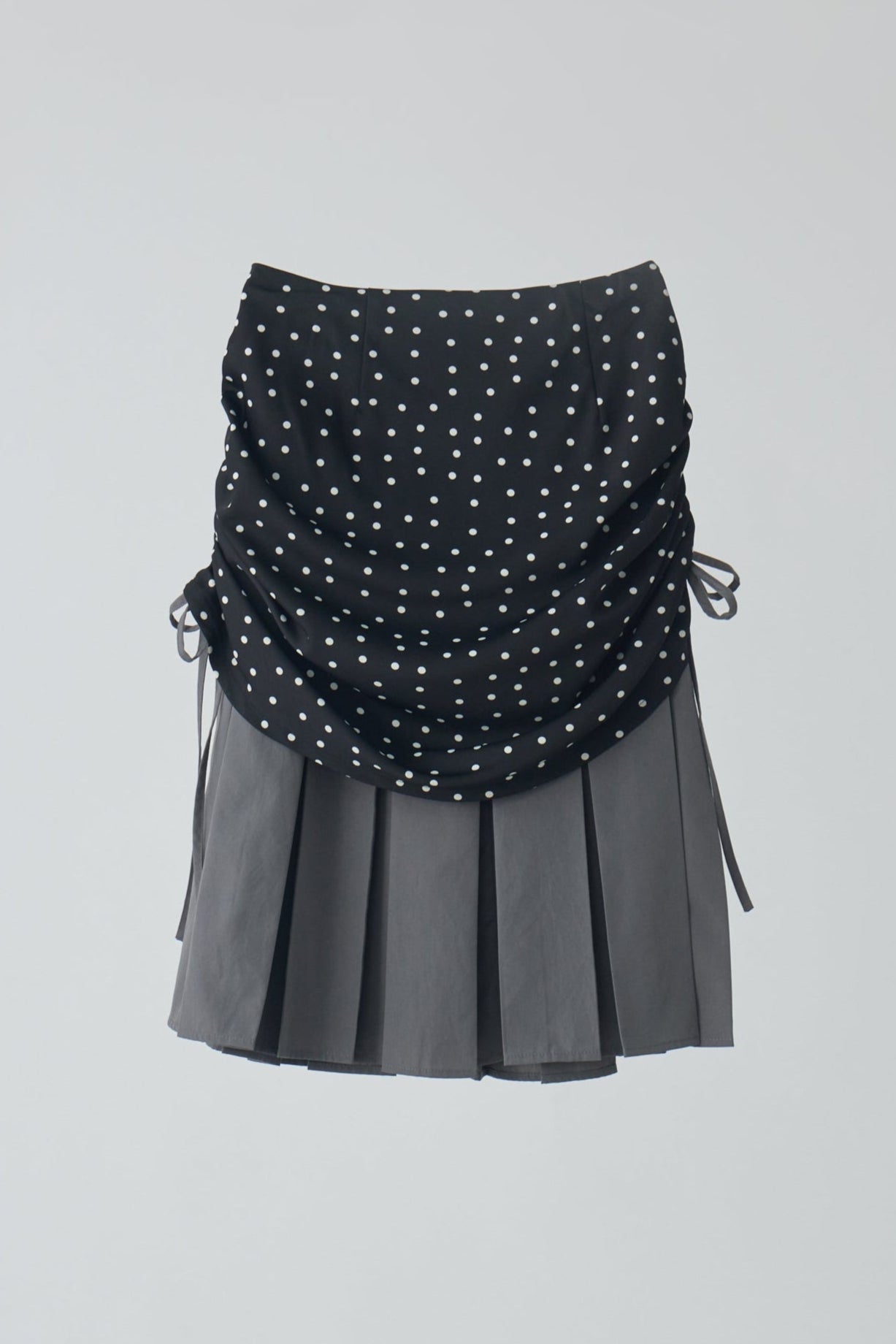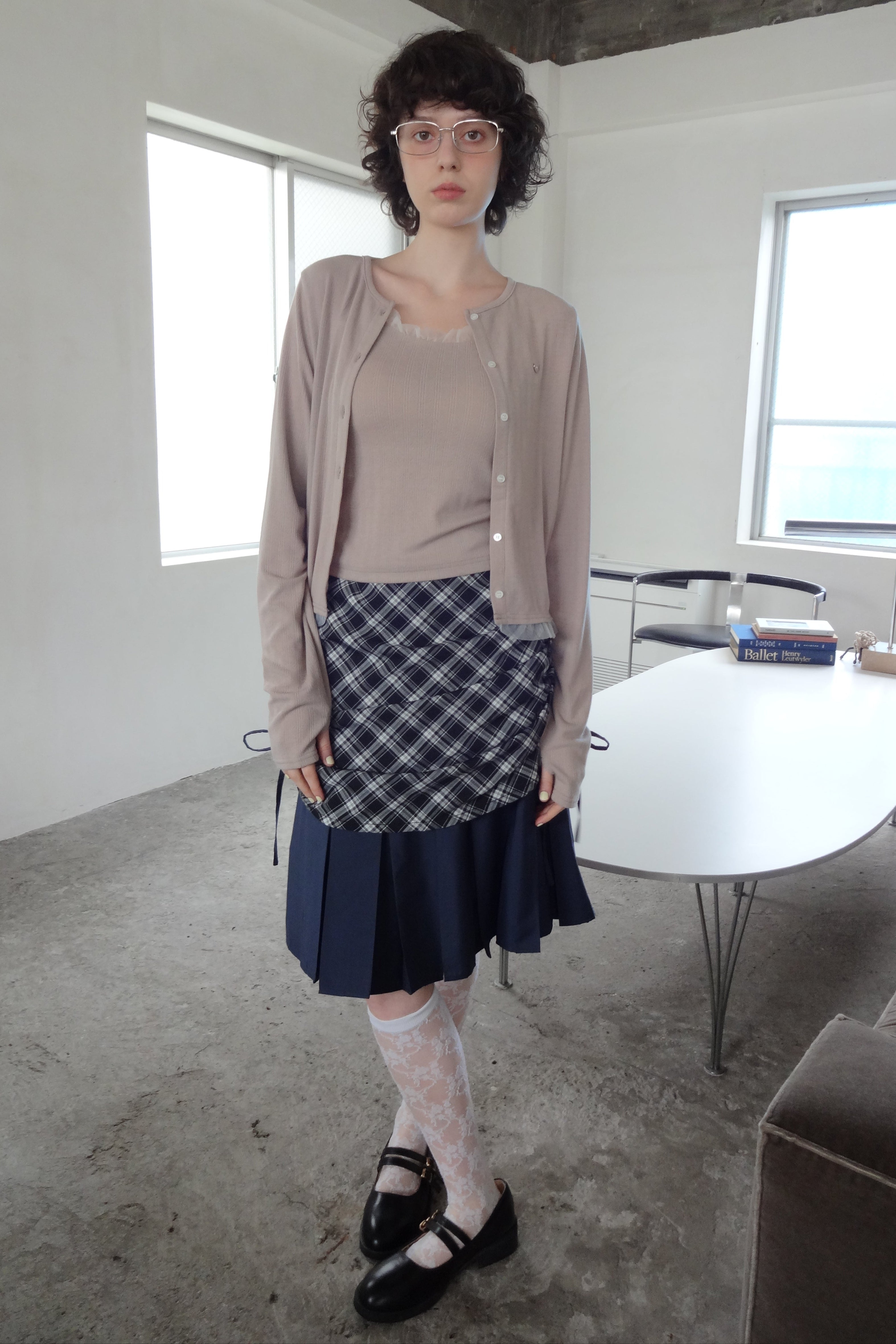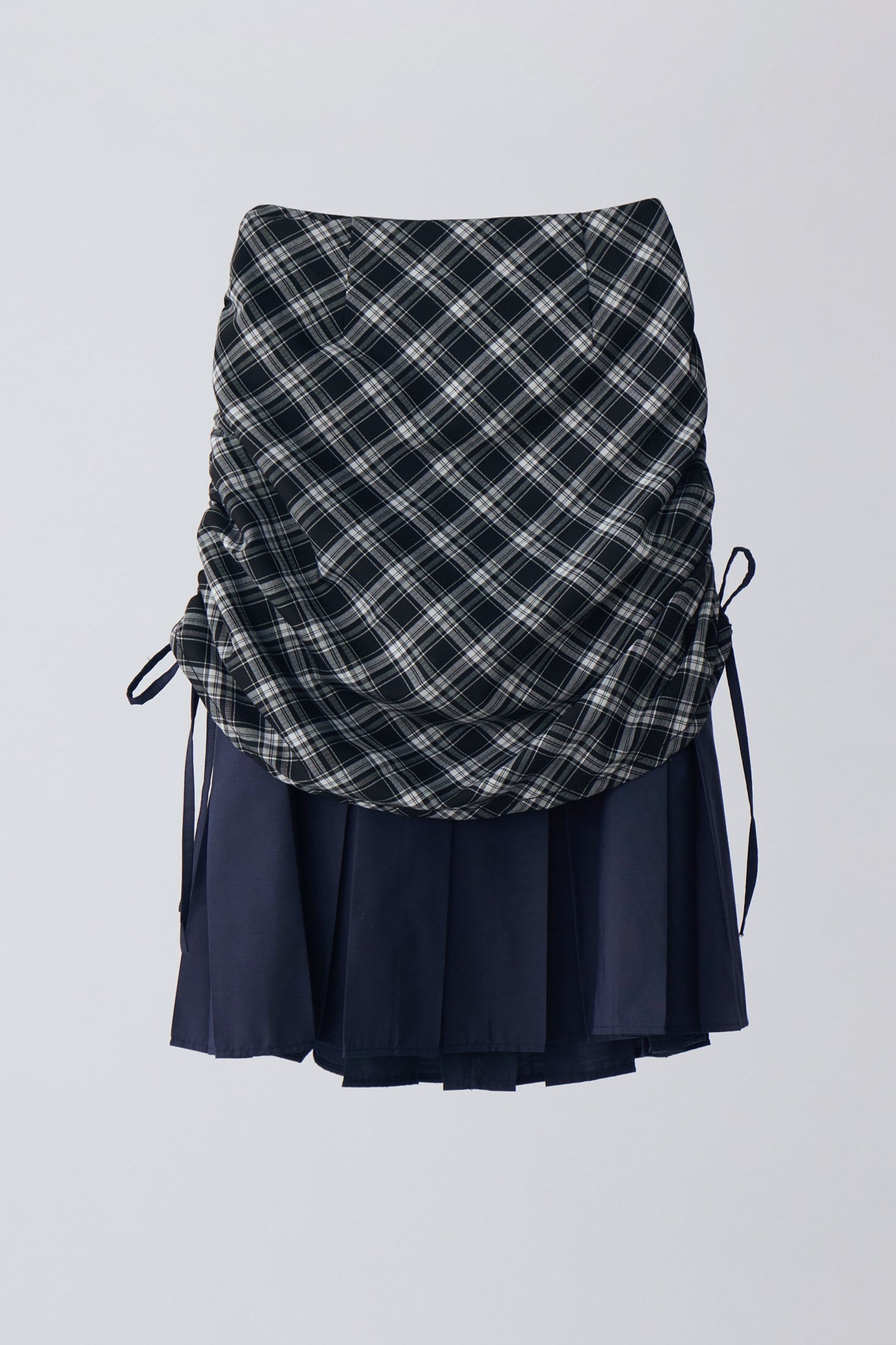 ・プリーツスカートの上にチェック柄スカートをレイヤードしたデザイン