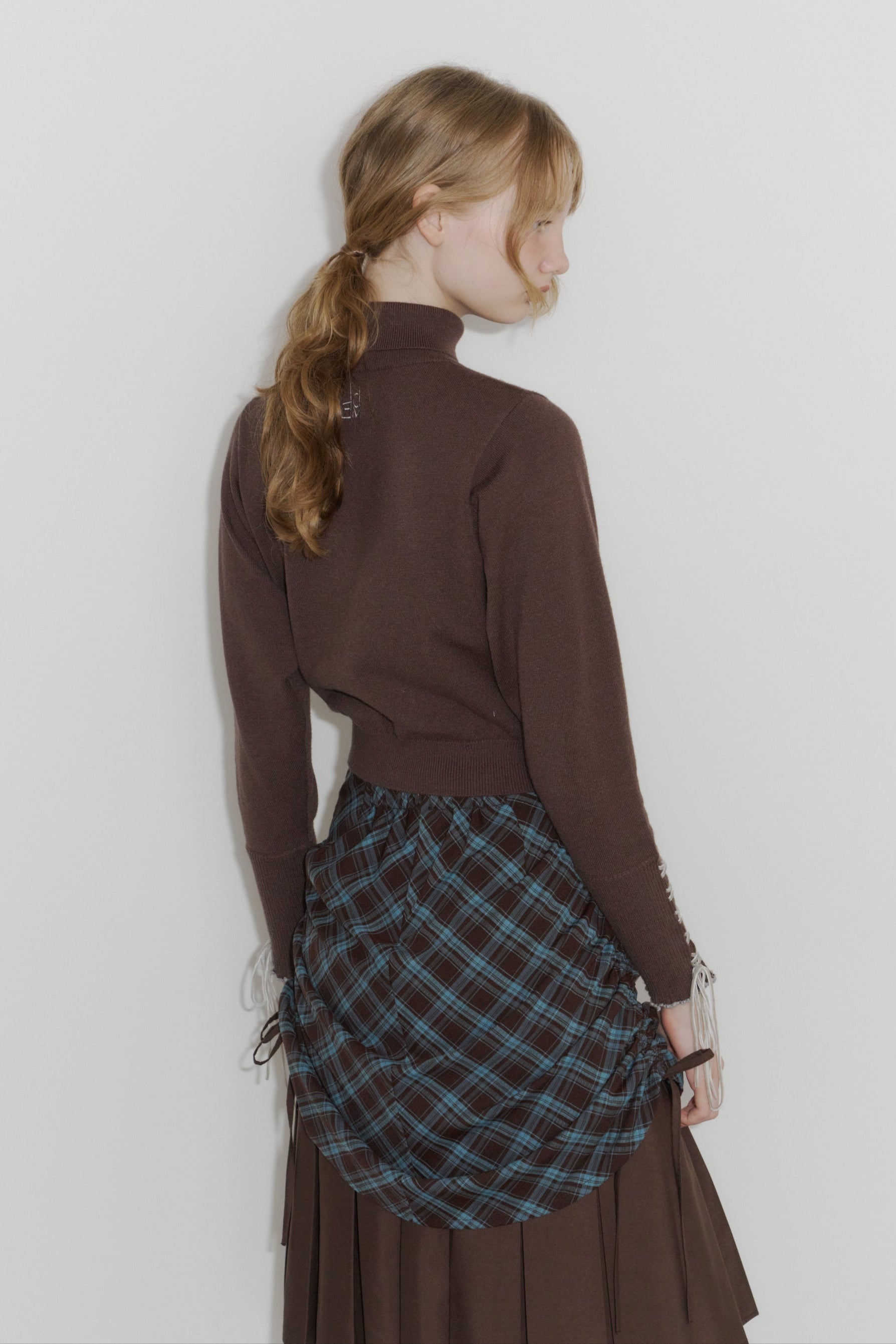 スタイリングによってドロストリボンを絞ってチェック部分を調整し、