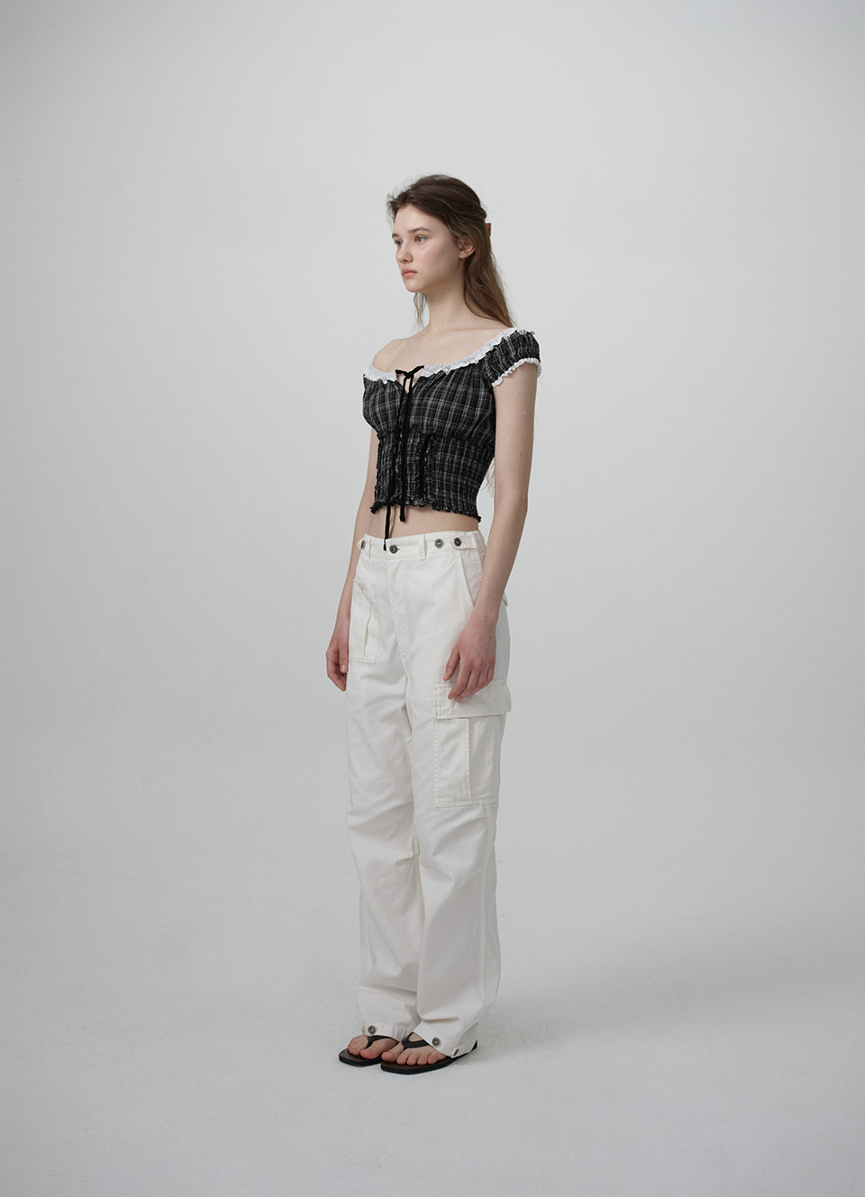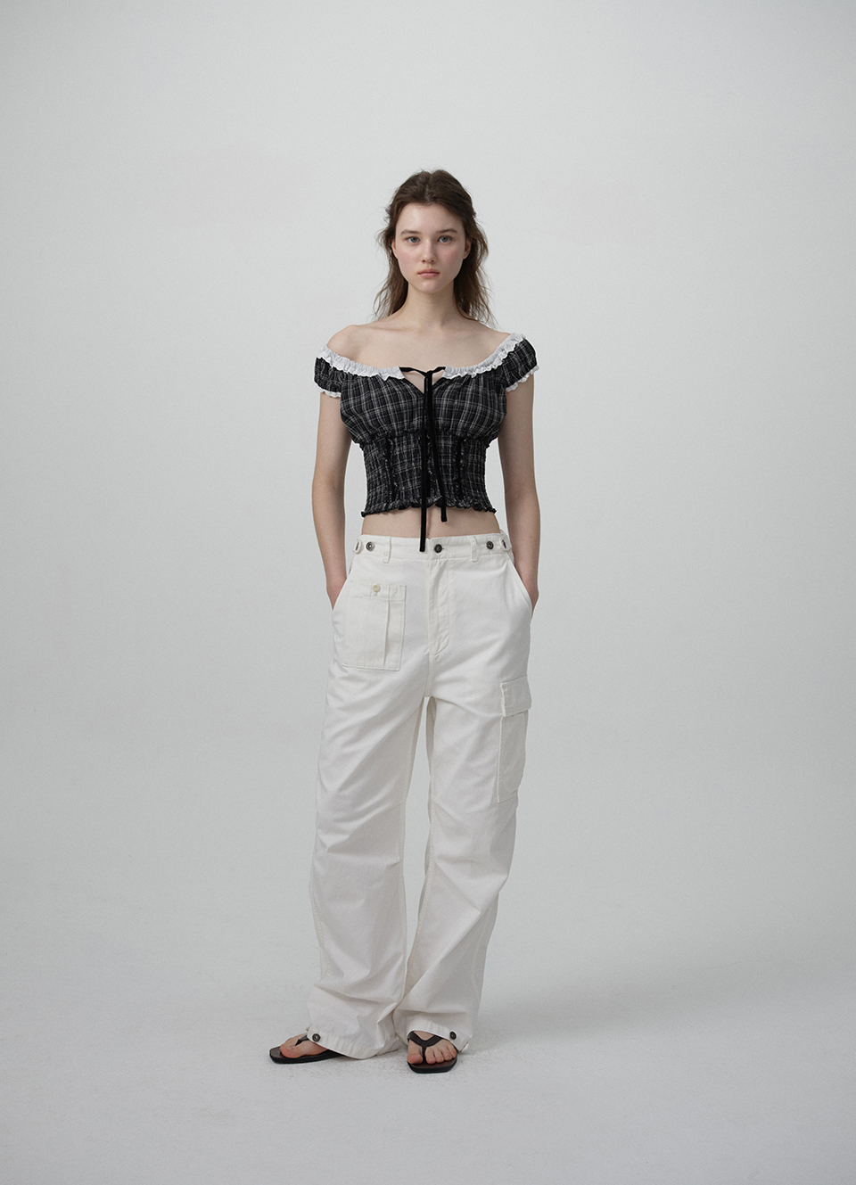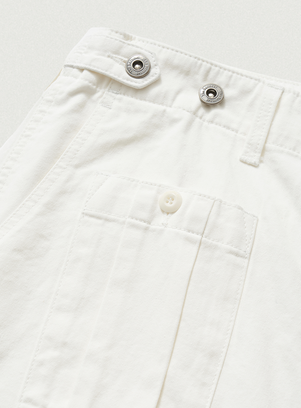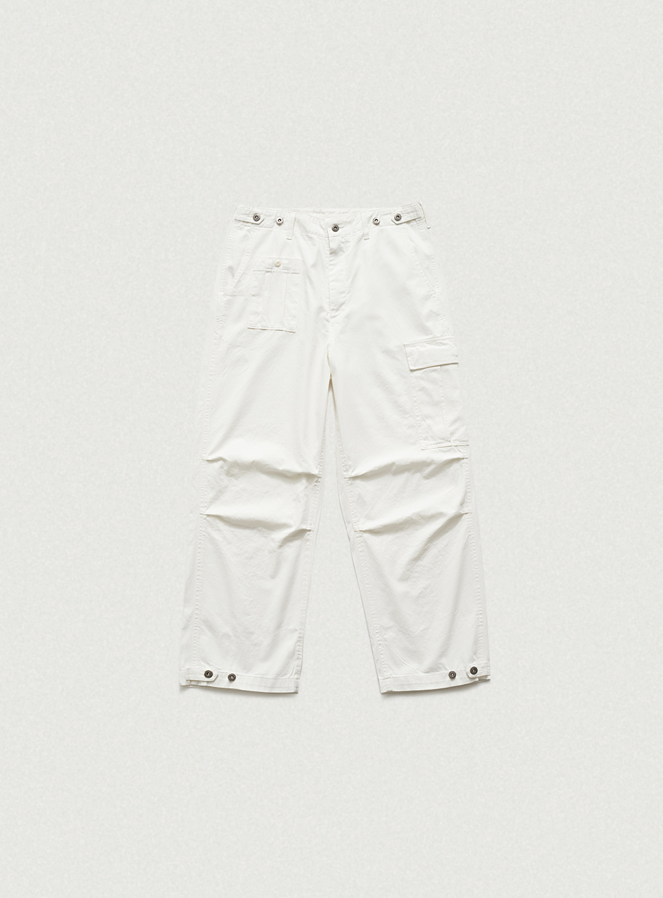 ウエストと裾を調節できるボタン、各種ポケットなど実用的なディテール
